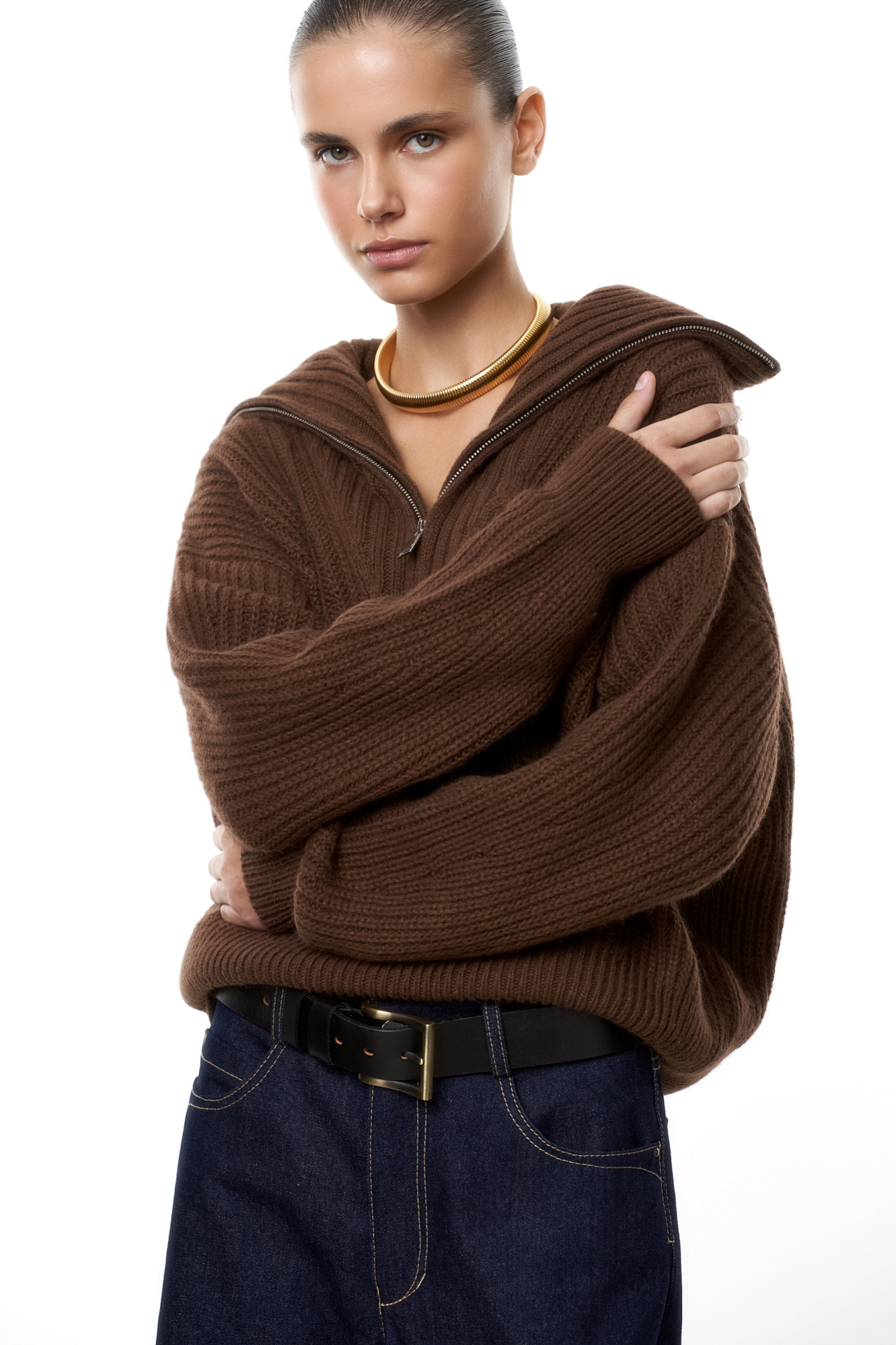 Трикотажный джемпер с шерстью альпака. Модель свободного силуэта со спущенной линией плеча и высоким воротом. Застежка на молнию, края изделия в рубчик.
