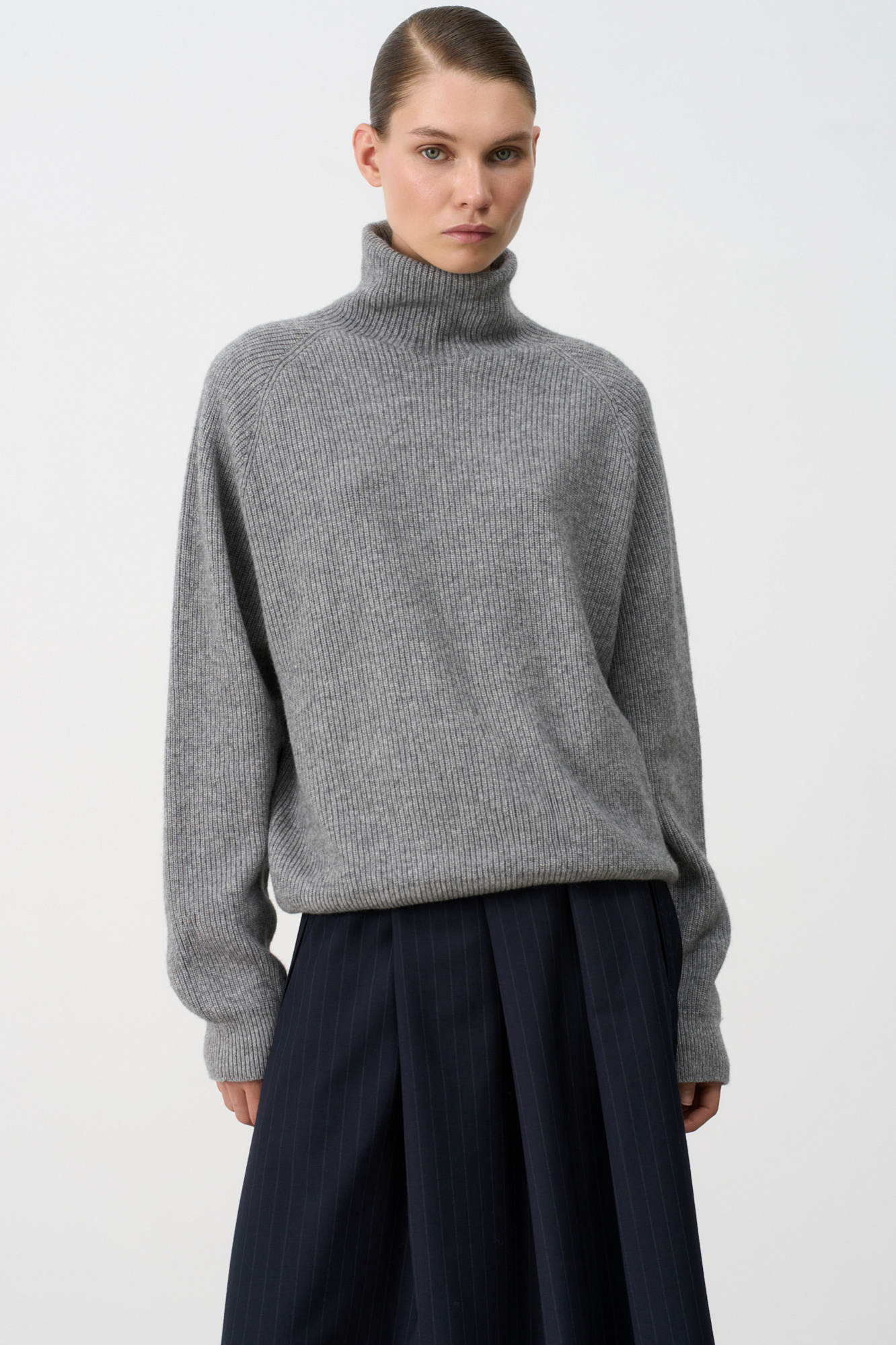 Трикотажный джемпер из шерсти и кашемира. Модель свободного силуэта с аккуратным воротником-стойкой и рукавом формы реглан. Низ изделия и манжеты рукавов выполнены на резинке.