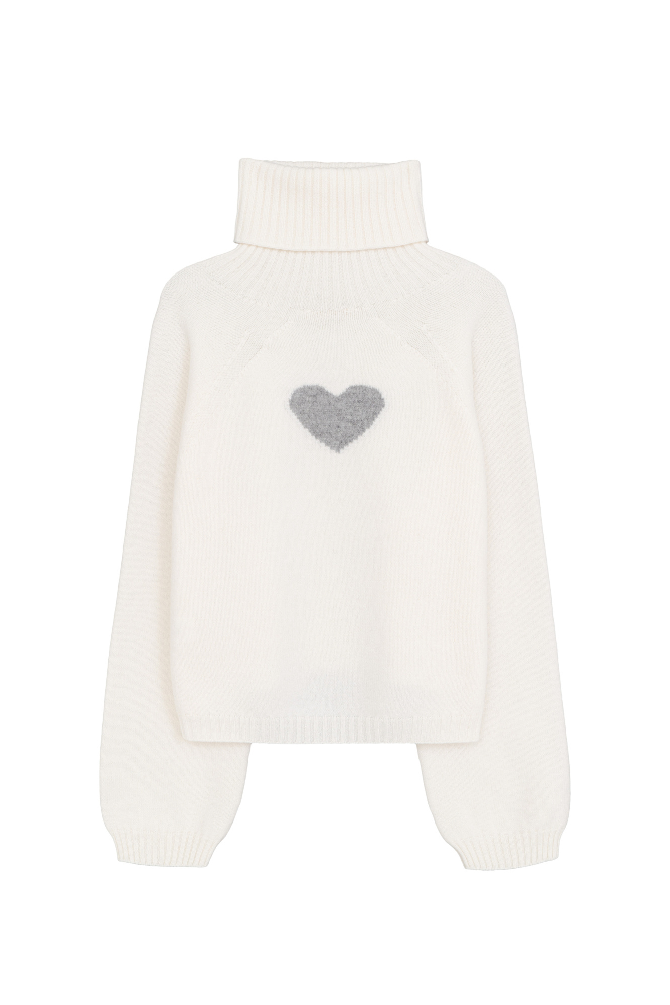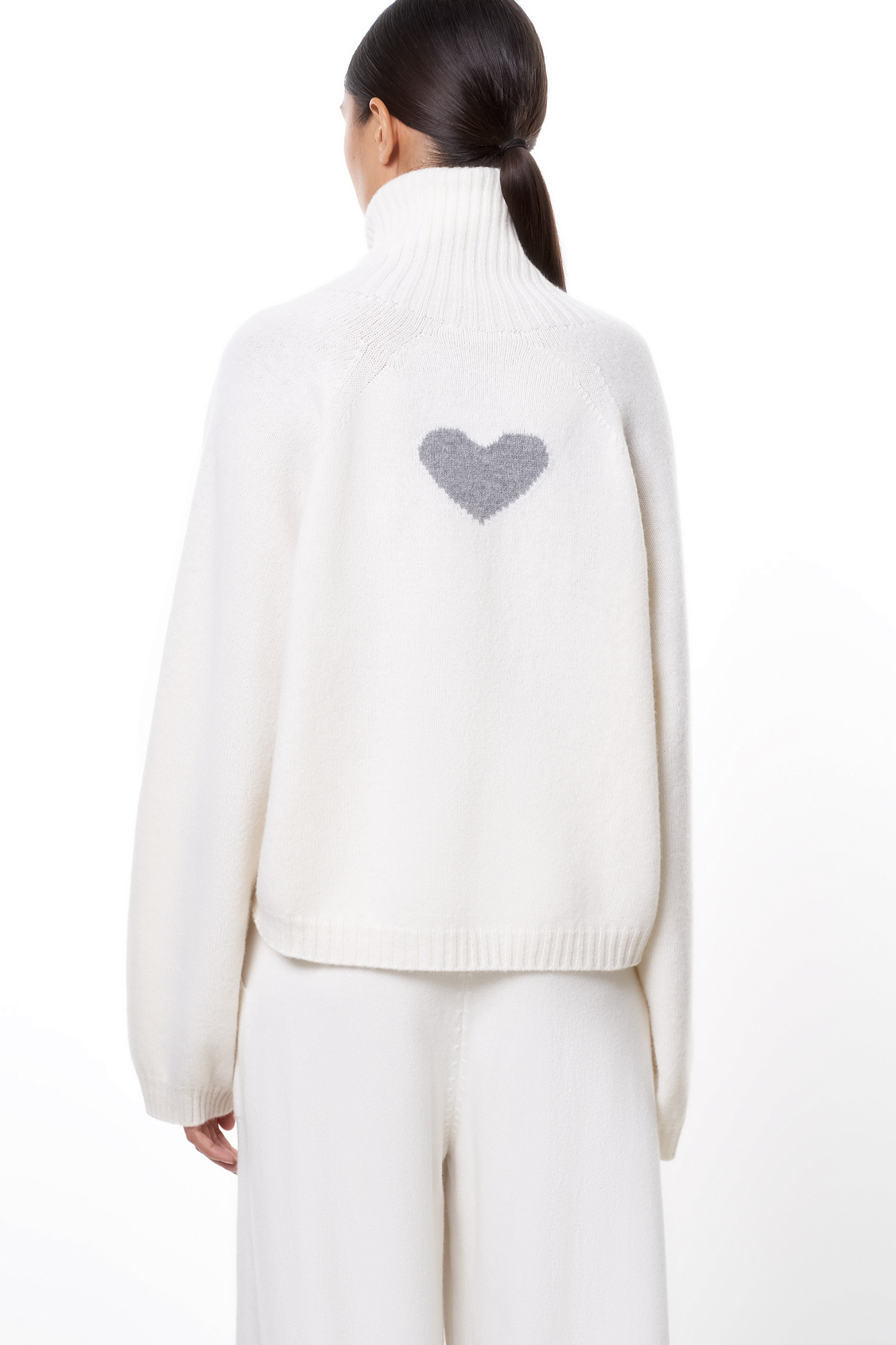 Трикотажный джемпер из шерсти с добавлением кашемира. Модель с высоким воротником в рубчик, спущенной линией плеча и жаккардовым рисунком в виде сердца на спине.