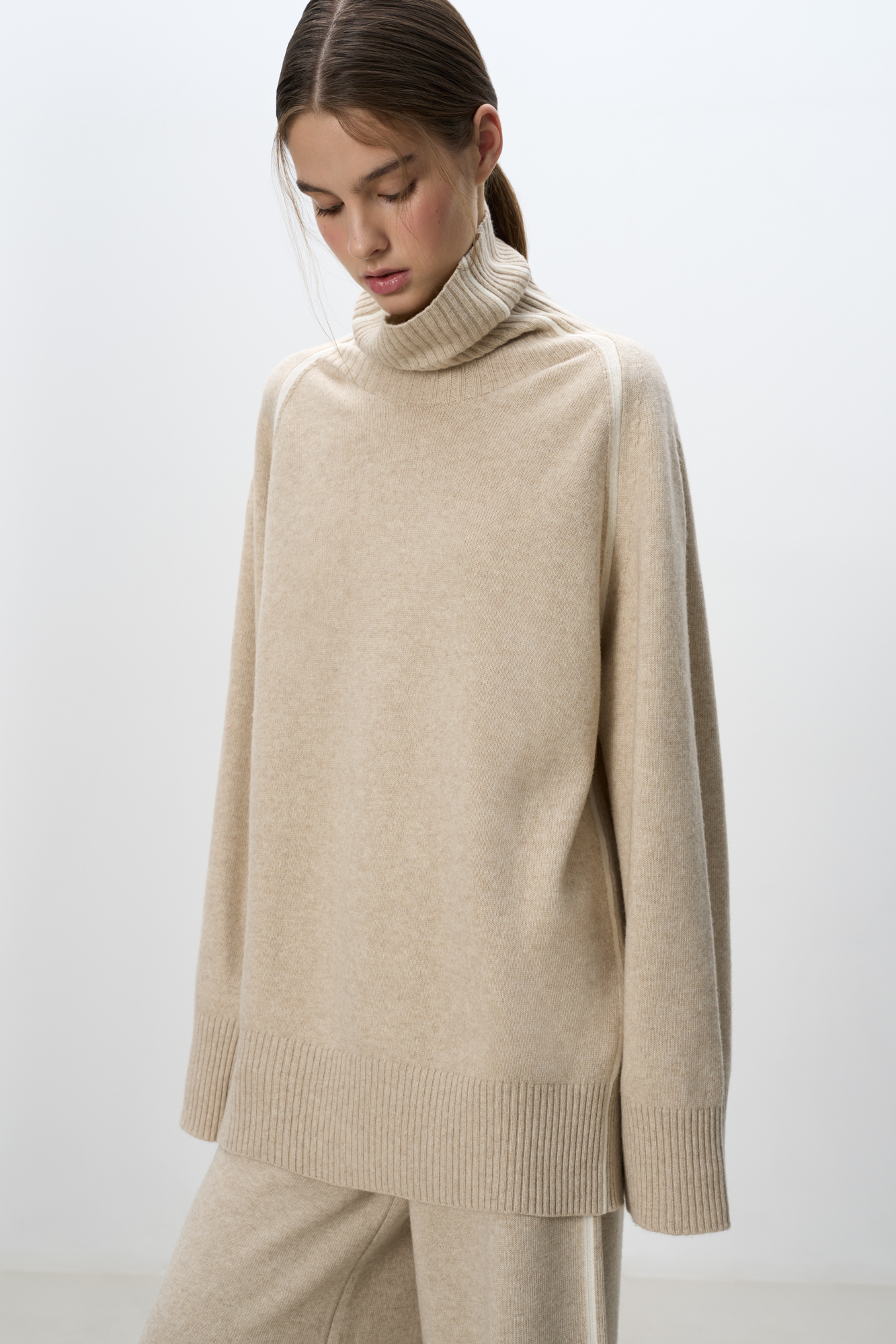 Трикотажный джемпер из смесовой шерсти. Модель свободного силуэта с лампасами, высоким воротом и спущенной линией плеч.