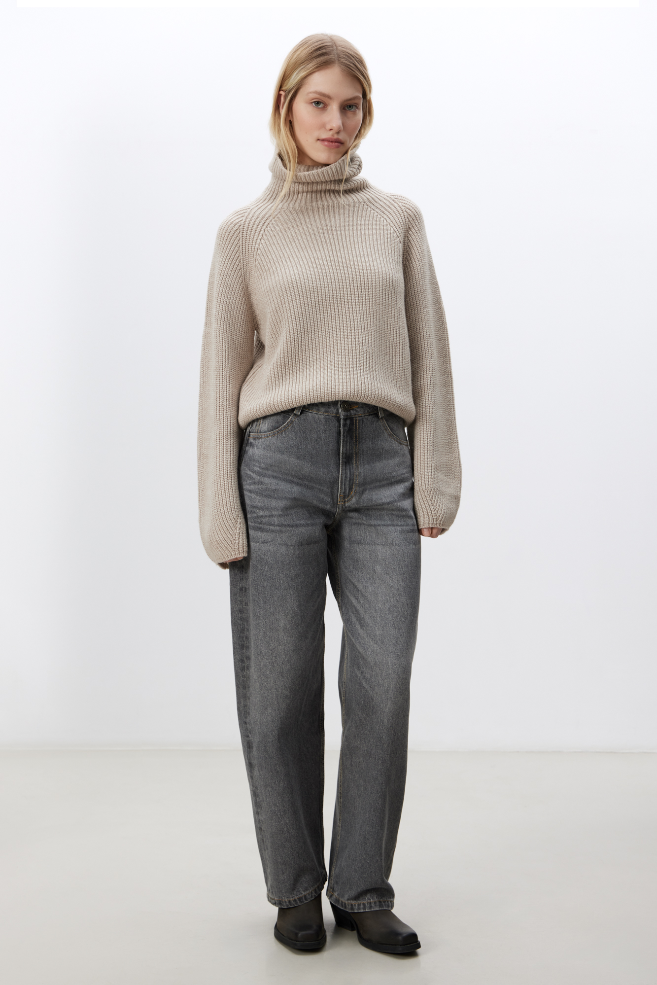 Трикотажный укороченный джемпер из шерсти альпака в рубчик. Модель свободного силуэта с высоким воротом