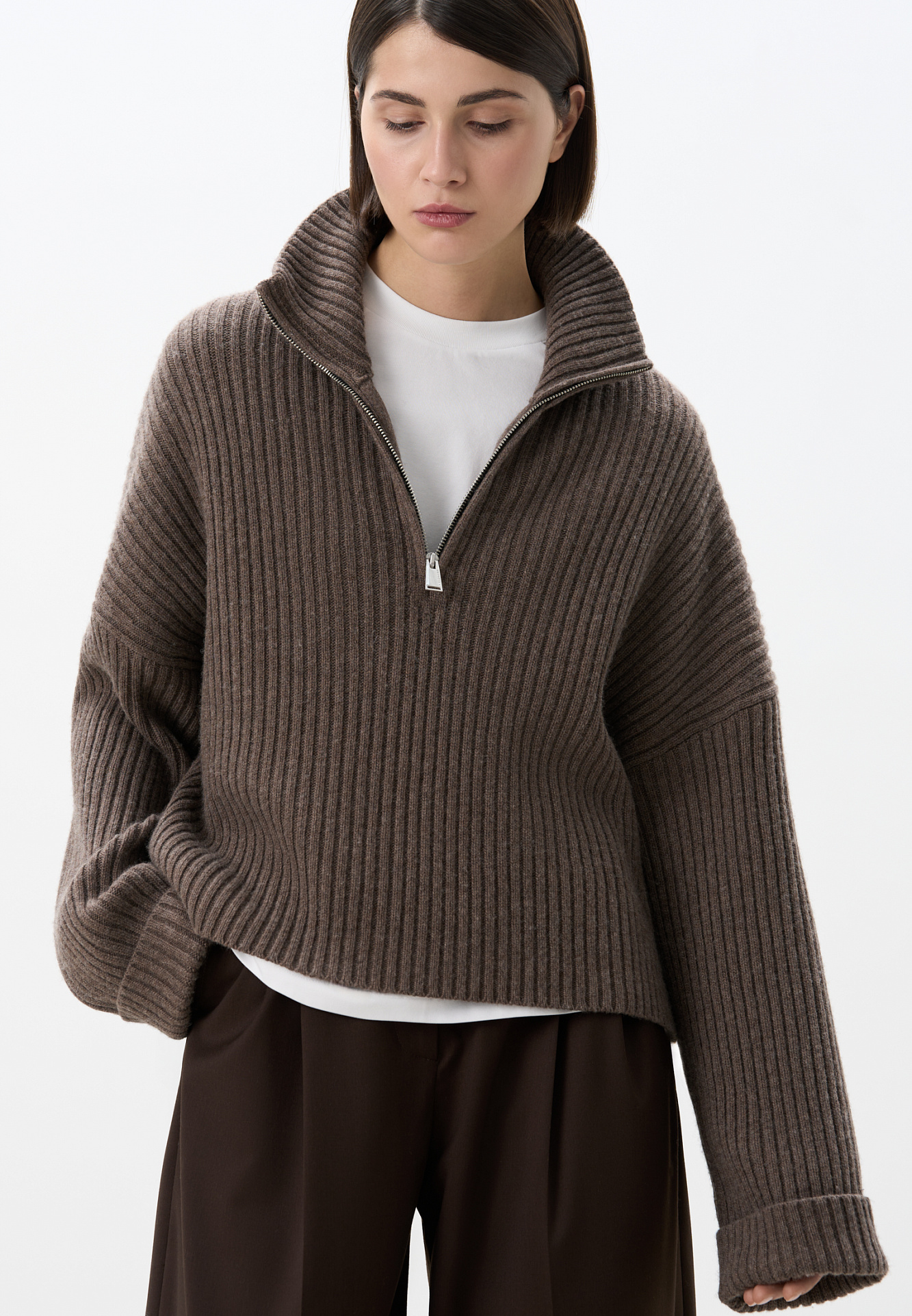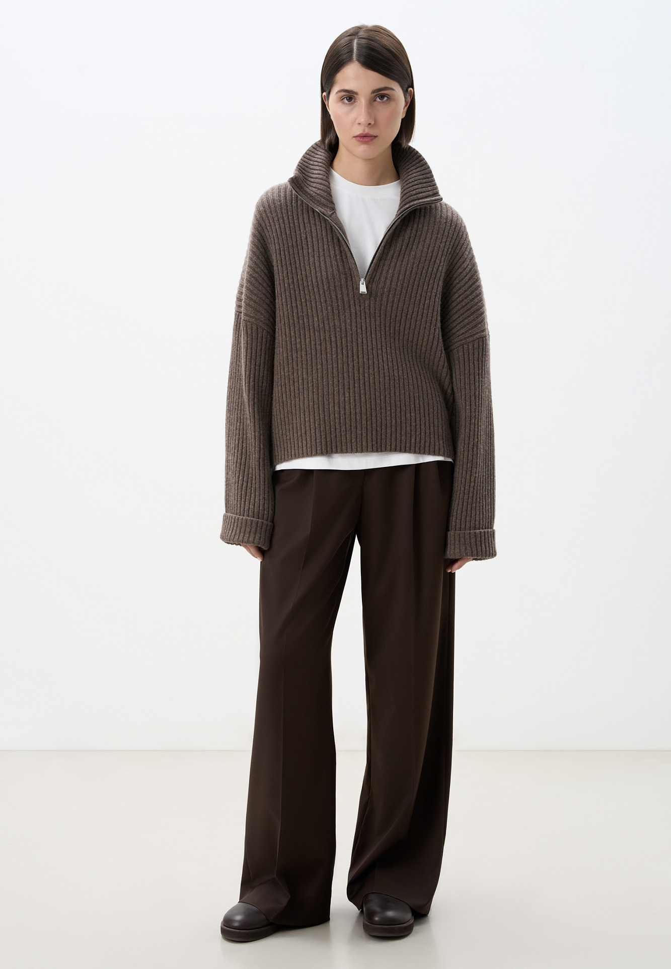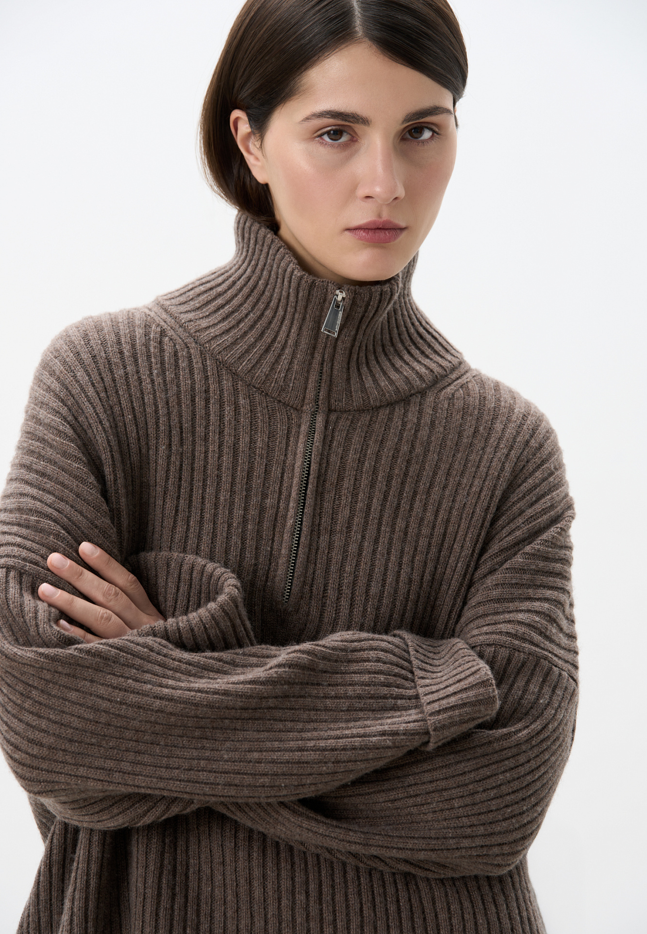 Джемпер из смесовой шерсти с добавлением кашемира. Модель свободного силуэта, со спущенной линией плеч, отворотами на манжетах и высоким воротником-стойкой с застежкой на молнию.