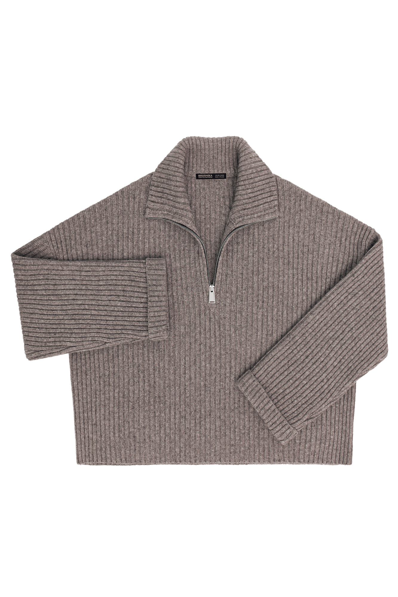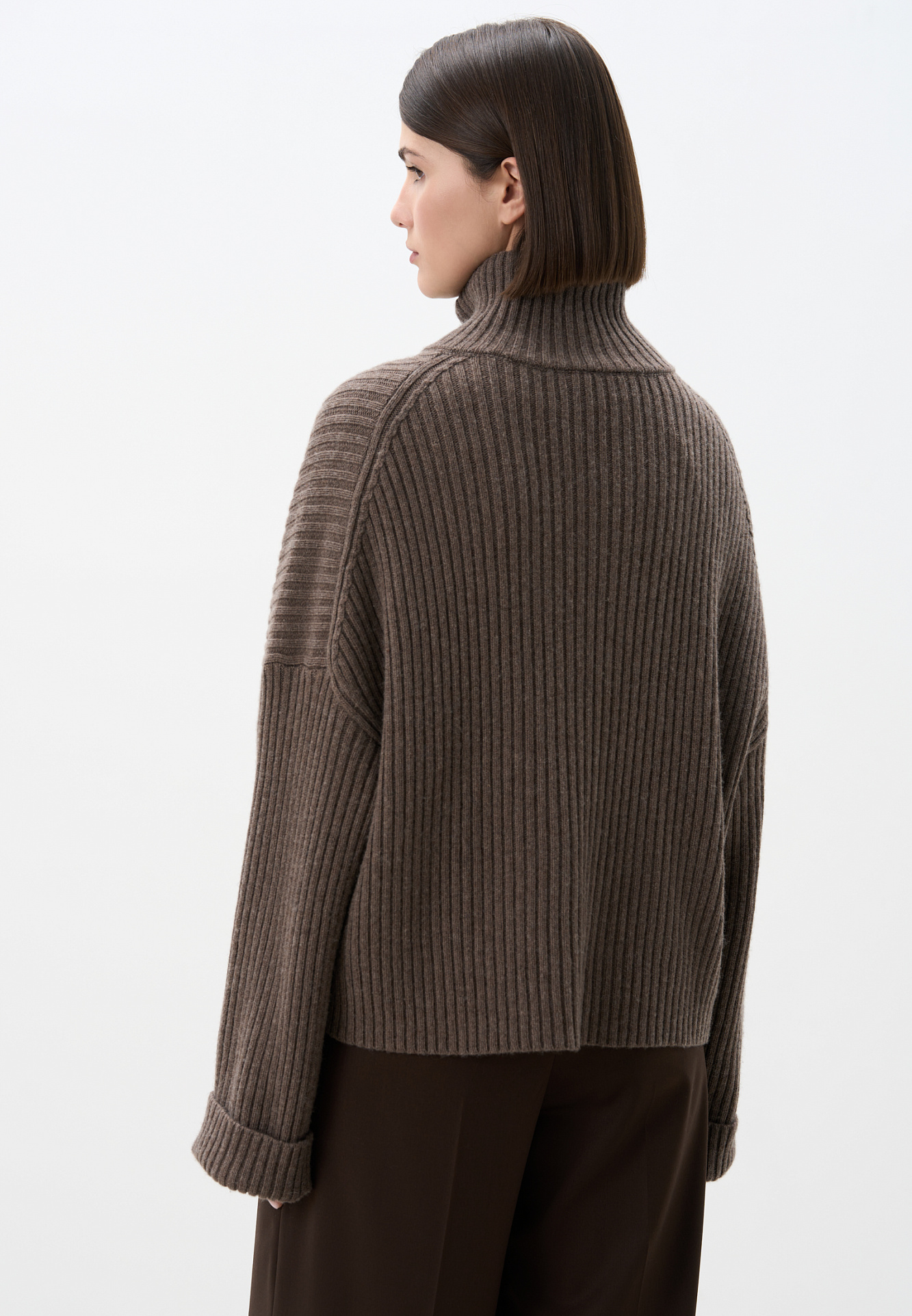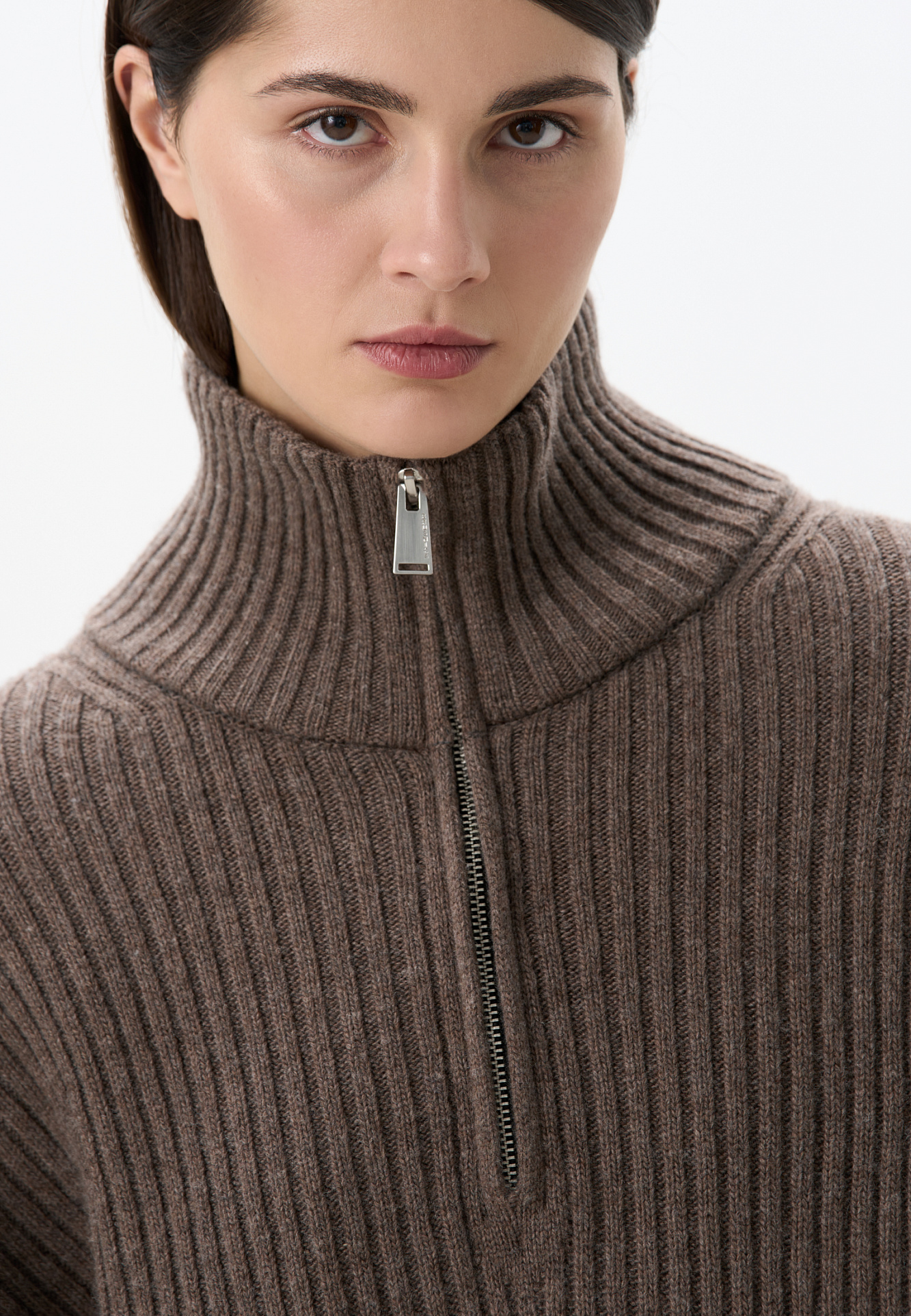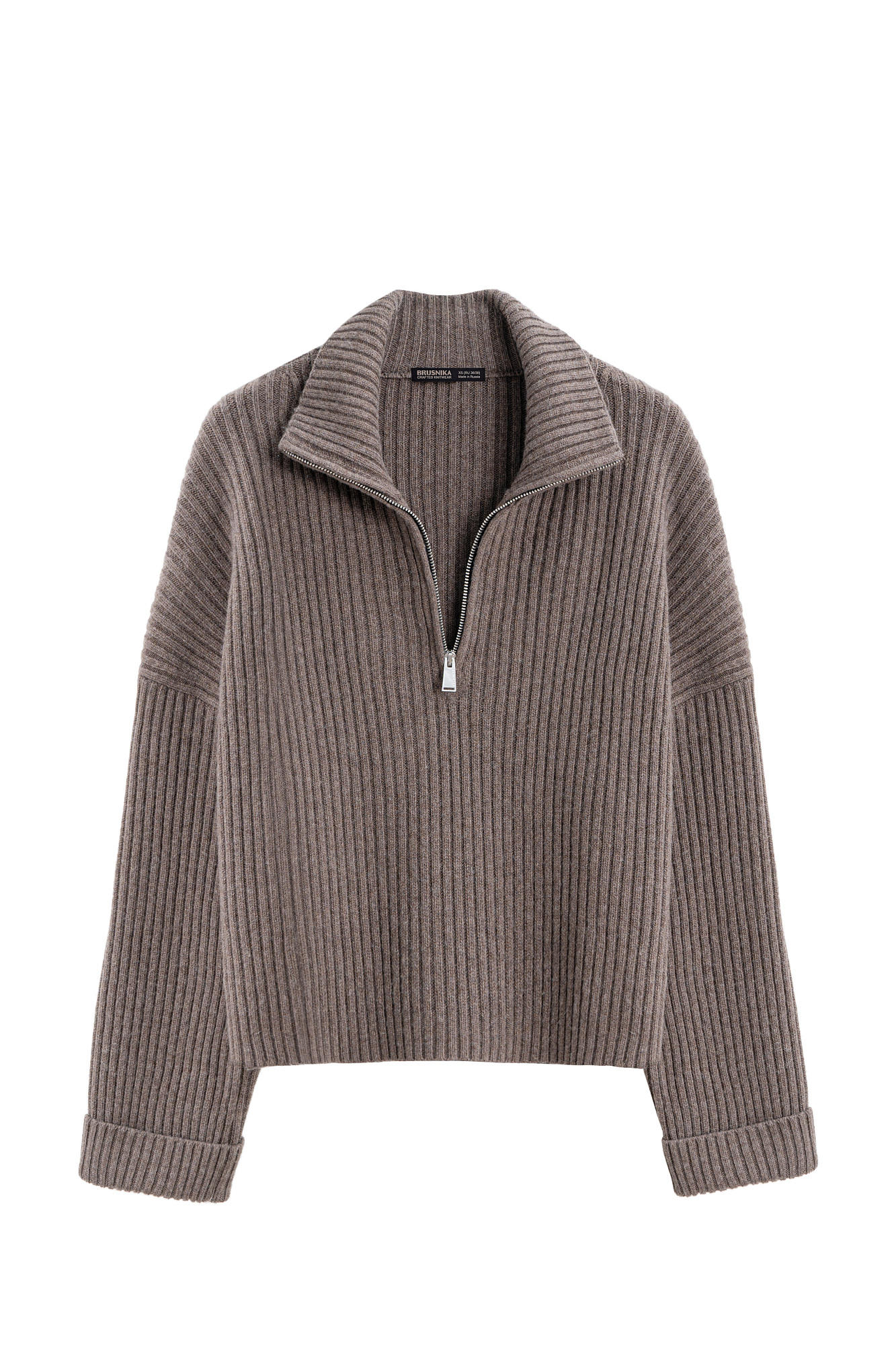 Джемпер из смесовой шерсти с добавлением кашемира. Модель свободного силуэта, со спущенной линией плеч, отворотами на манжетах и высоким воротником-стойкой с застежкой на молнию.