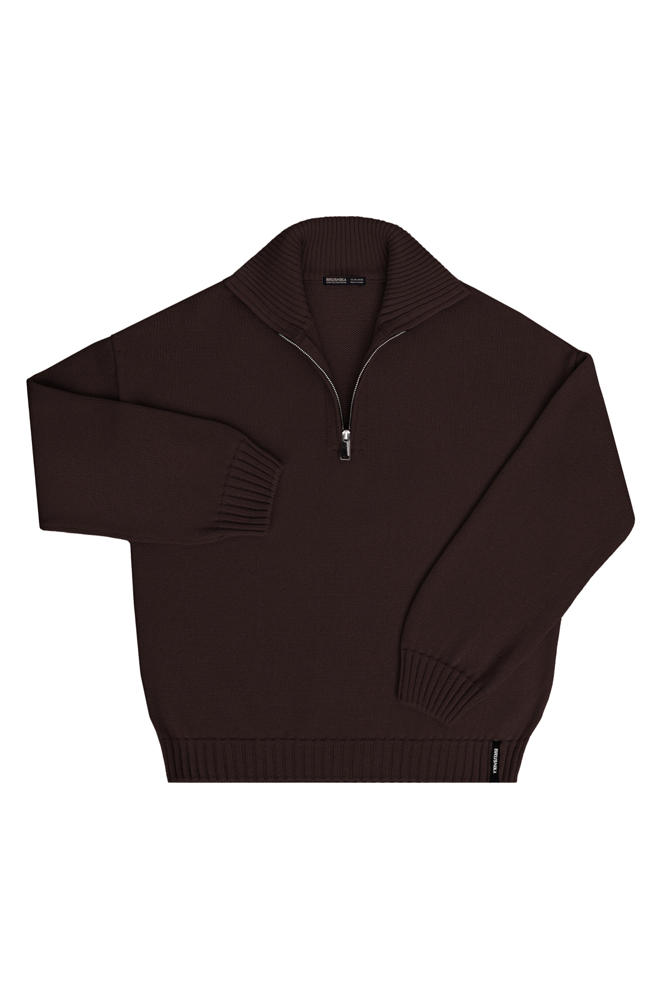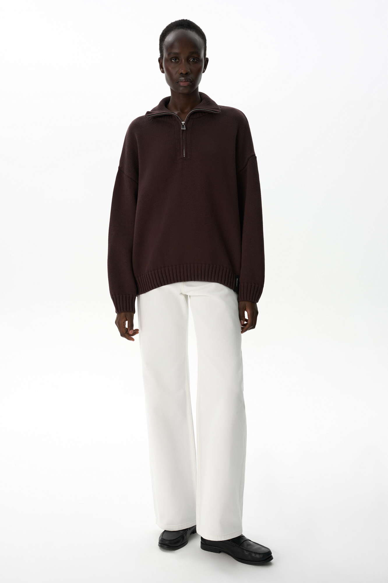 Трикотажный джемпер из 100% хлопка с воротником-стойкой. Модель свободного силуэта со спущенной линией плеча. Застежка на молнию, манжеты и низ изделия выполнены в рубчик.