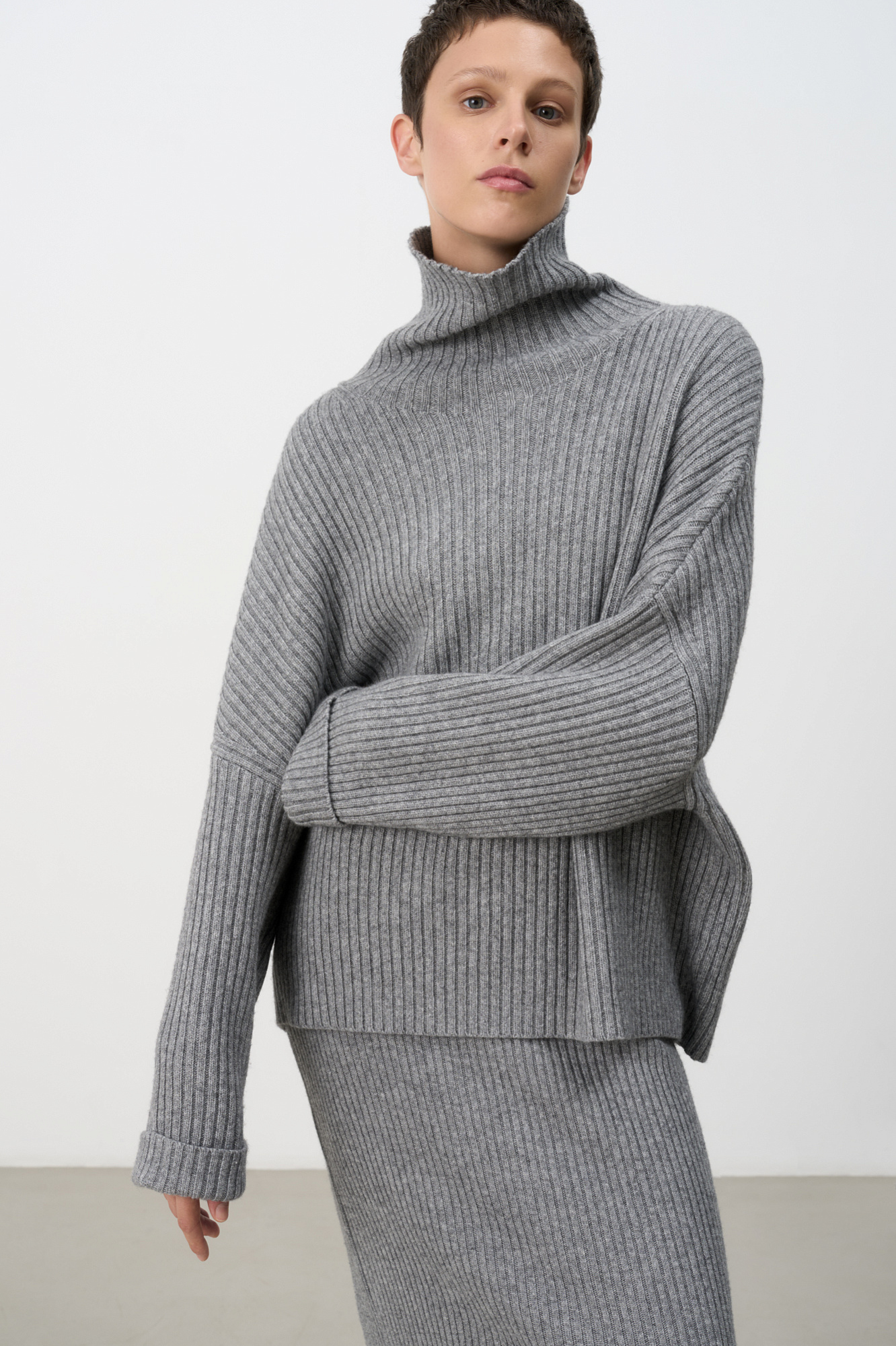 Широкий трикотажный джемпер из шерсти с добавлением кашемира. Модель свободного силуэта, со спущенной линией плеча, отворотами на манжетах и высоким свободным воротником.