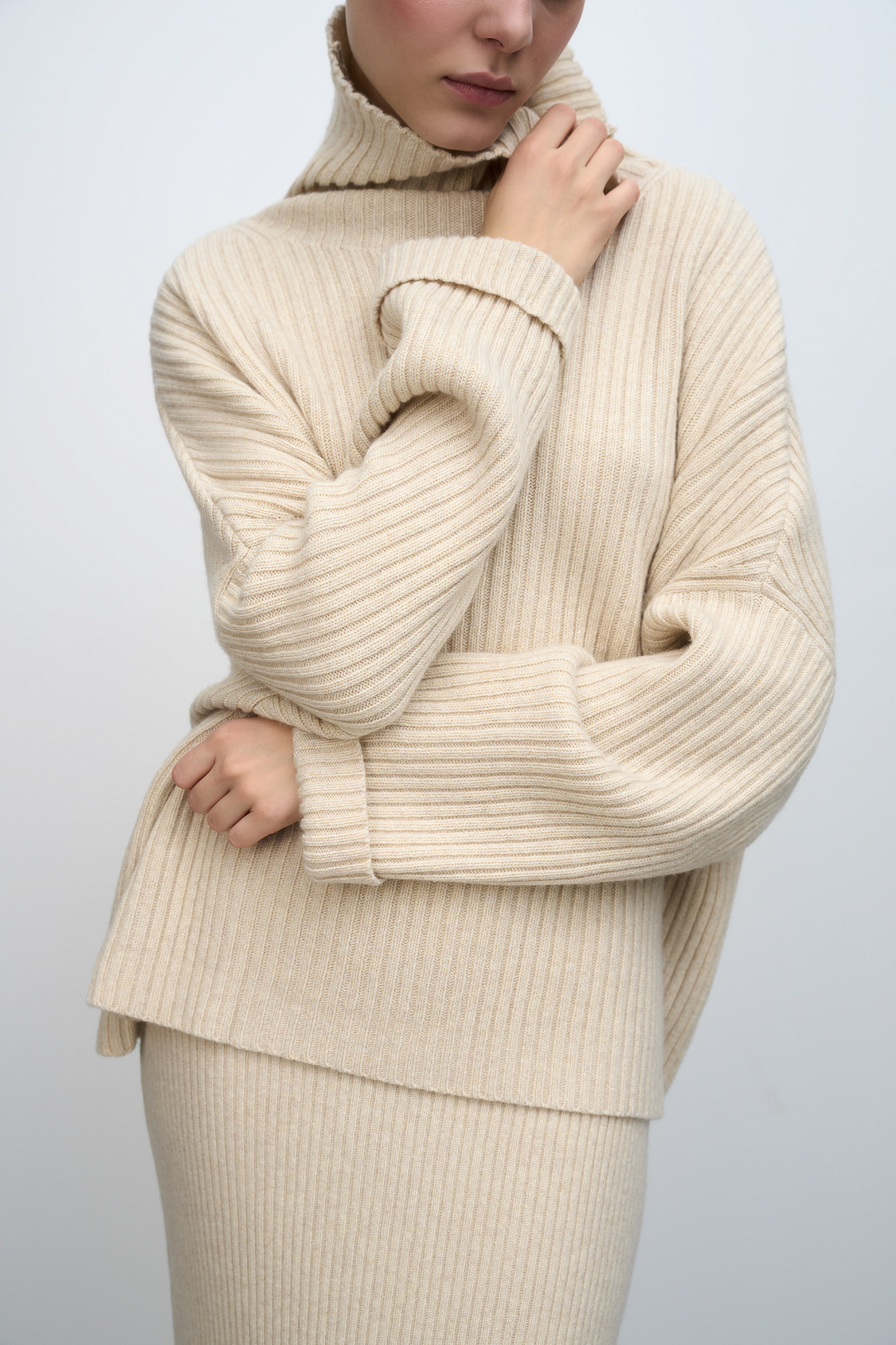 Широкий трикотажный джемпер из шерсти с добавлением кашемира. Модель свободного силуэта, со спущенной линией плеча, отворотами на манжетах и высоким свободным воротником.