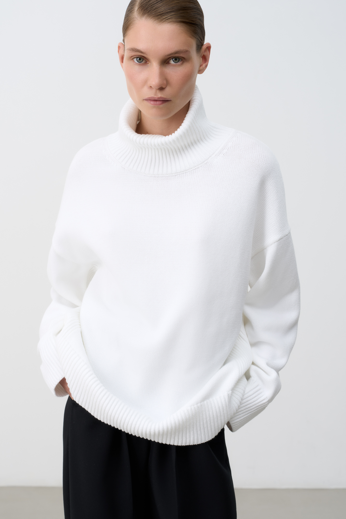 Трикотажный джемпер из 100% хлопка. Модель свободного силуэта со спущенной линией плеча и высоким объемным воротом.
