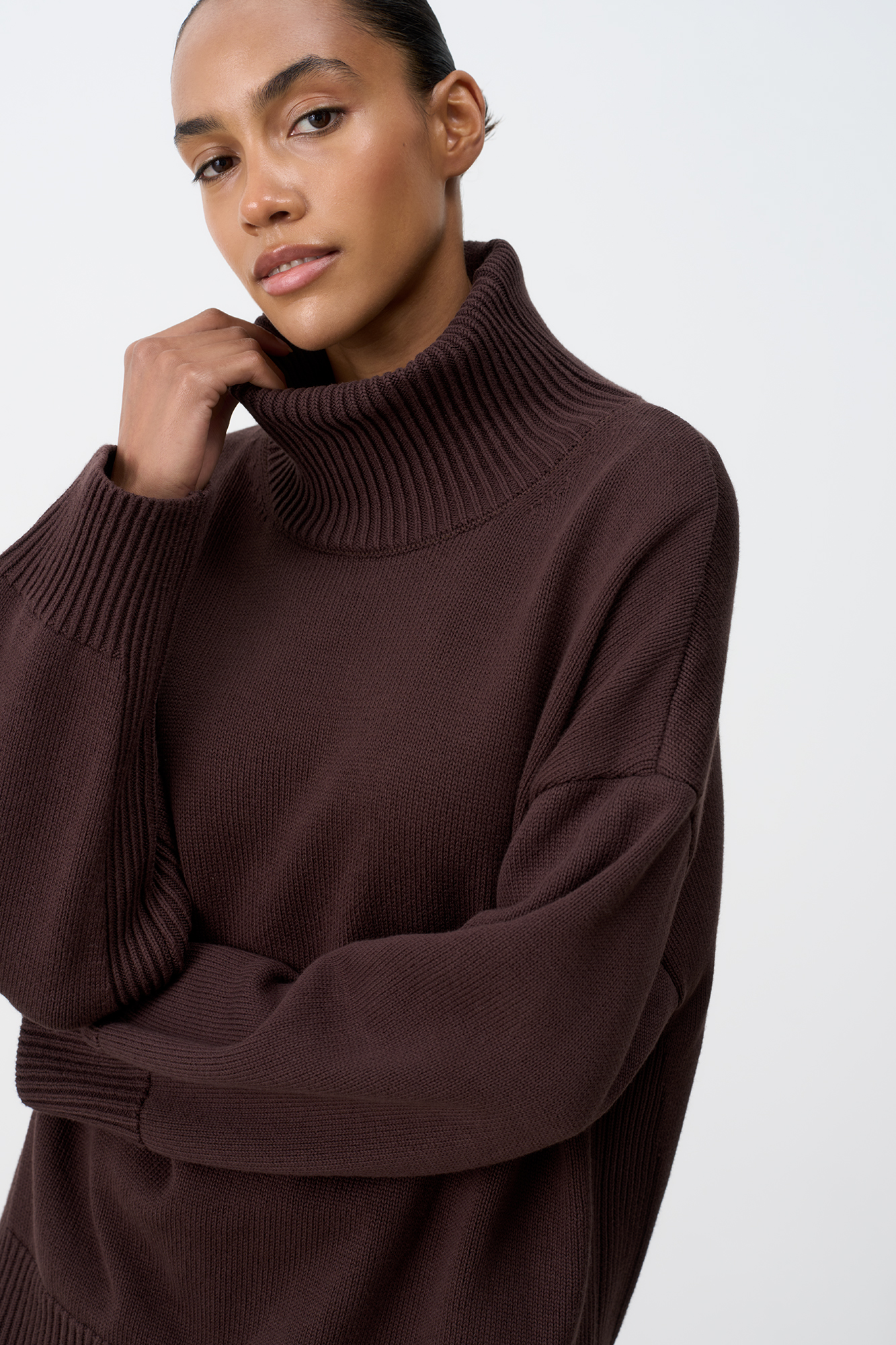 Трикотажный джемпер из 100% хлопка. Модель свободного силуэта со спущенной линией плеча и высоким объемным воротом.