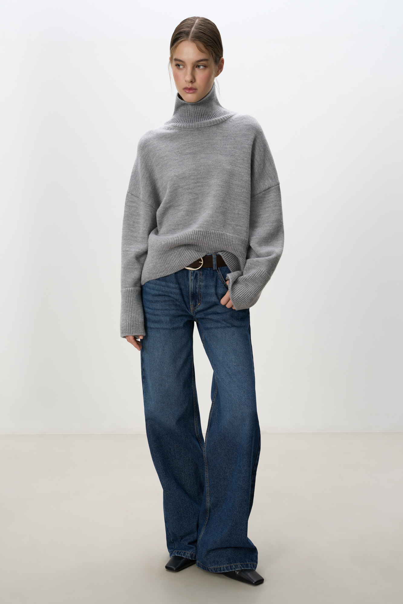Трикотажный джемпер с высоким воротом. Модель свободного силуэта со спущенной линией плеча. Края изделия в рубчик.