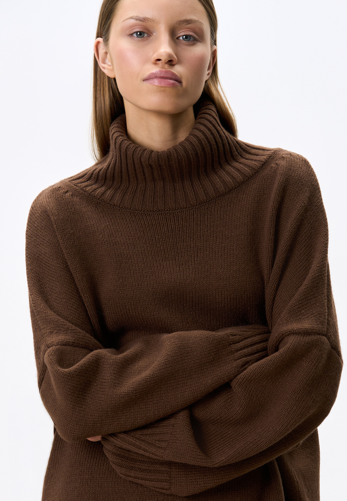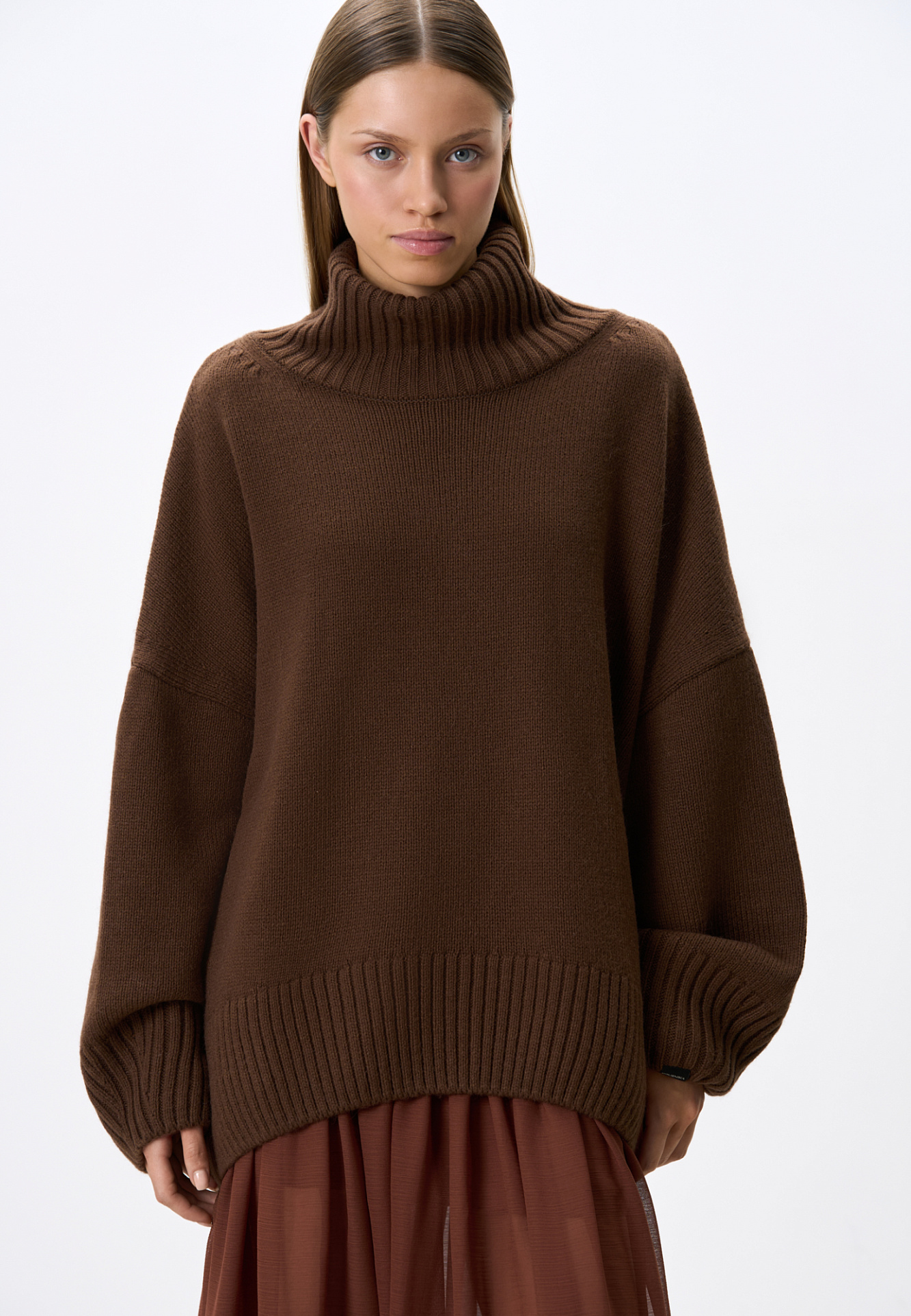 Объемный трикотажный джемпер из шерсти альпака. Модель свободного силуэта, со спущенной линией плеча и высоким воротом. Края изделия выполнены в широкий рубчик. Логотип бренда на манжете.