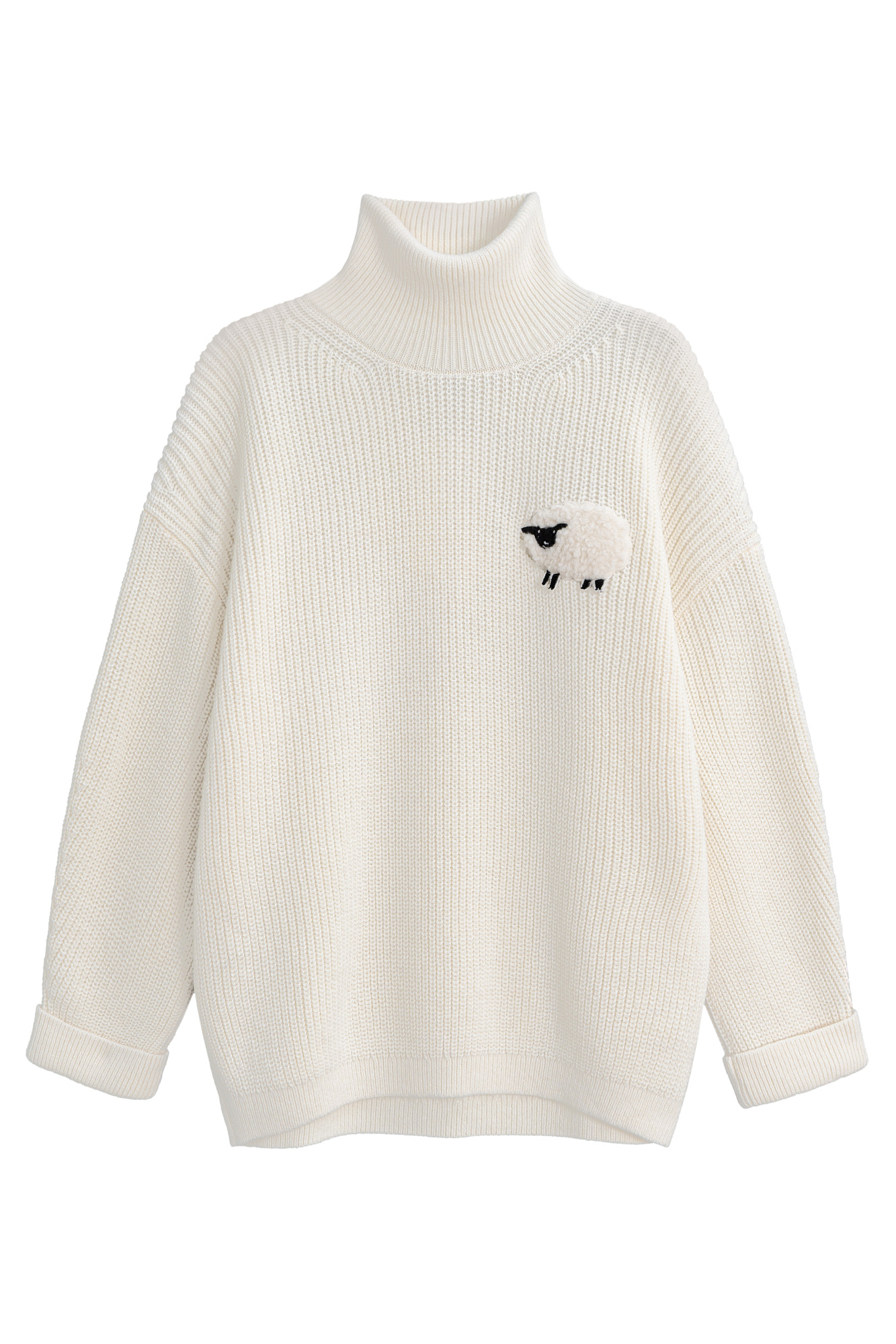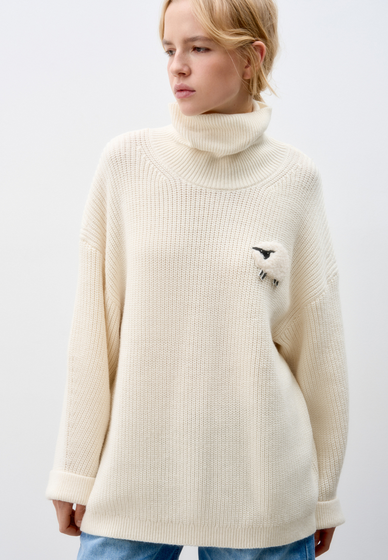 Трикотажный джемпер из шерсти альпака. Модель свободного силуэта, с высоким вывязанным горлом, спущенной линией плеч и длинными рукавами с манжетами. Изделие декорировано объемным элементом в виде барашка.