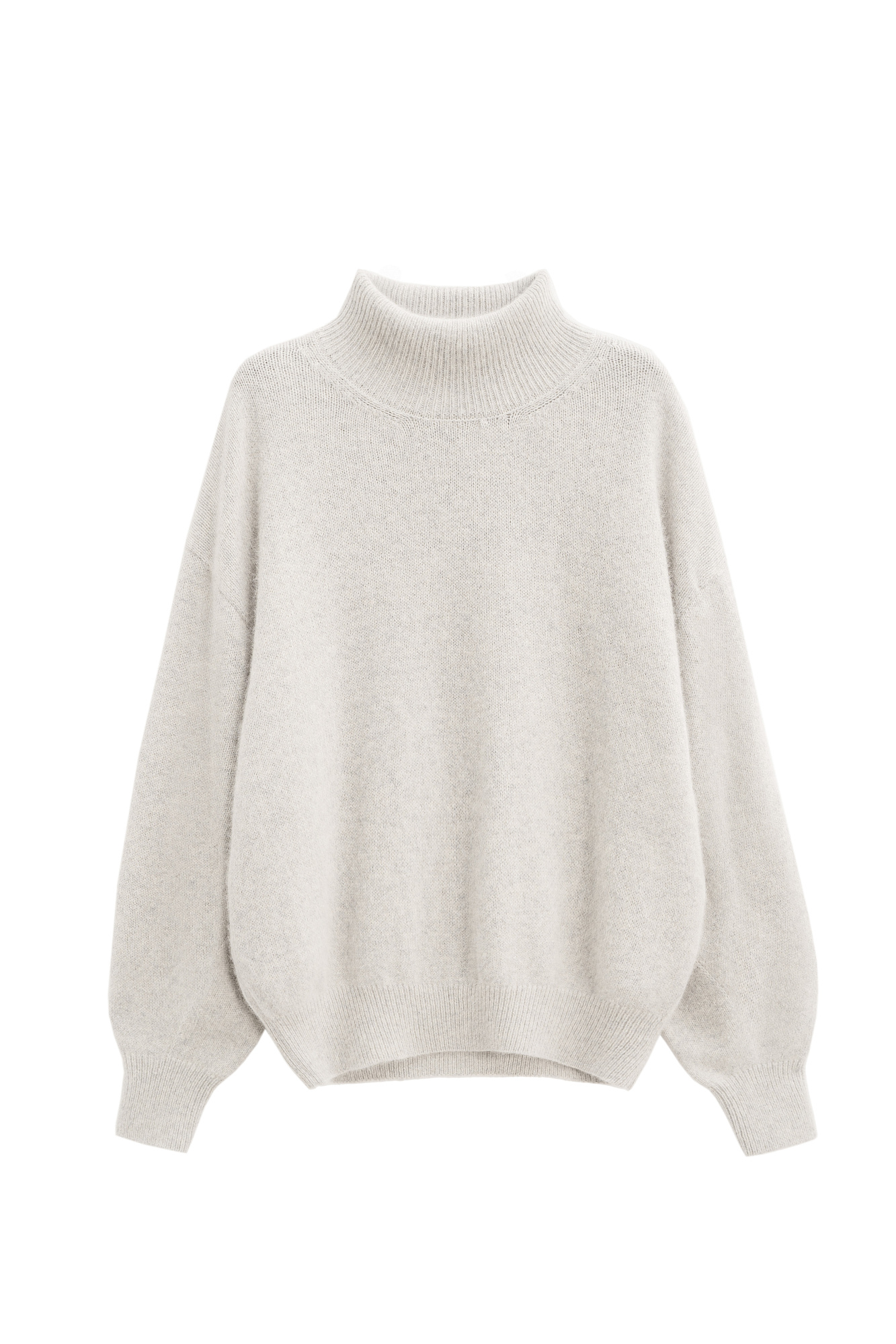 Трикотажный джемпер из пуха лисы. Модель свободного силуэта с высоким воротом, спущенной линией плеч и широкими рукавами с манжетами на резинке.