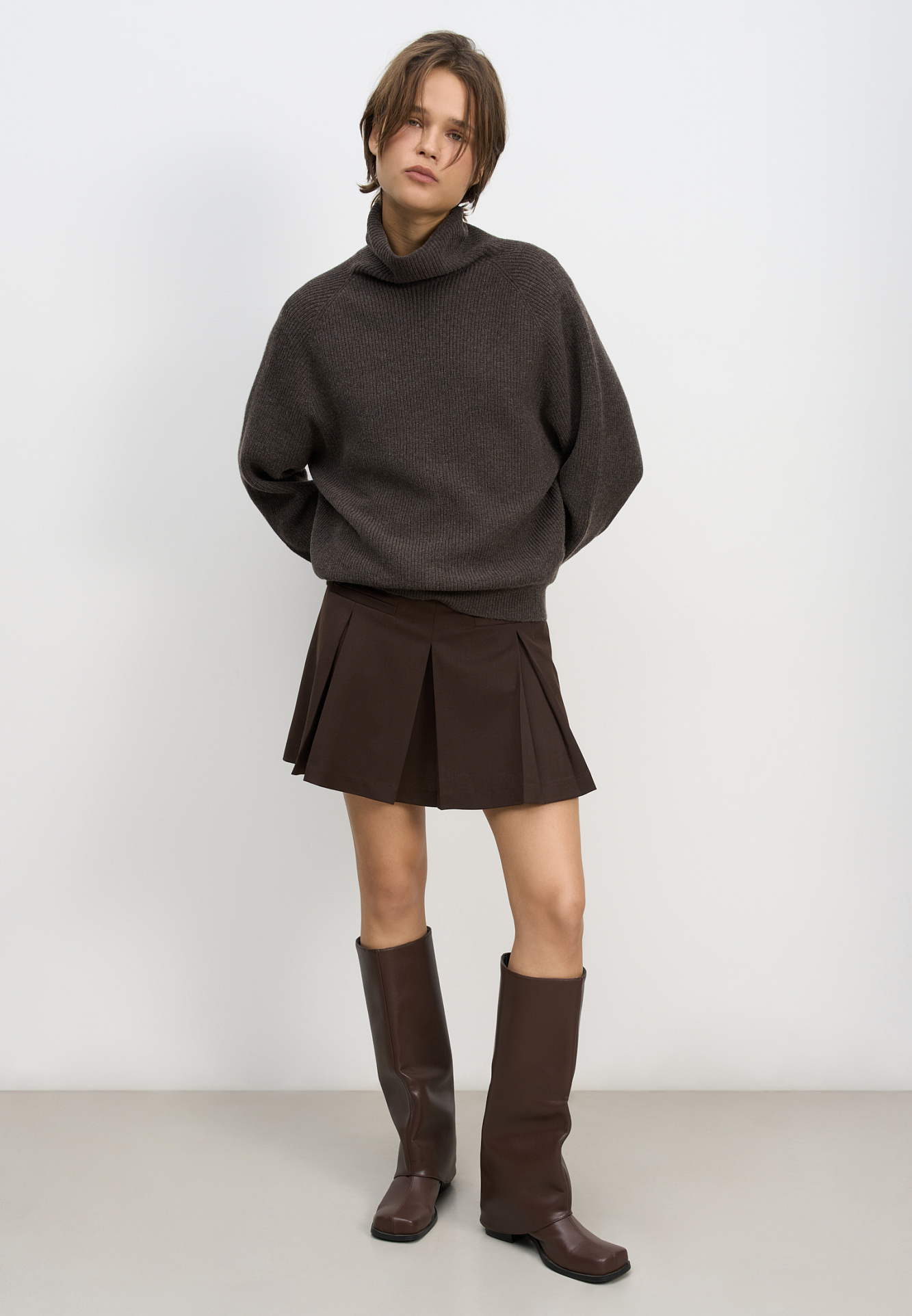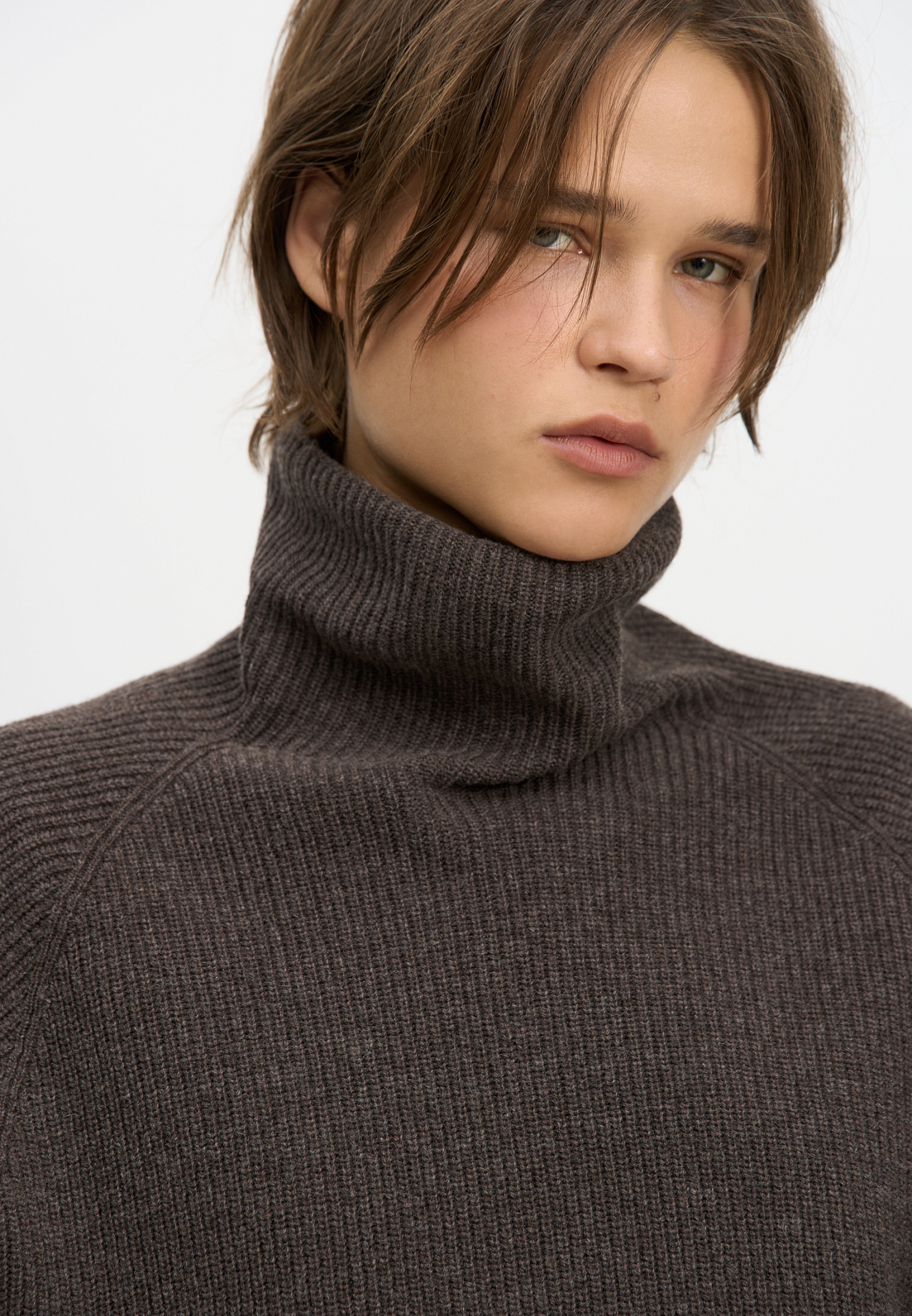 Трикотажный джемпер из шерсти и кашемира. Модель свободного силуэта с аккуратным воротником-стойкой и рукавом формы реглан. Низ изделия и манжеты рукавов выполнены на резинке.
