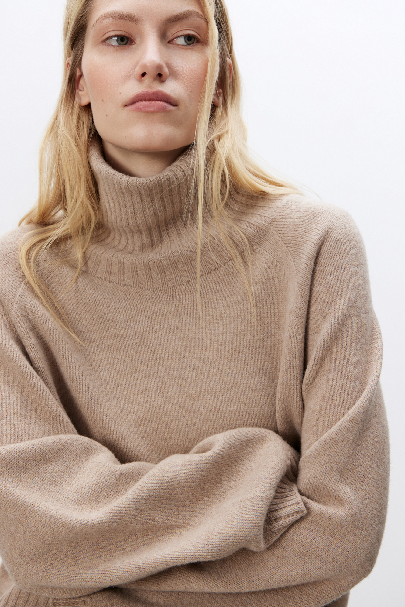 Трикотажный джемпер из шерсти с добавлением кашемира. Модель с высоким воротником в рубчик, спущенной линией плеча и жаккардовым рисунком в виде сердца на спине.