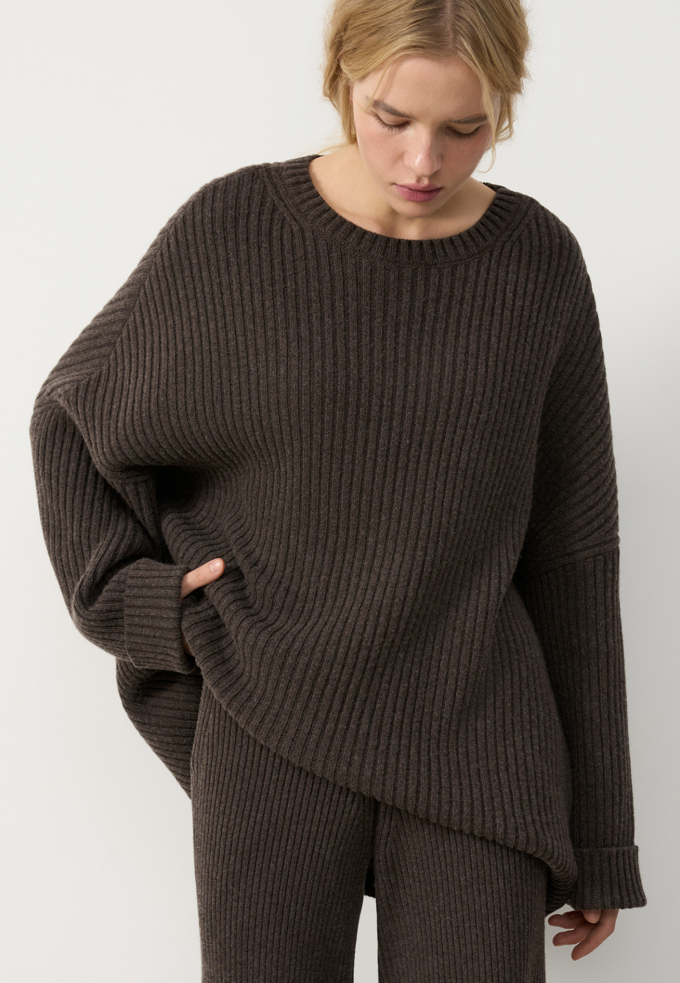Трикотажный джемпер из шерсти с добавлением кашемира. Модель свободного силуэта со спущенной линией плеча, отворотами на манжетах и круглым вырезом горловины. Изделие выполнено в широкий рубчик.