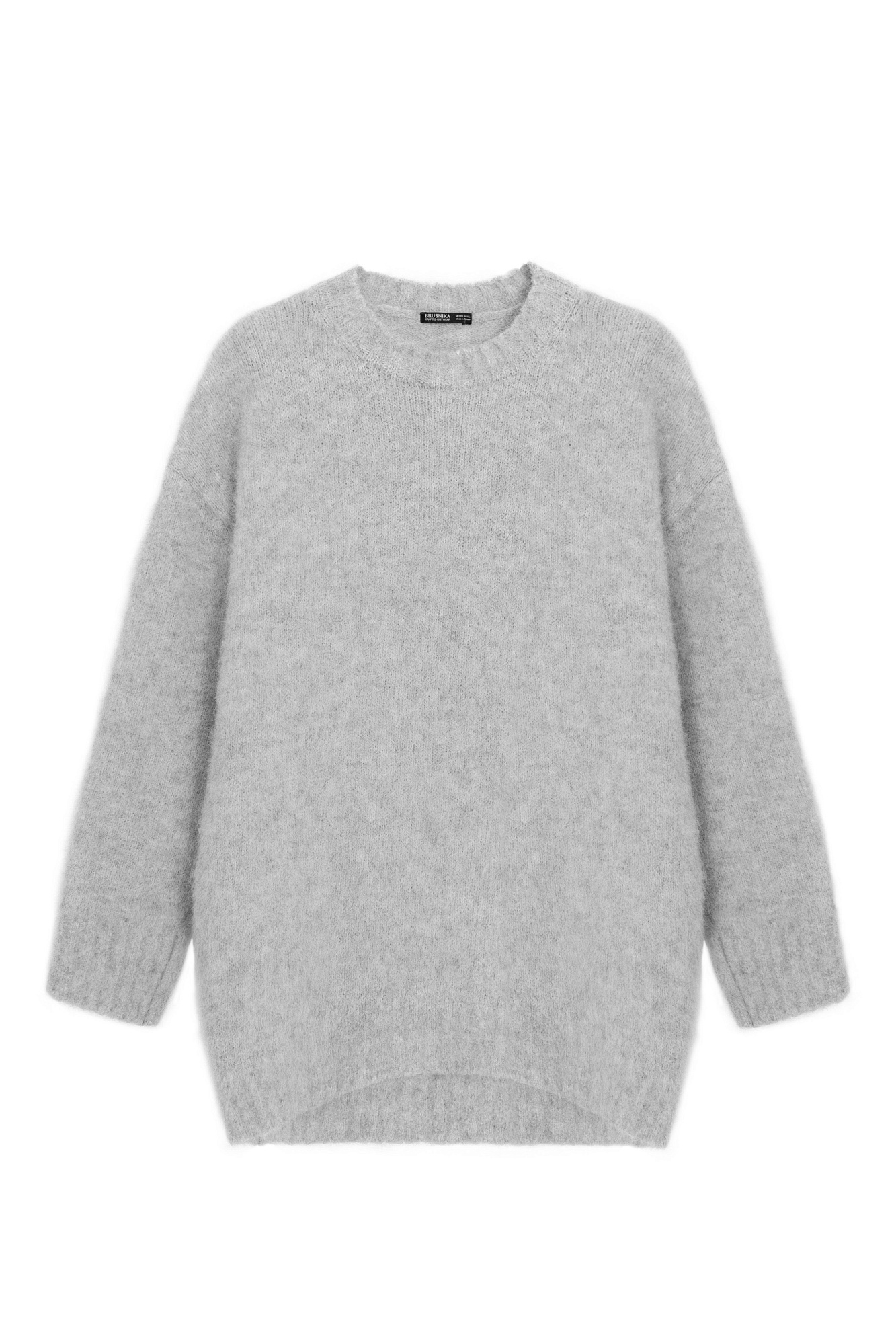 Трикотажный джемпер из пушистой пряжи на основе шерсти альпака. Модель свободного силуэта со спущенной линией плеча. Края изделия в рубчик.
