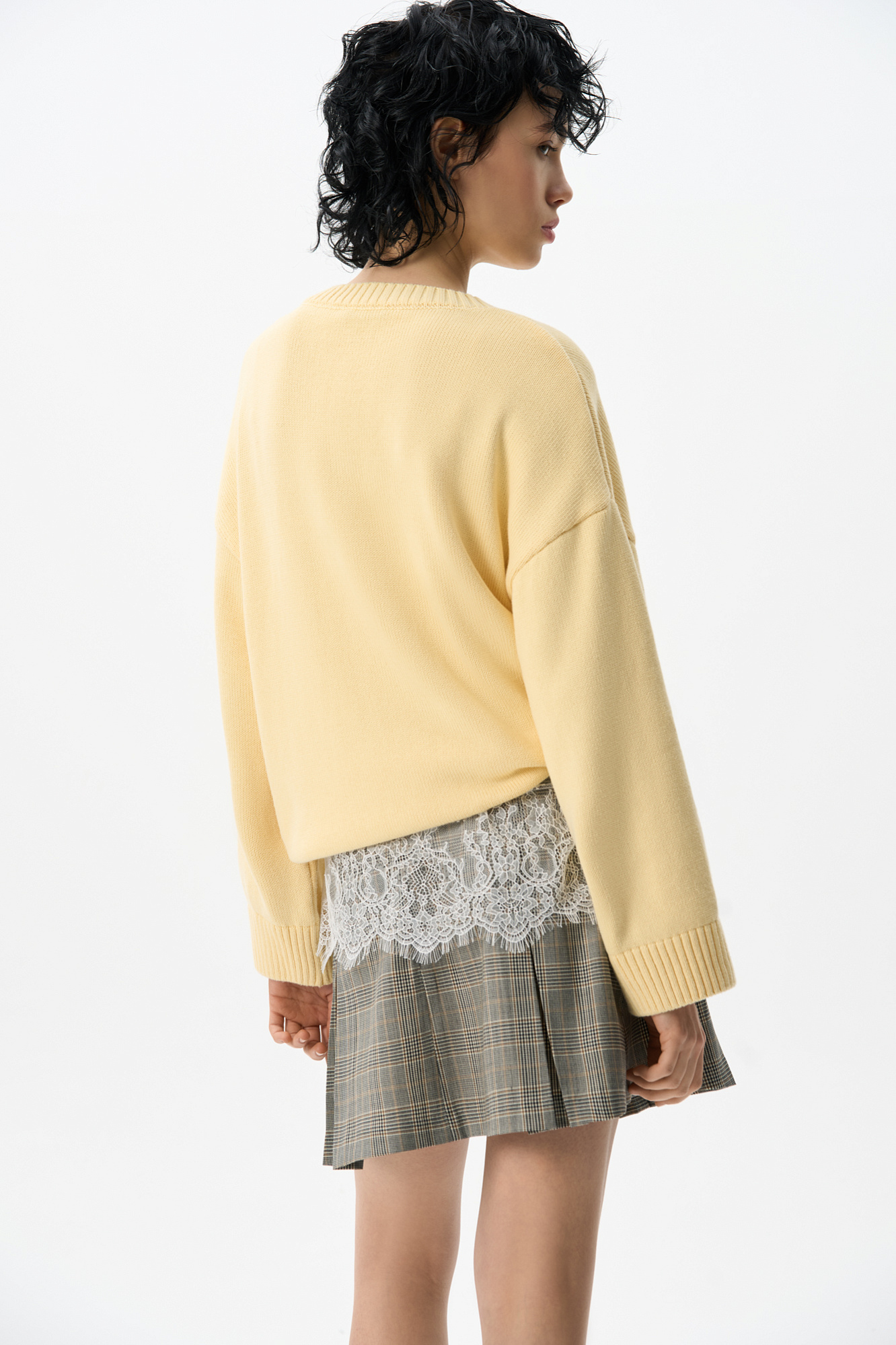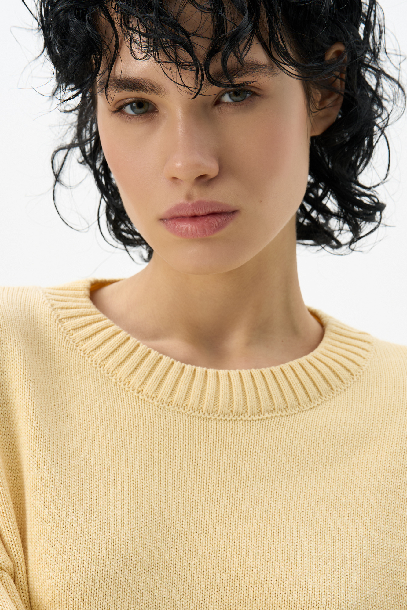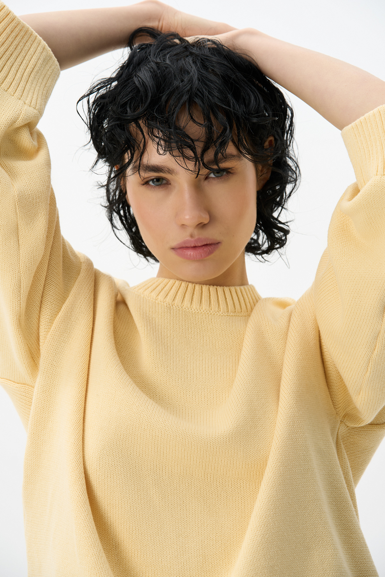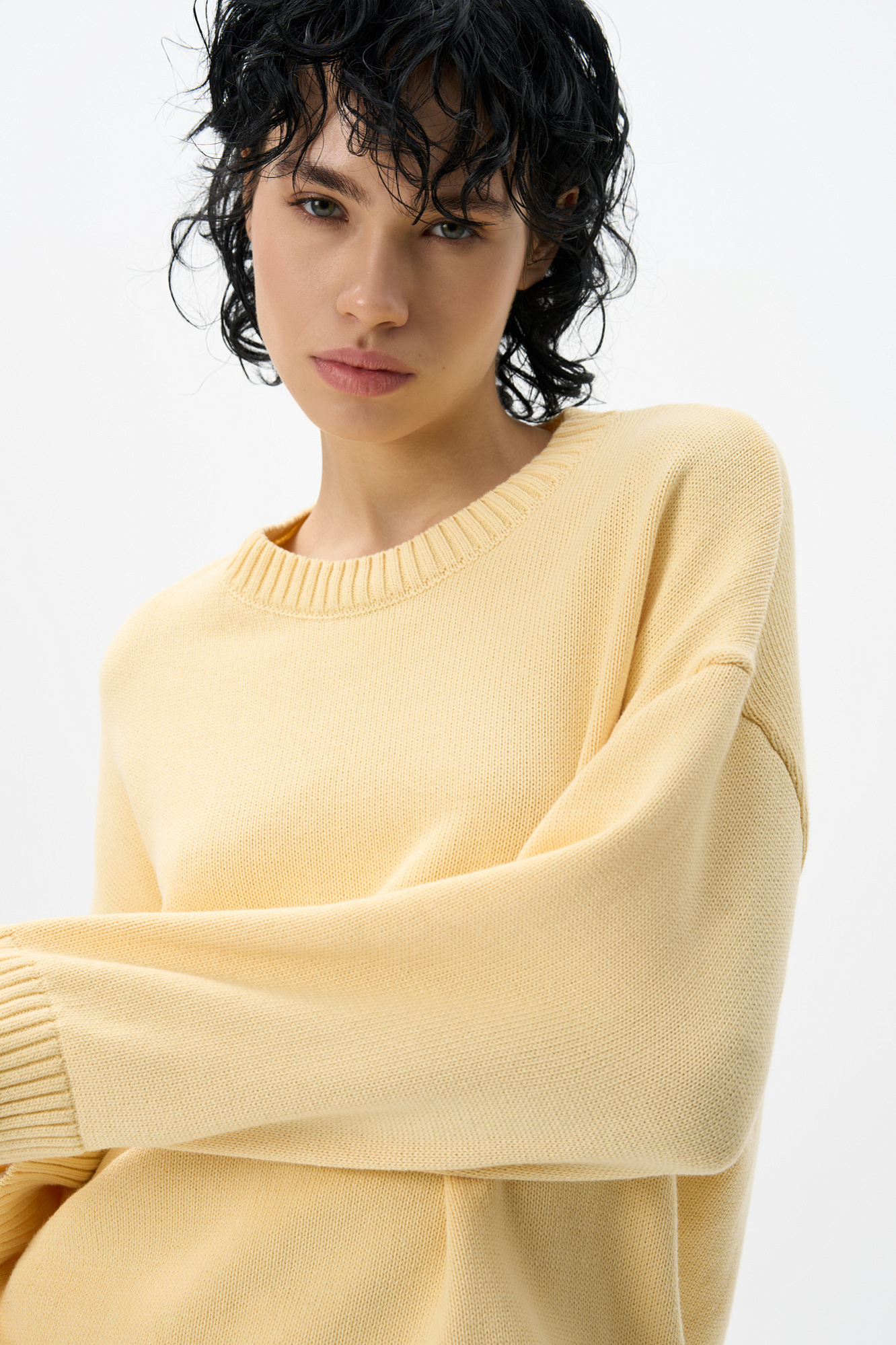 Трикотажный джемпер из 100% хлопка. Модель свободного силуэта со спущенной линией плеч и круглым вырезом горловины. Края изделия выполнены в рубчик. Дополнить образ можно юбкой.
