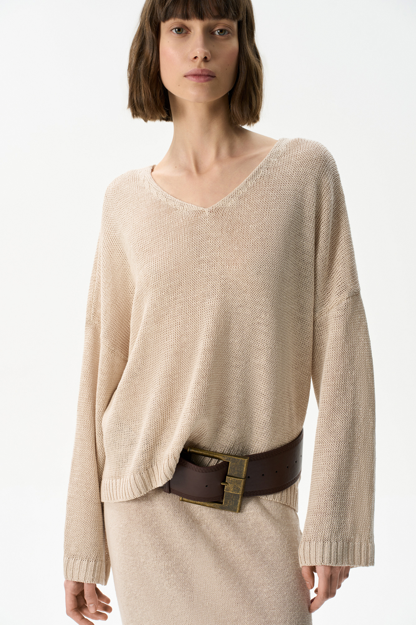 Трикотажный джемпер из 100% льна с V-образным вырезом. Модель прямого силуэта с длинным рукавом и удлиненной спинкой. Края изделия выполнены в рубчик.