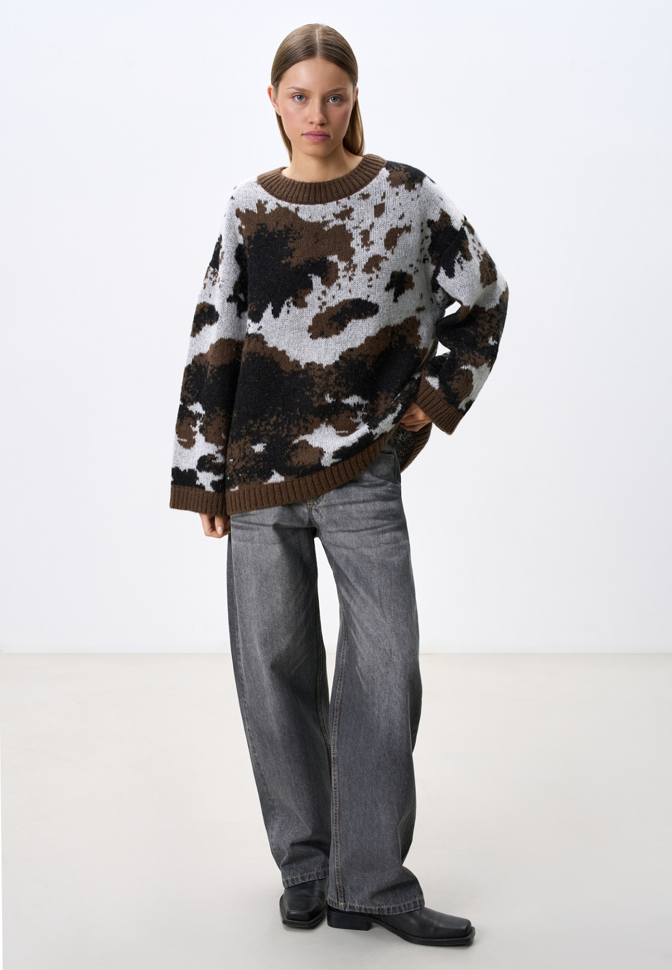 Трикотажный джемпер с жаккардовым анималистическим дизайном из шерсти и мохера. Модель свободного силуэта со спущенной линией плеча, с круглым вырезом. Края изделия выполнены в рубчик.