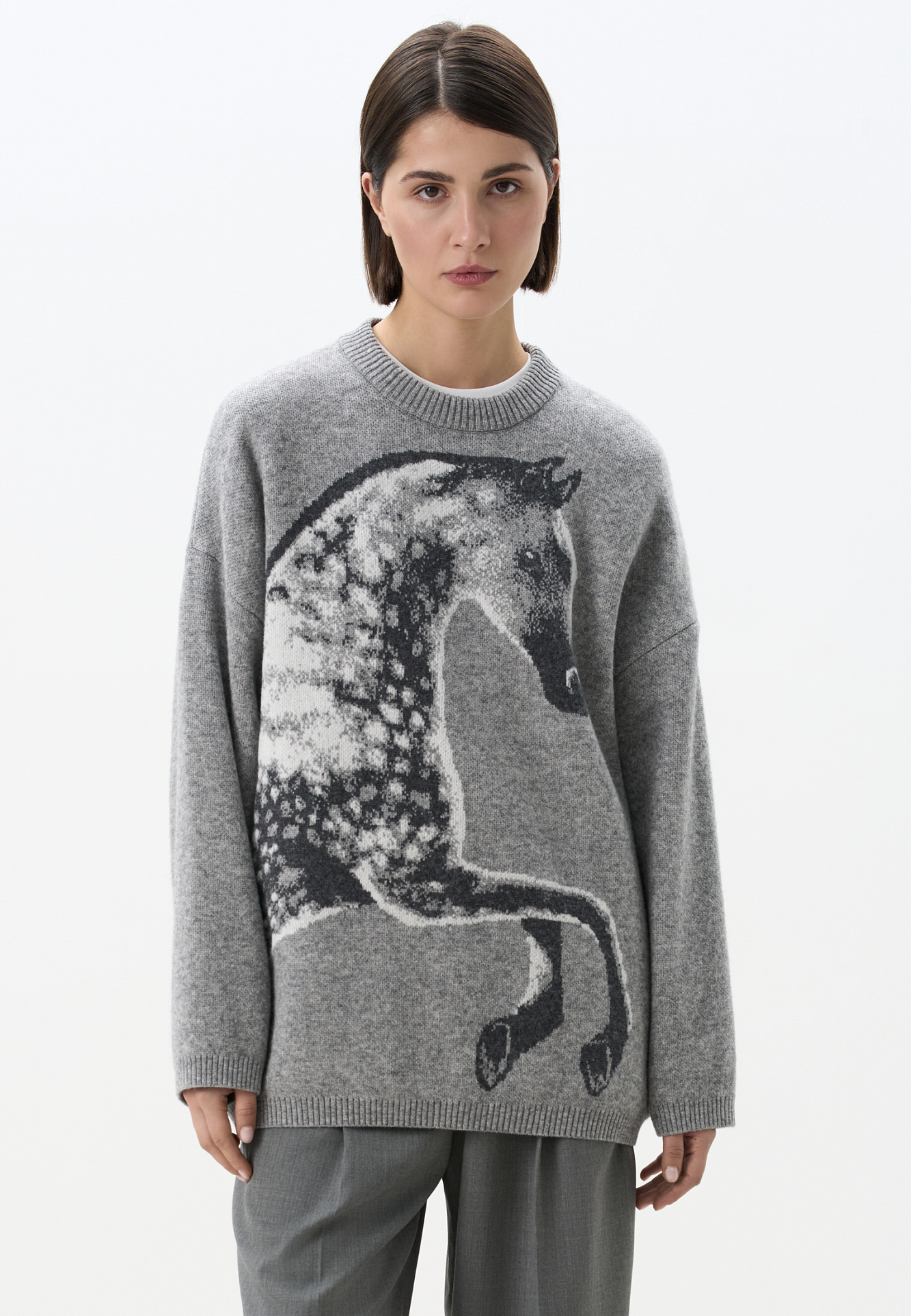 Трикотажный джемпер из шерсти и кашемира. Модель свободного силуэта со спущенной линией плеч, круглым вырезом горловины и жаккардовым анималистичным принтом лошади. Края изделия выполнены в рубчик.