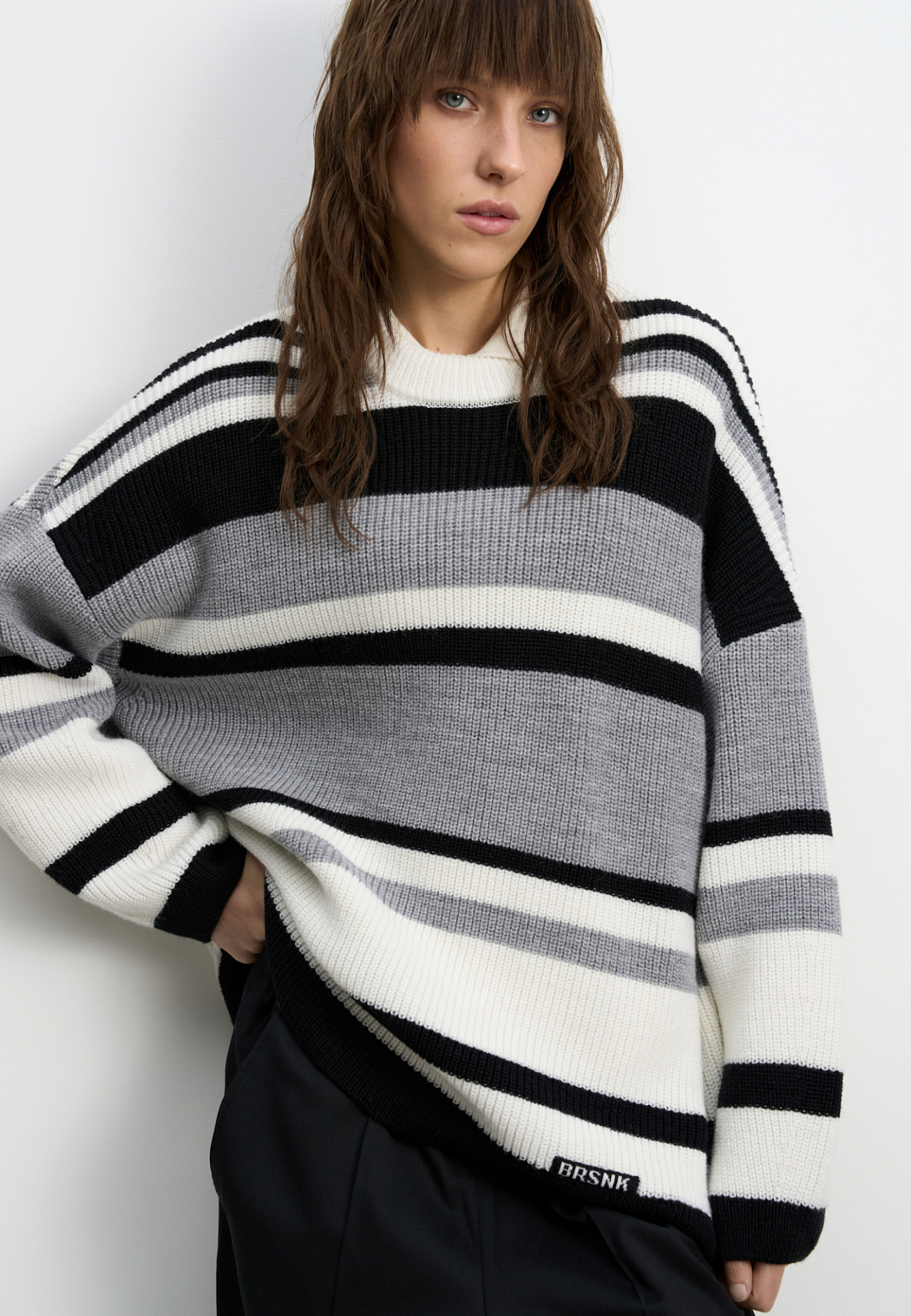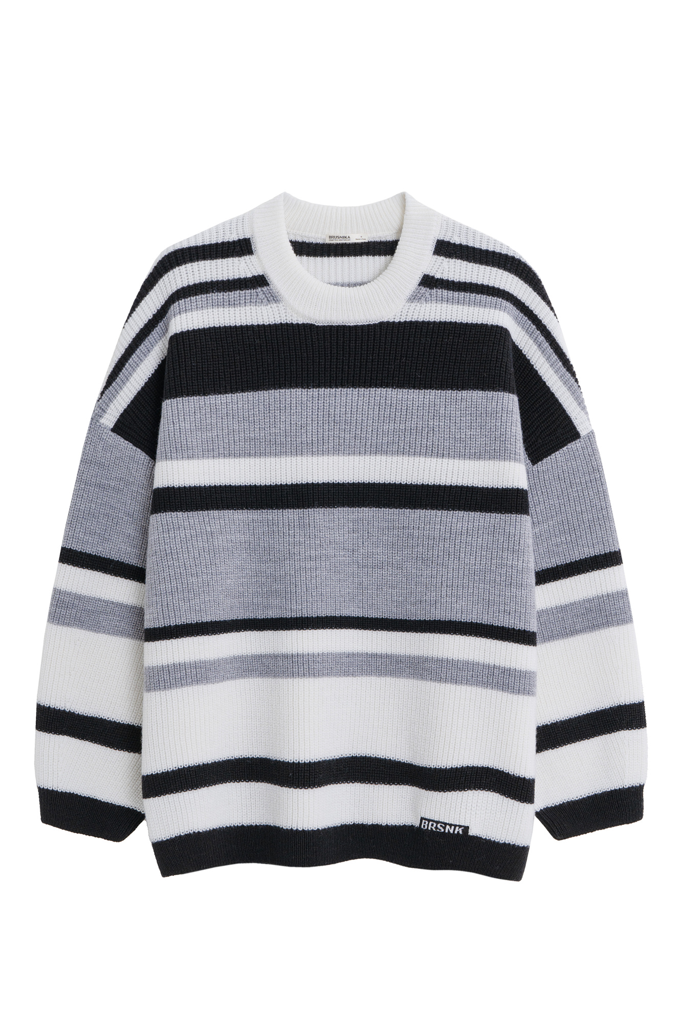 Трикотажный джемпер из шерсти в полоску. Модель свободного силуэта, со спущенной линией плеч, длинными рукавами и круглым вырезом горловины. Изделие декорировано пришивным логотипом бренда.