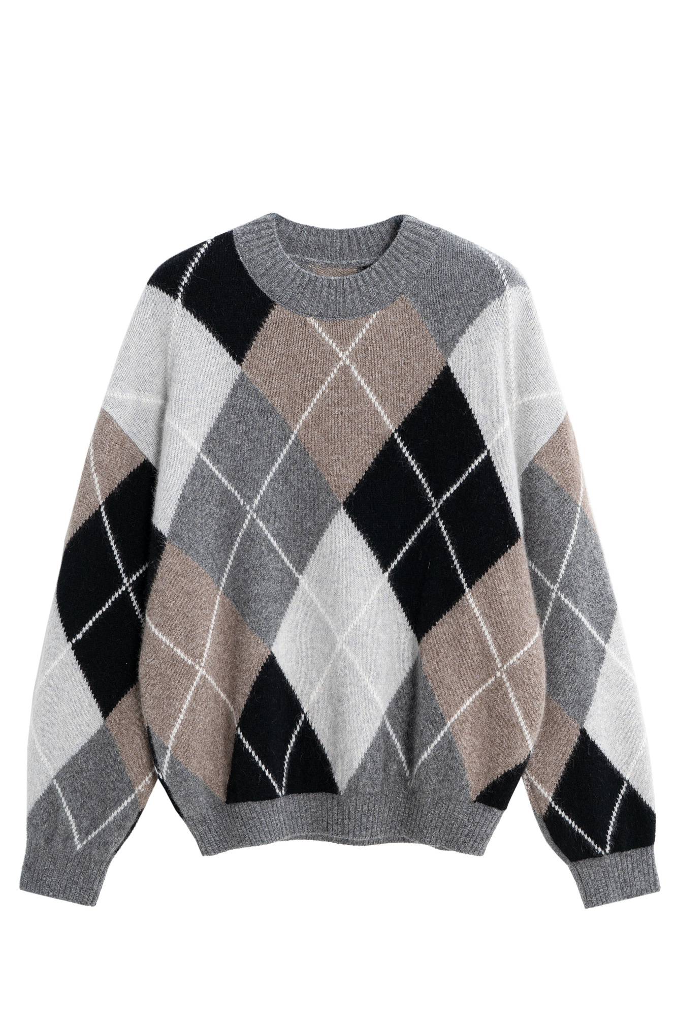 Трикотажный джемпер из пуха лисы с узором аргайл. Модель свободного силуэта, со спущенной линией плеча и круглым вырезом горловины. Края изделия выполнены выполнены в рубчик.