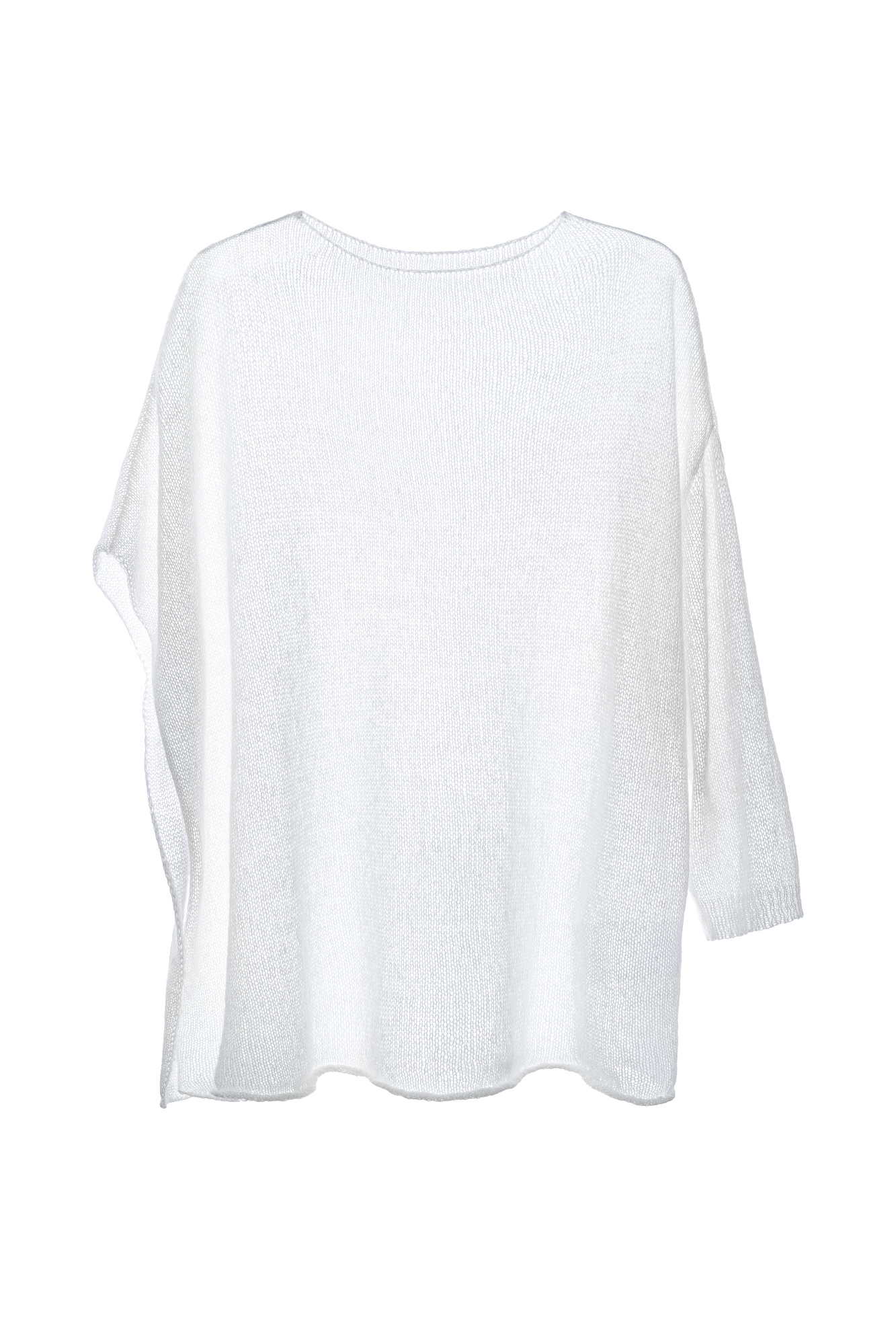 Полупрозрачный трикотажный джемпер из шерсти с добавлением мохера. Модель асимметричного силуэта с одним длинным рукавом и круглым вырезом горловины.
