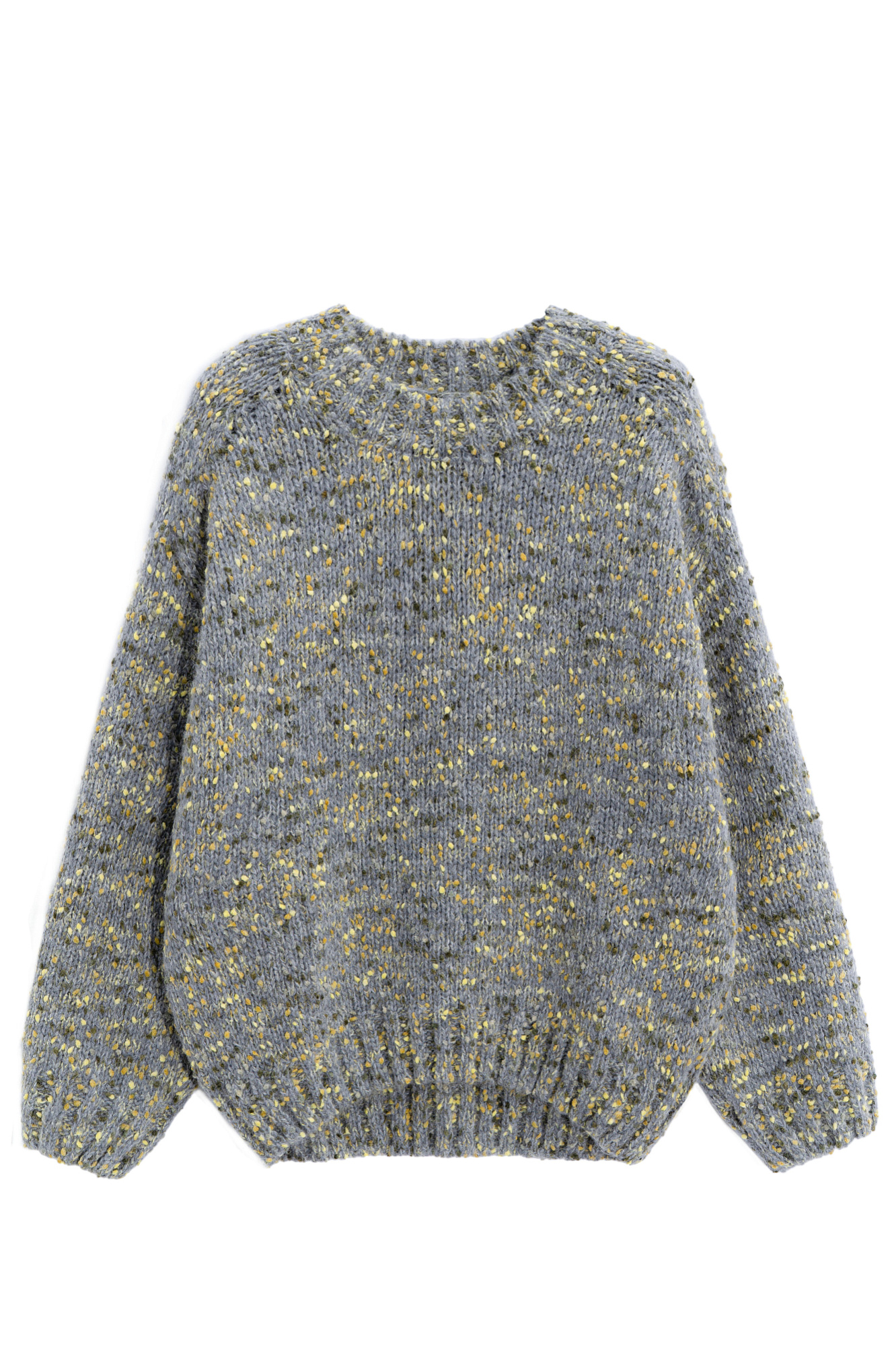 Буклированный джемпер из шерсти альпака. Модель свободного силуэта с рукавом-погон и круглым воротником. Низ изделия, манжеты рукавов и воротник выполнены в широкий рубчик.
