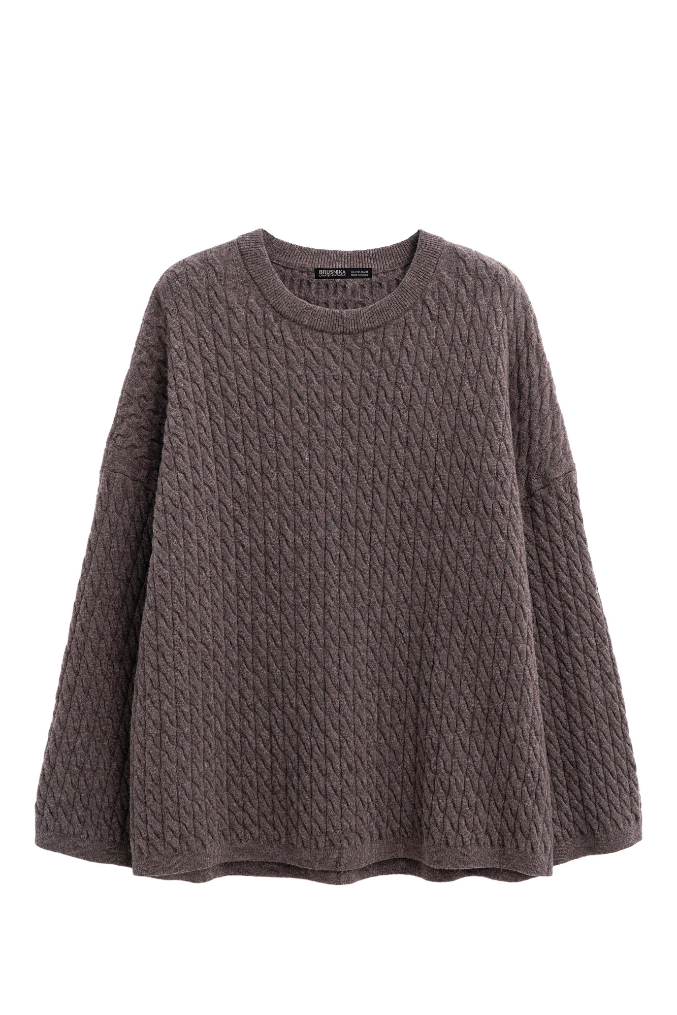 Трикотажный джемпер с объемными косами из 100% шерсти мериноса экстрафайн. Модель свободного силуэта, со спущенной линией плеч и круглым вырезом горловины, оформленным двойной бейкой. Края изделия выполнены в мелкий рубчик.