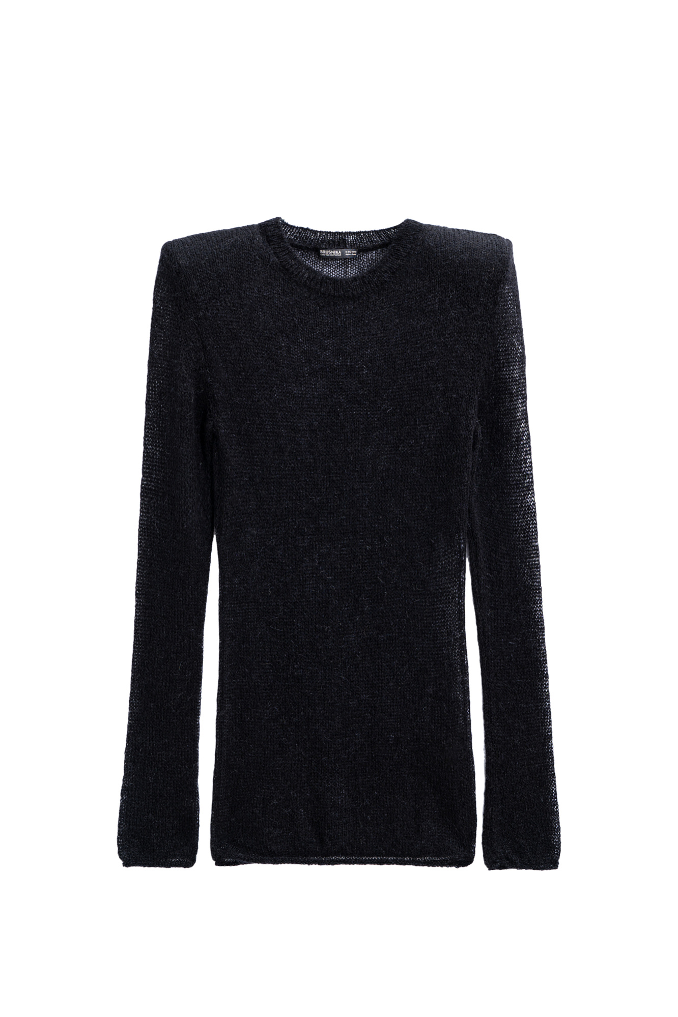 Полупрозрачный трикотажный джемпер из шерсти с добавлением мохера. Модель по фигуре с круглым вырезом горловины. Изделие с подплечниками.