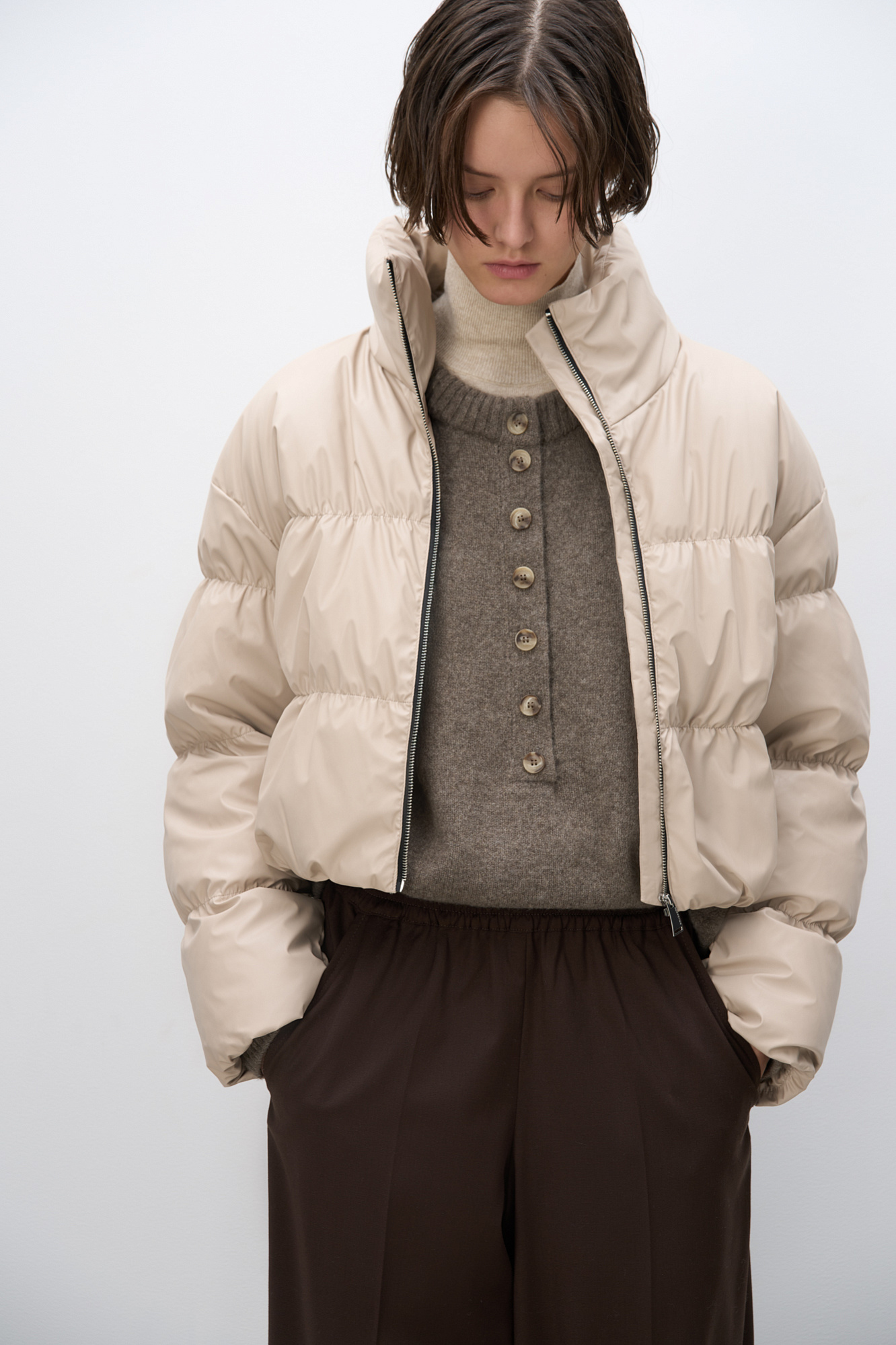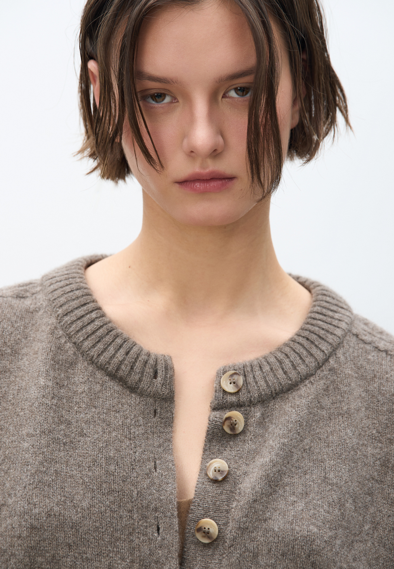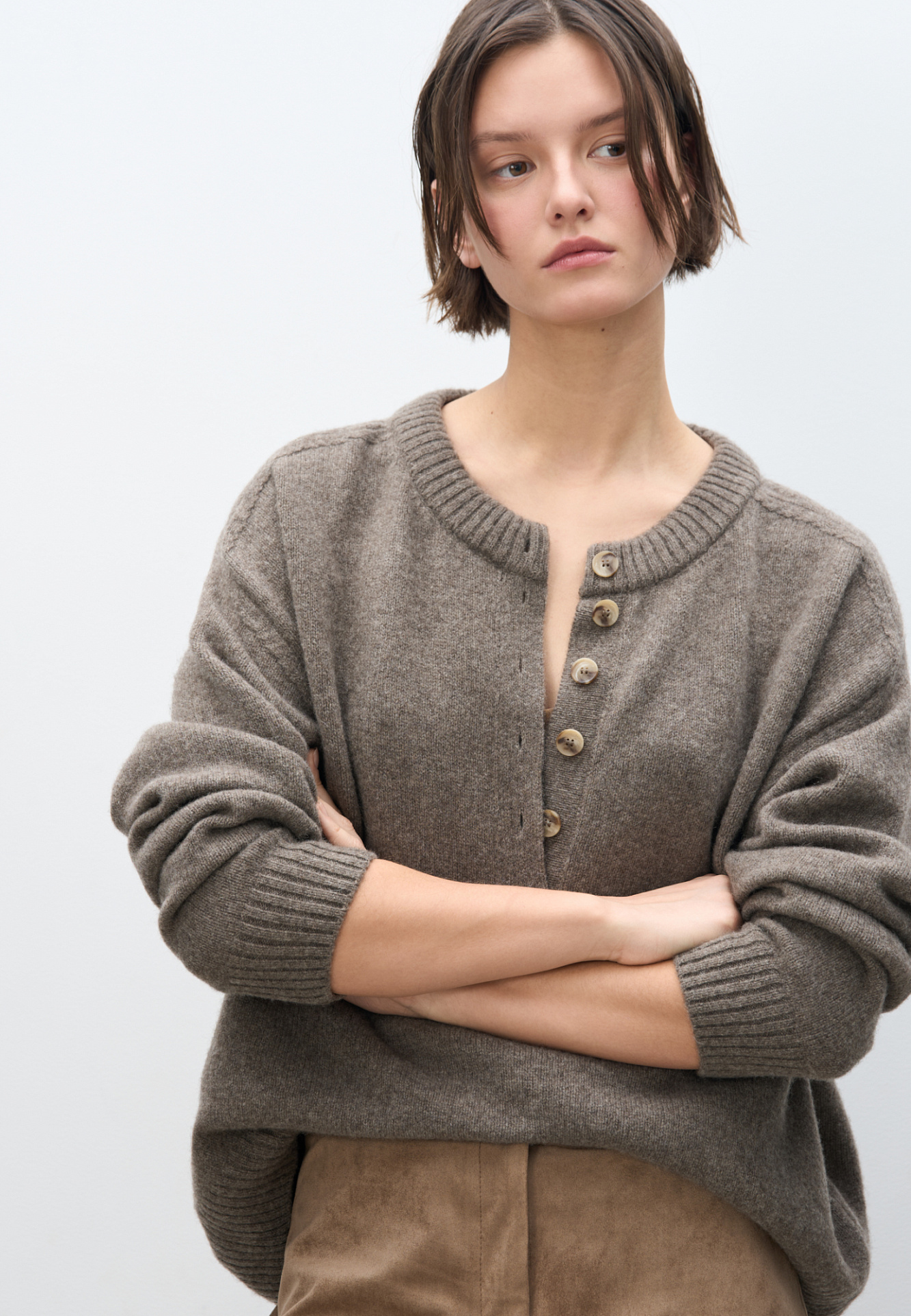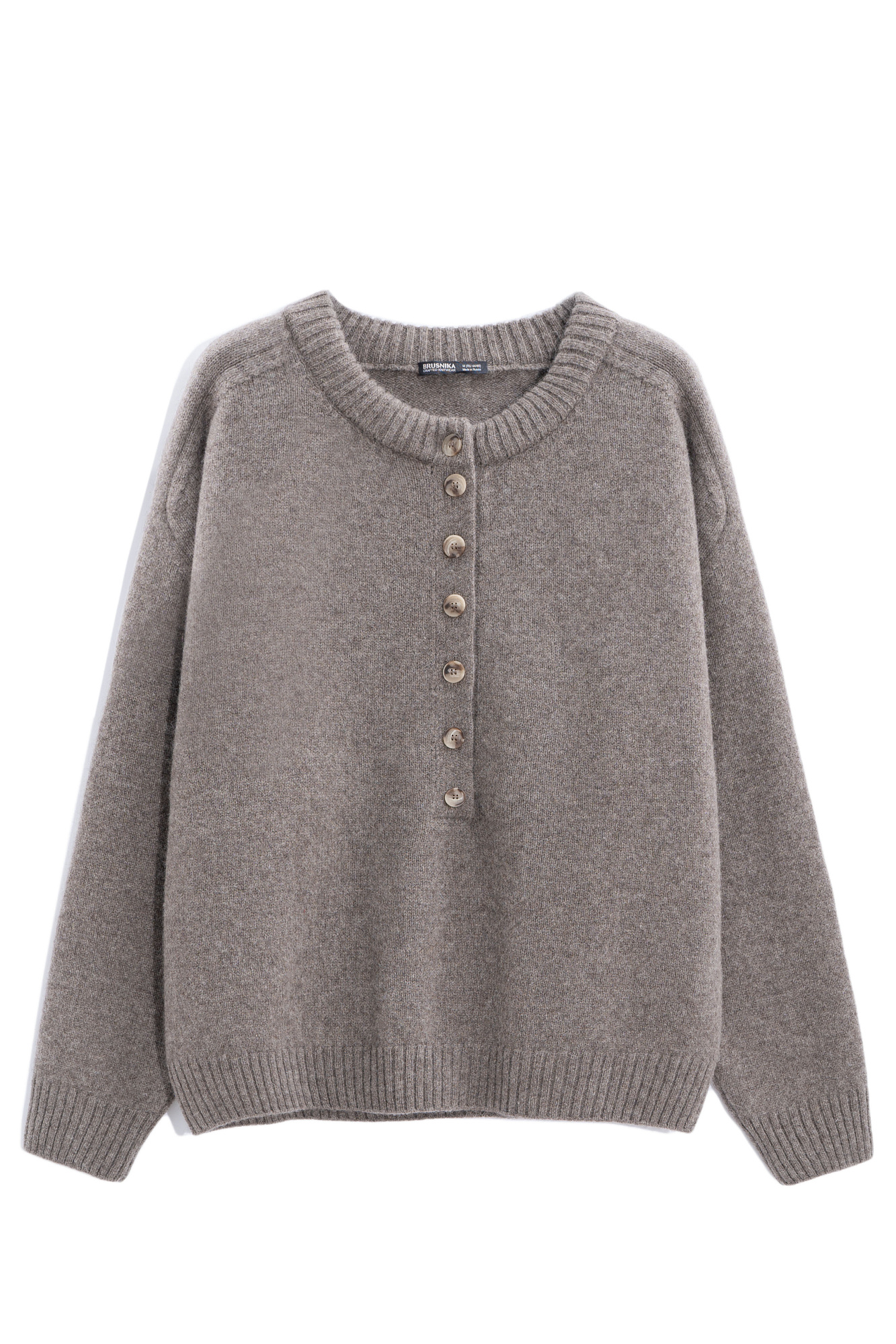 Трикотажный джемпер из 100% шерсти яка. Модель свободного силуэта с вывязанной круглой горловиной и планкой на пуговицах. Низ изделия и манжеты рукавов выполнены в рубчик.