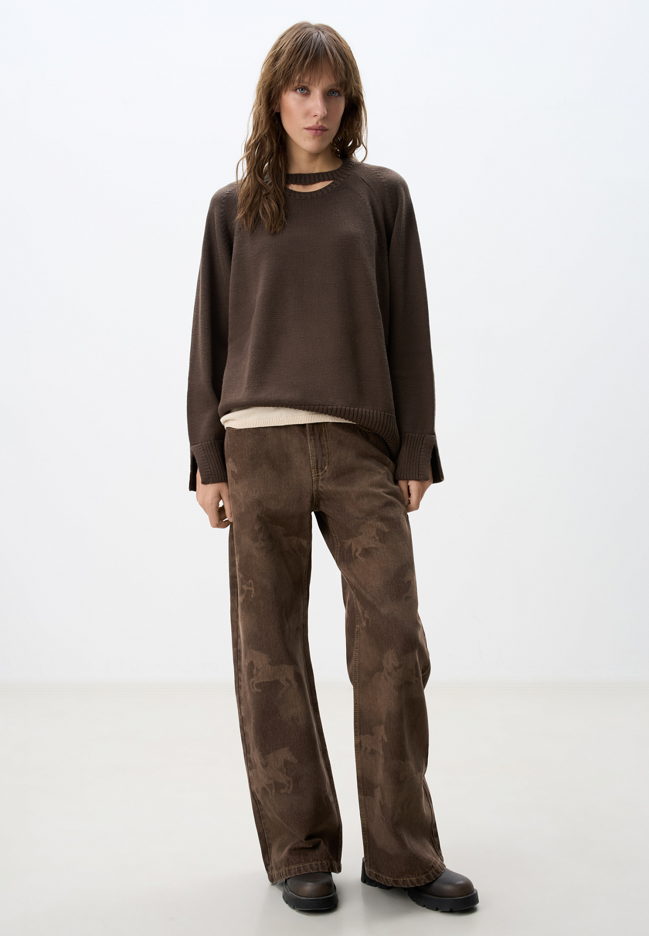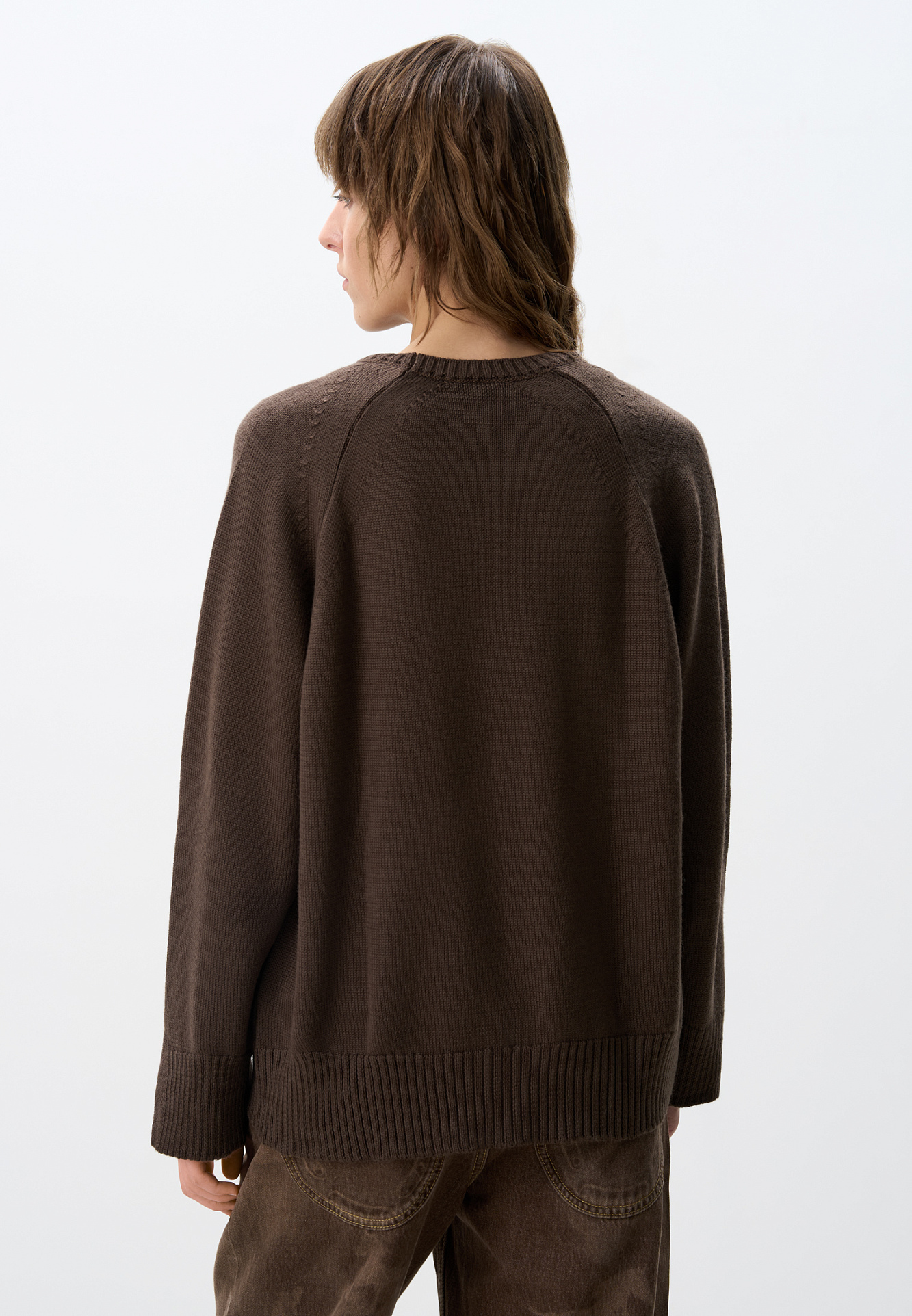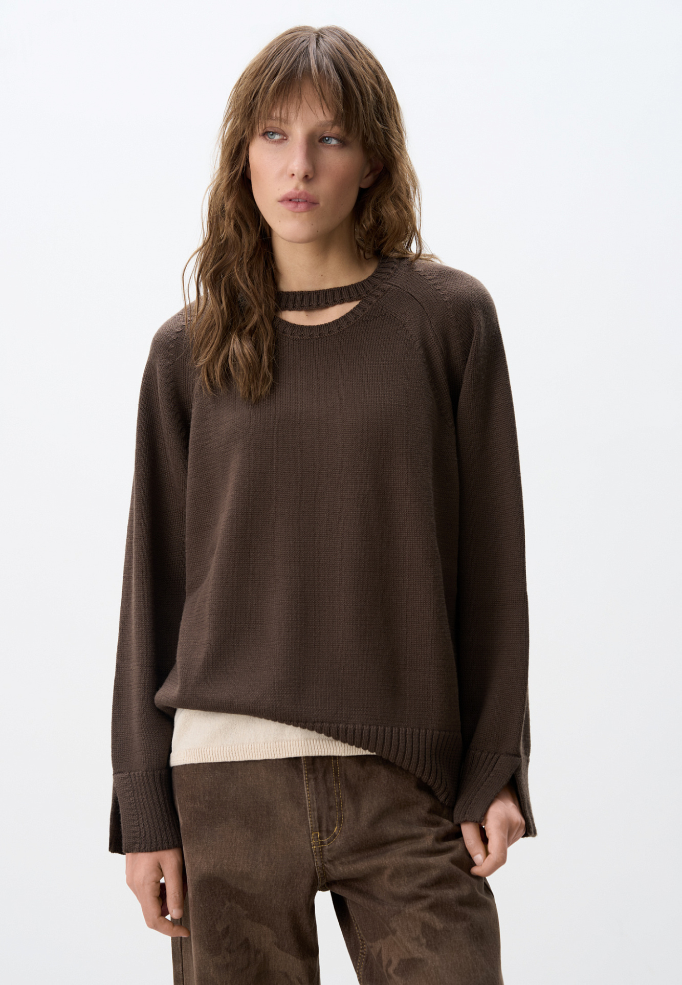Трикотажный джемпер из шерсти. Модель прямого кроя с декоративным вырезом и разрезами на рукавах.