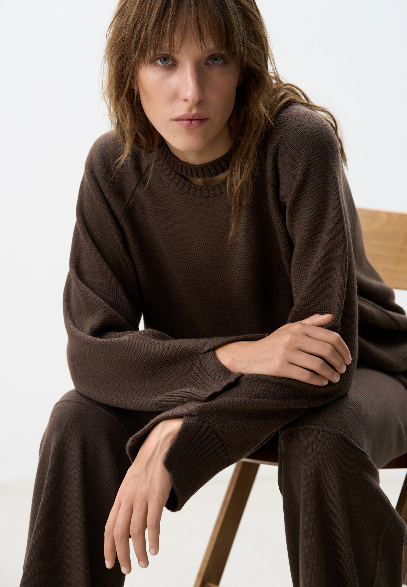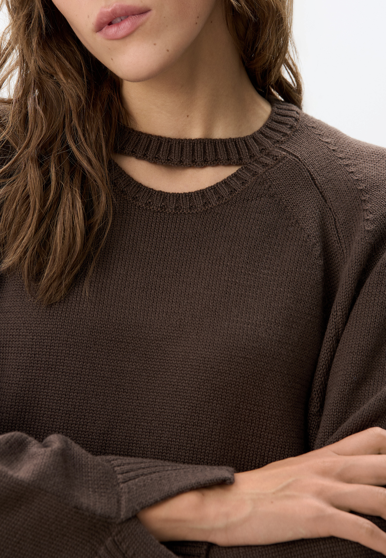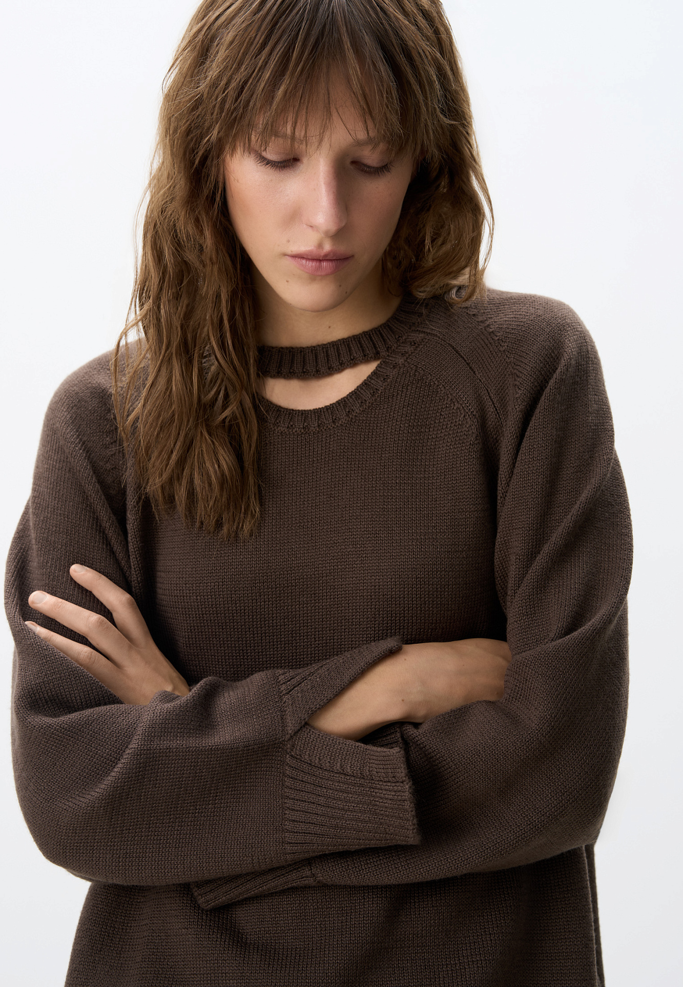 Трикотажный джемпер из шерсти. Модель прямого кроя с декоративным вырезом и разрезами на рукавах.