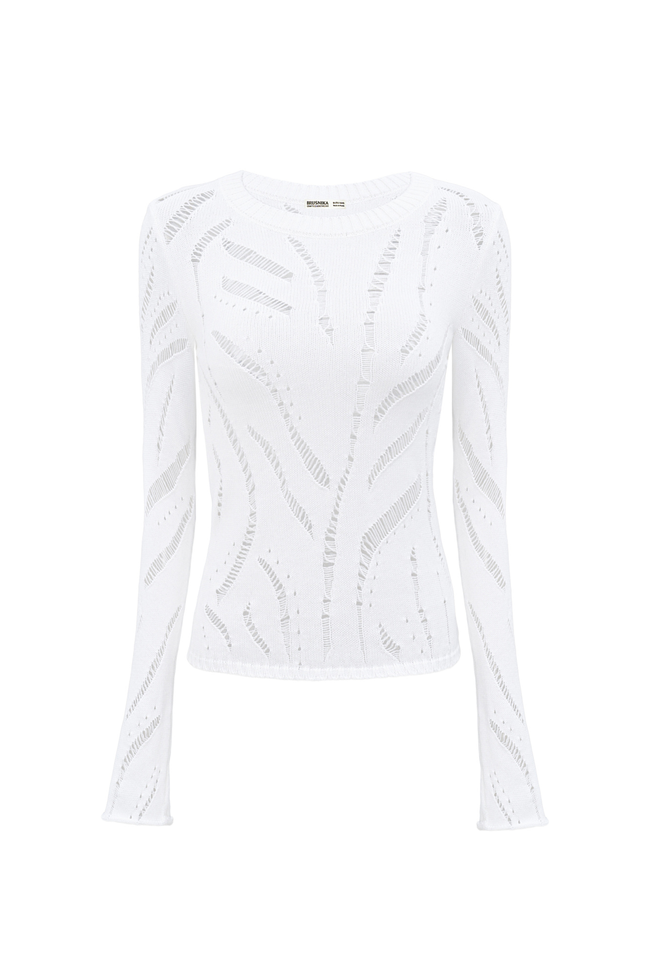 Трикотажный джемпер из 100% хлопка. Длинные расклешенные рукава, круглый вырез в рубчик. Модель фактурной вязки с протяжками.