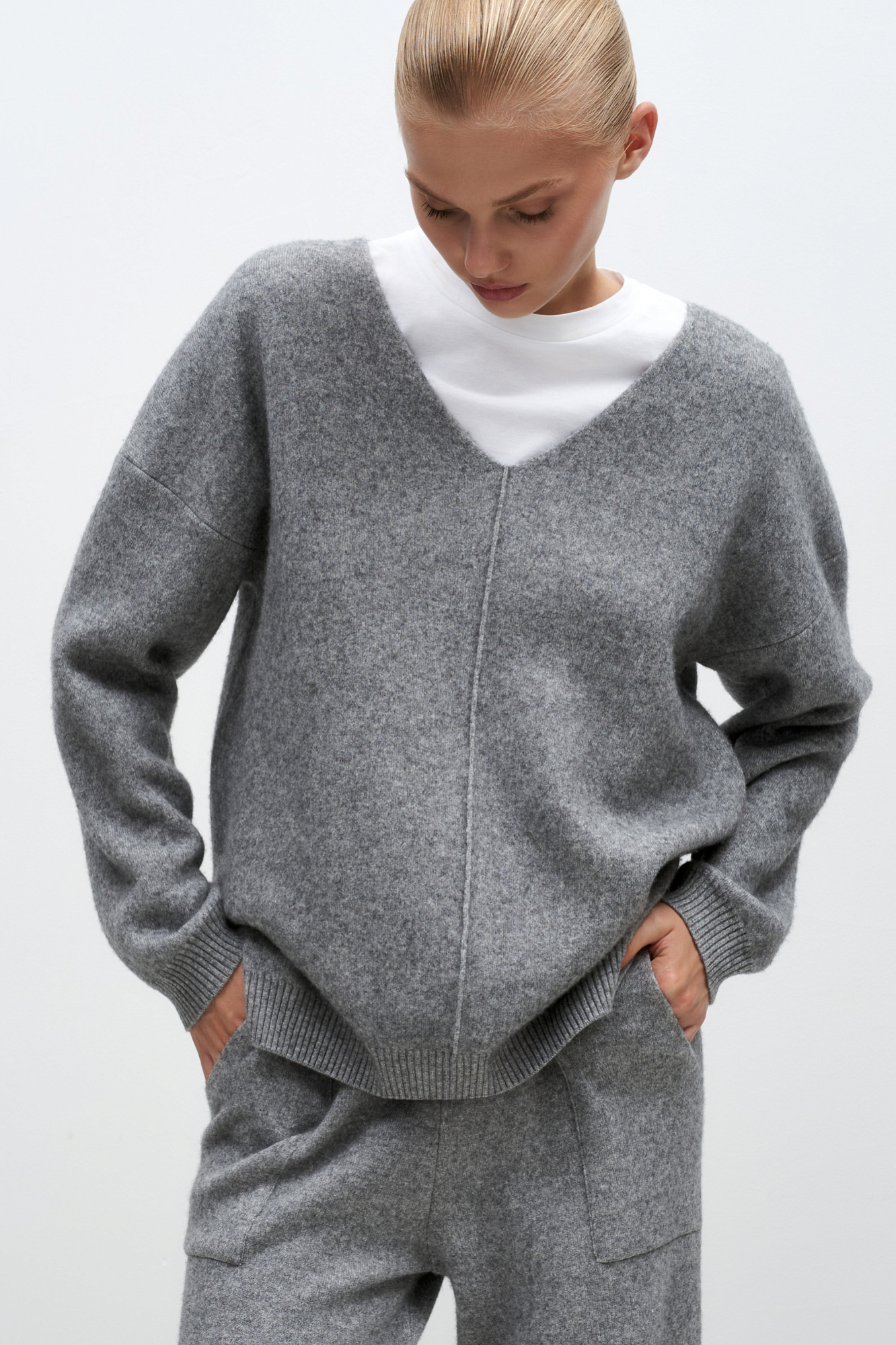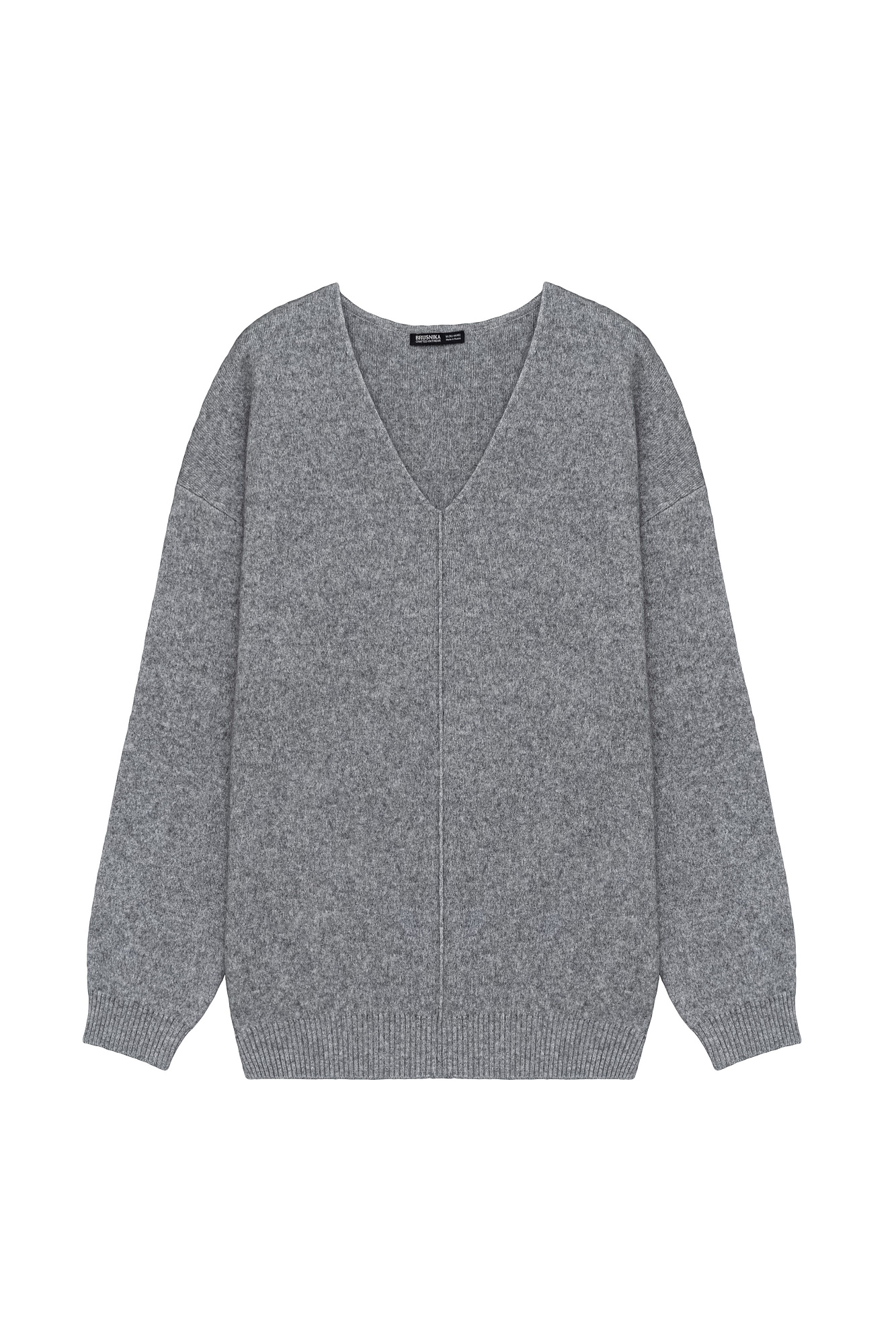 Трикотажный джемпер из смесовой шерсти с добавлением кашемира. V-образный вырез и спущенная линия плеч. Декоративный шов посередине.