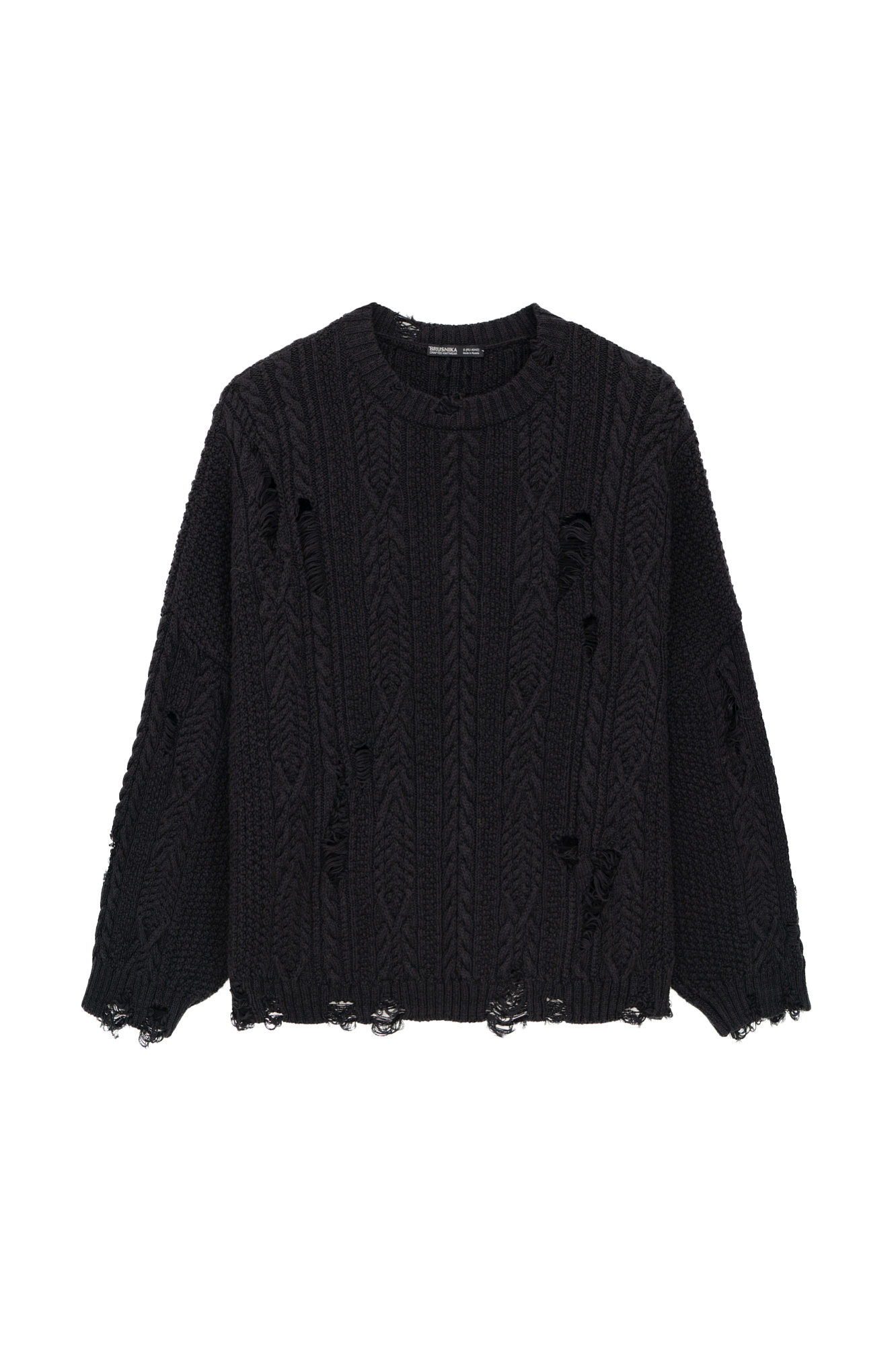 Трикотажный джемпер из вискозы с добавлением хлопка. Длинные рукава, круглый вырез, разрезы по всему изделию в стиле гранж.