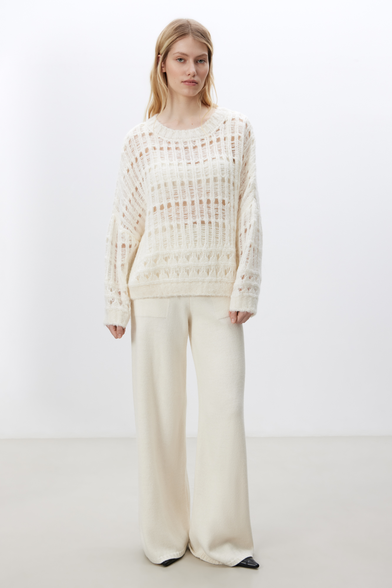 Трикотажный джемпер с шерстью альпака со спущенной линией плеча и круглым вырезом. Модель свободного силуэта, низ изделия и манжеты в рубчик.