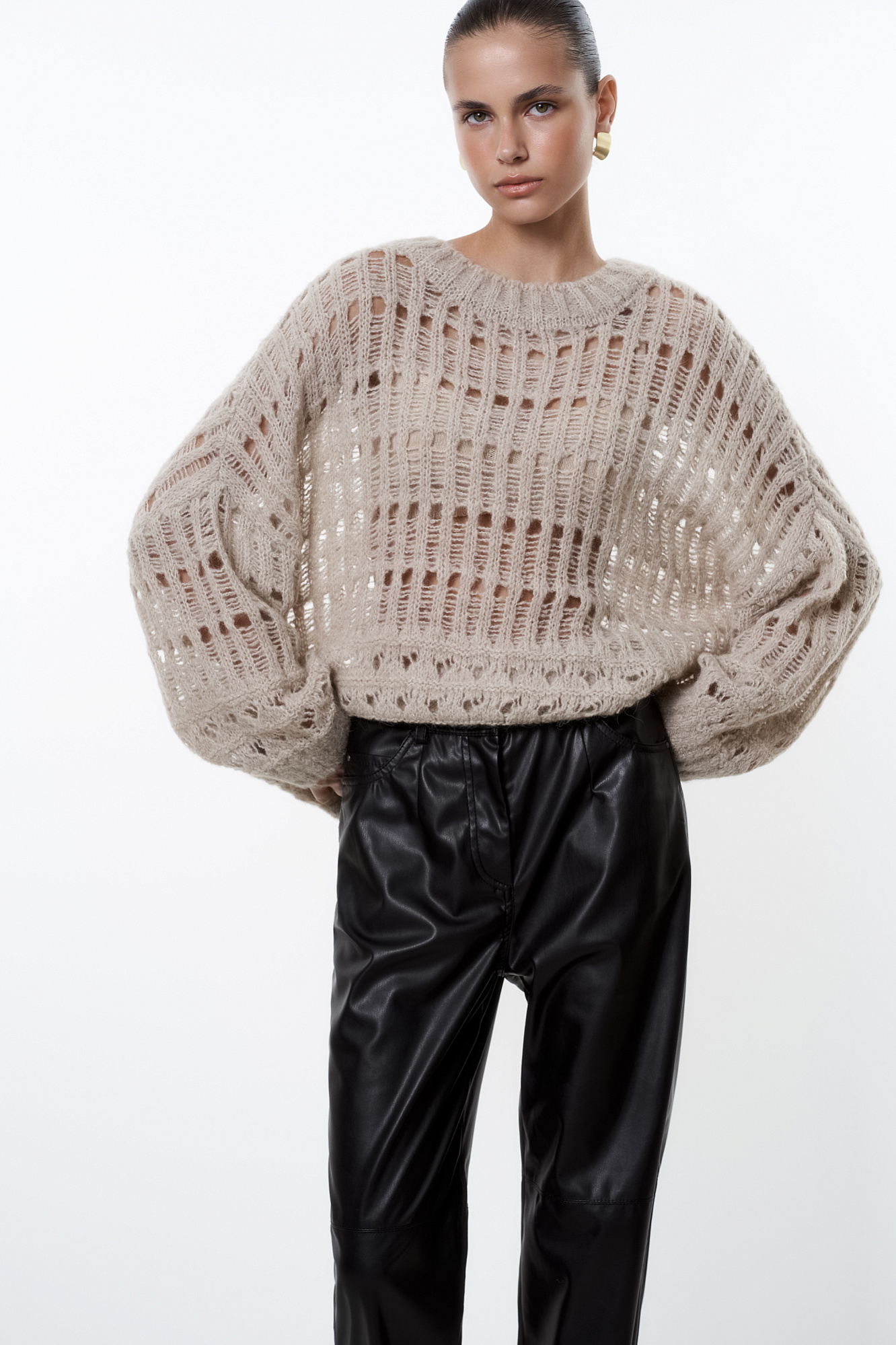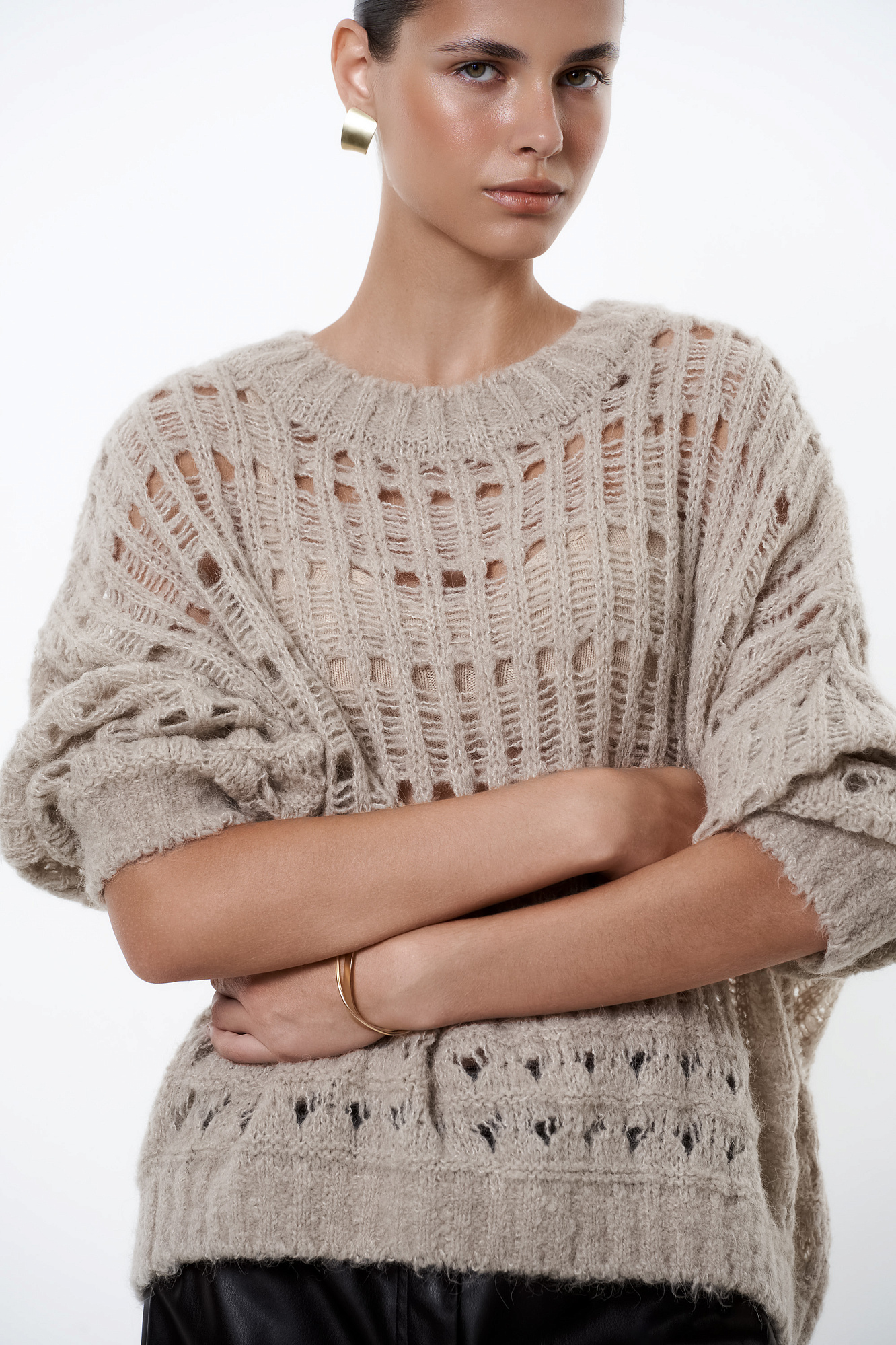 Трикотажный джемпер с шерстью альпака со спущенной линией плеча и круглым вырезом. Модель свободного силуэта, низ изделия и манжеты в рубчик.