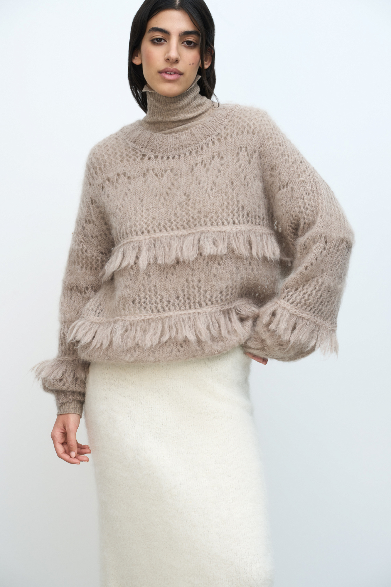 Ажурный джемпер с вывязанным узором и бахромой. Модель свободного силуэта со спущенной линией плеч и круглым вырезом горловины. Края изделия выполнены в рубчик.