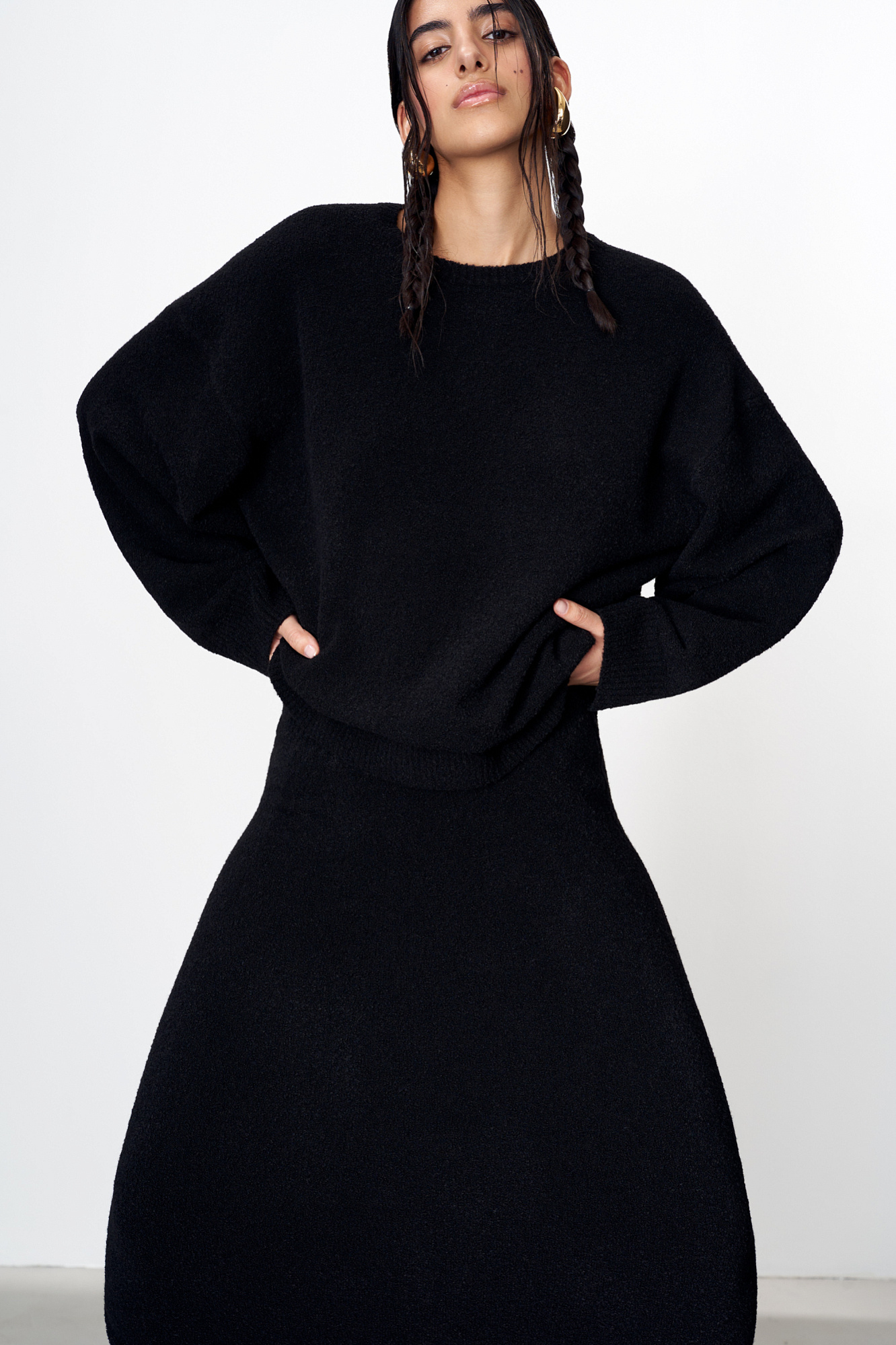 Трикотажный джемпер из смесовой шерсти со свободным силуэтом и спущенной линией плеча. Края изделия связаны в рубчик. Дополнить образ можно юбкой такого же стиля.