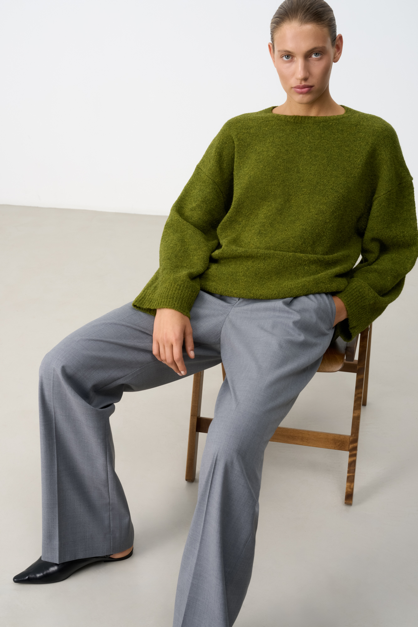 Трикотажный джемпер из смесовой шерсти со свободным силуэтом и спущенной линией плеча. Края изделия связаны в рубчик. Дополнить образ можно юбкой такого же стиля.
