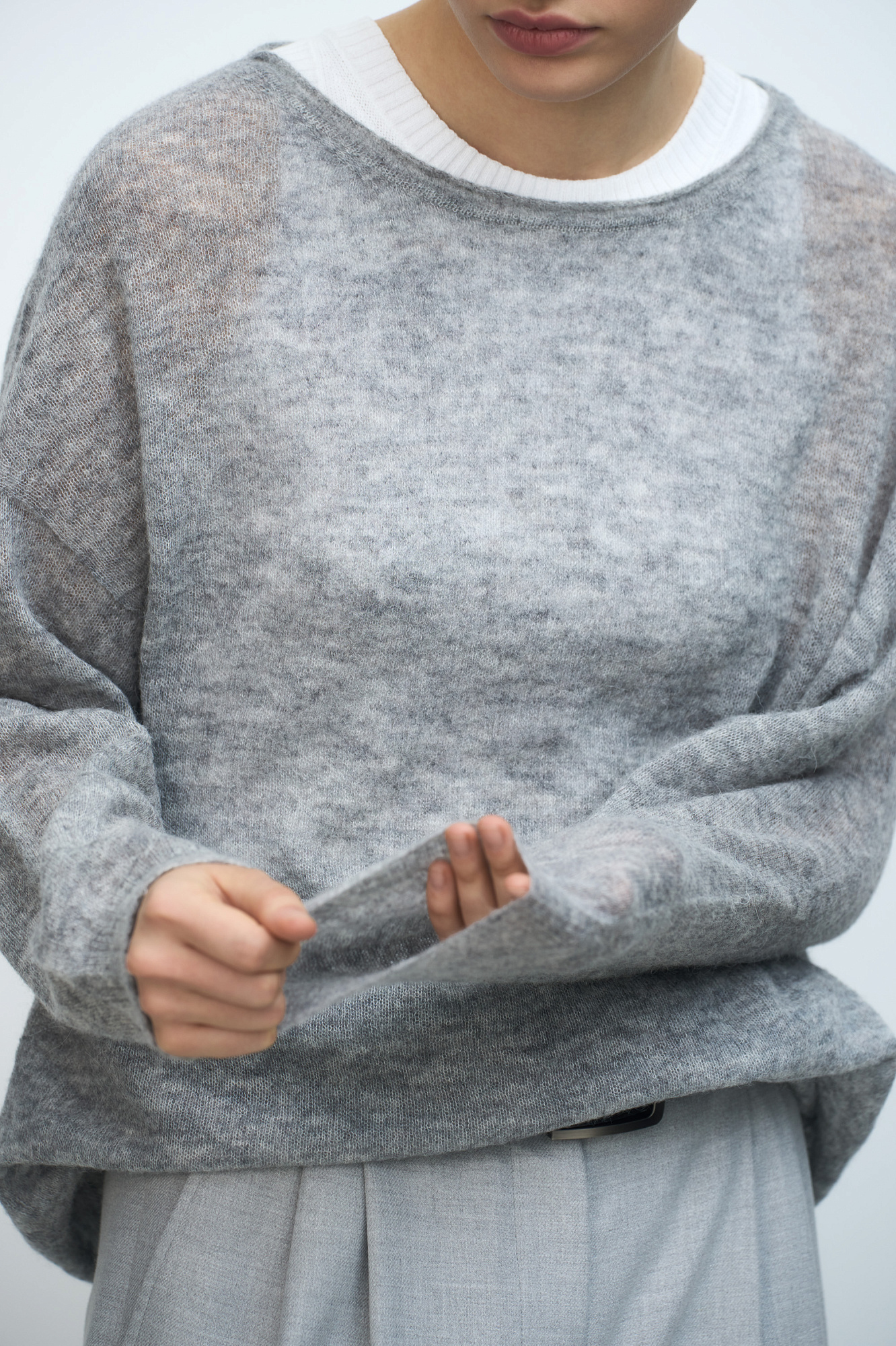 Длинный полупрозрачный трикотажный джемпер из мериносовой шерсти экстрафайн с добавлением шерсти альпака. Модель свободного силуэта, со спущенной линией плеч, длинными рукавами и неглубоким кгурлым вырезом горловины. Манжеты рукавов и низ изделия выполнены в рубчик.