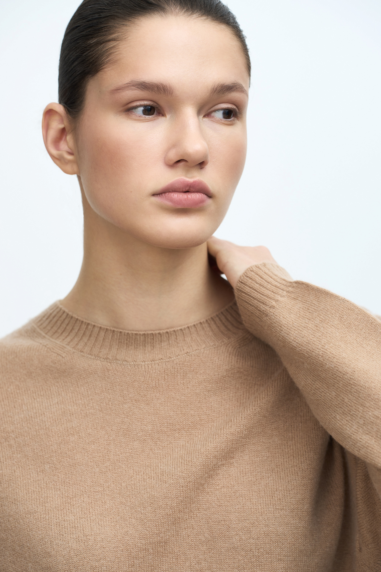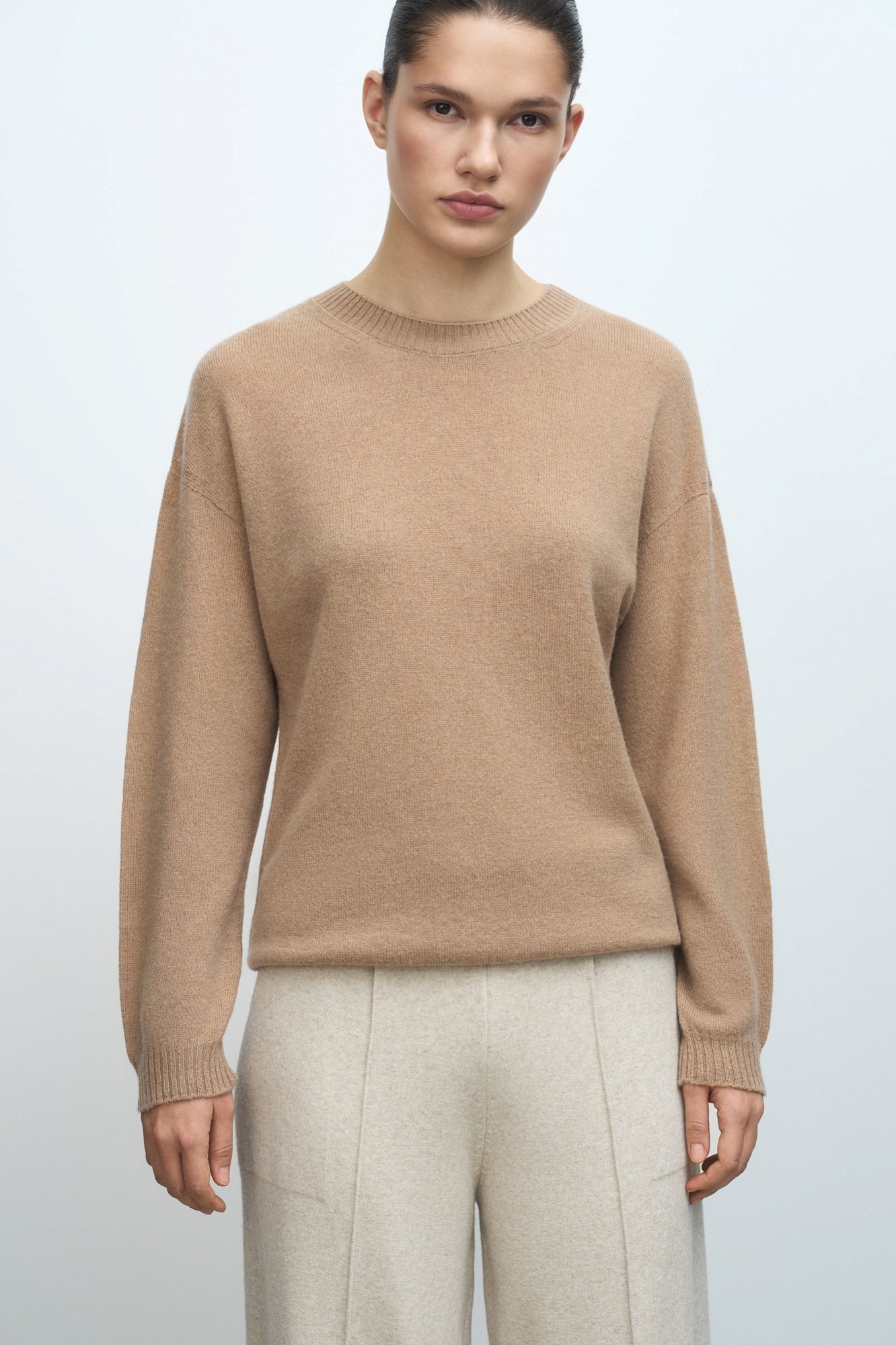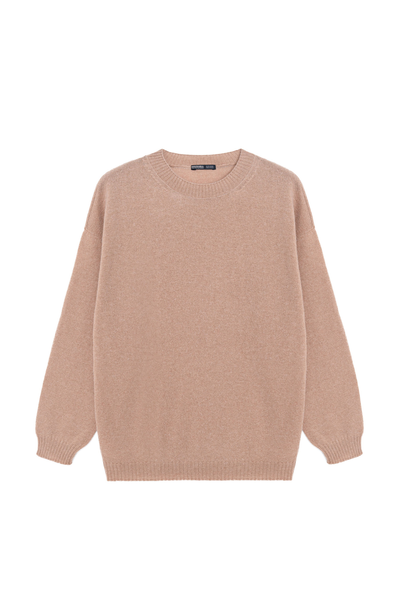 Трикотажный джемпер из 100% кашемира. Модель свободного силуэта со спущенной линией плеча и круглым вырезом горловины. Края изделия выполнены в рубчик.