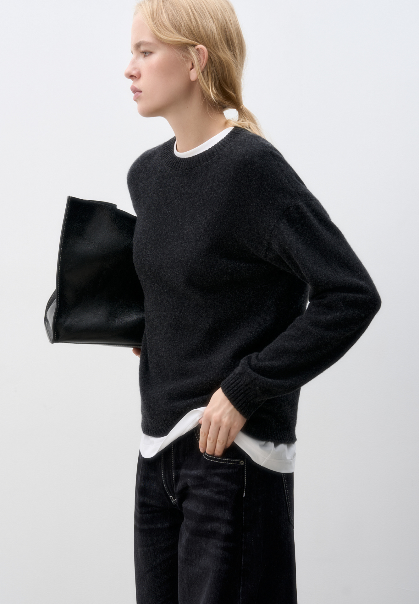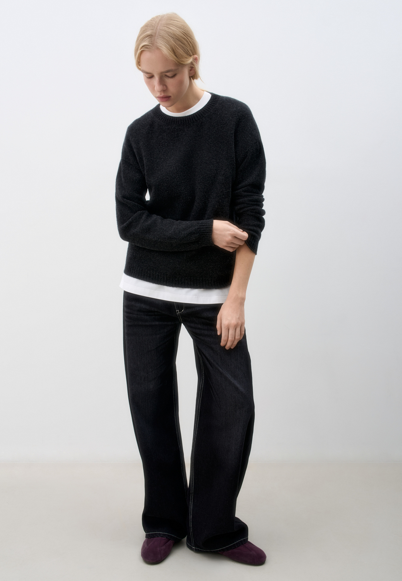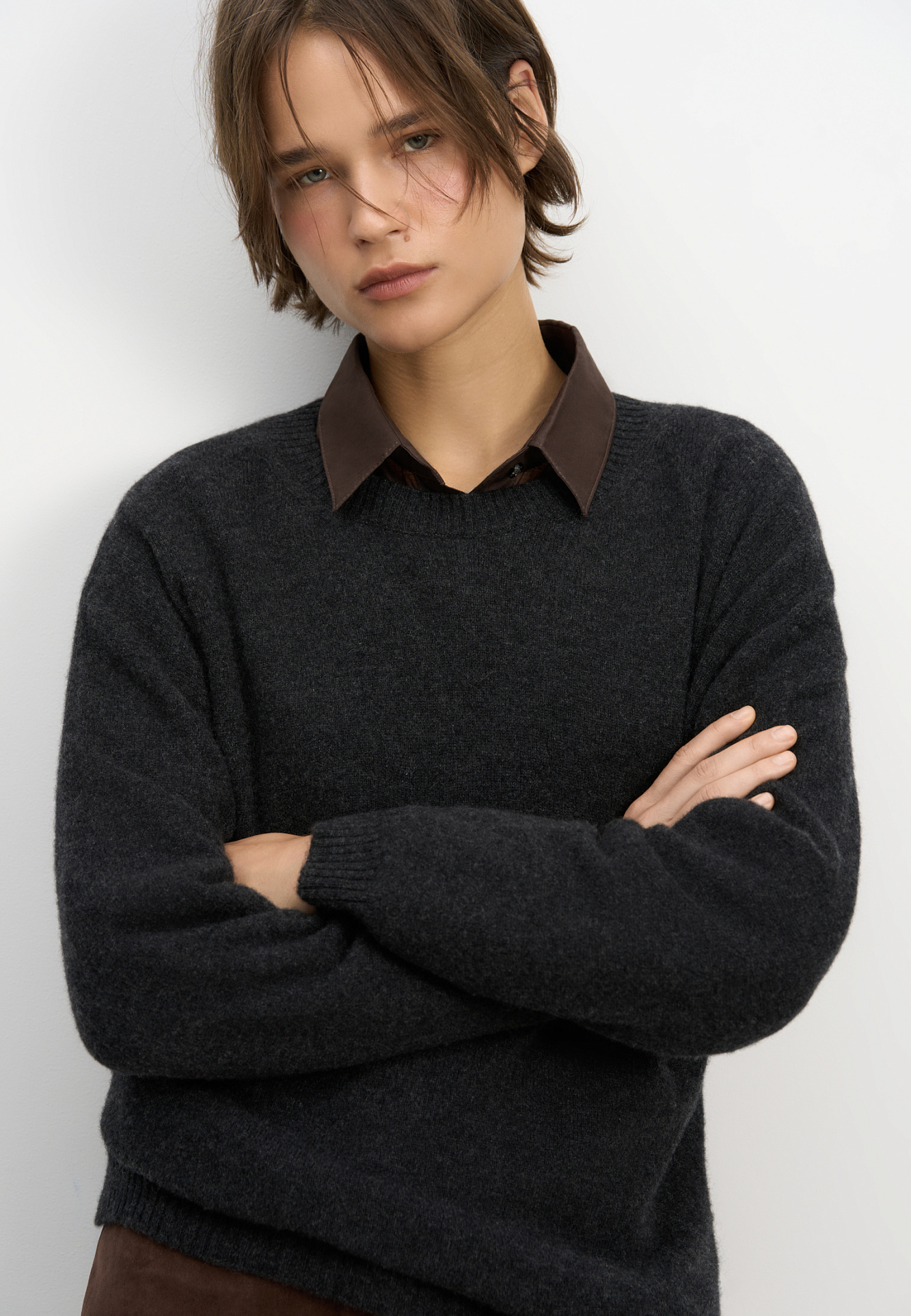Трикотажный джемпер из 100% кашемира. Модель свободного силуэта со спущенной линией плеча и круглым вырезом горловины. Края изделия выполнены в рубчик.