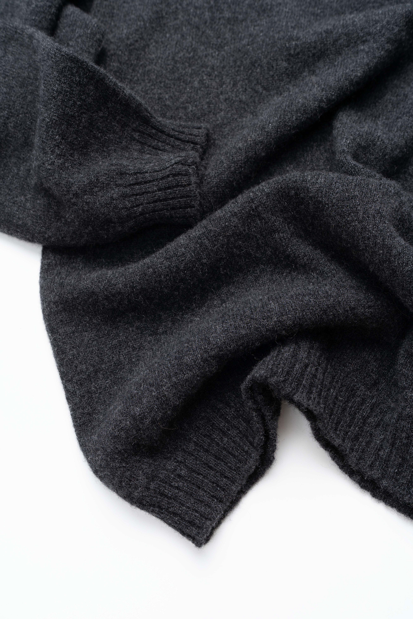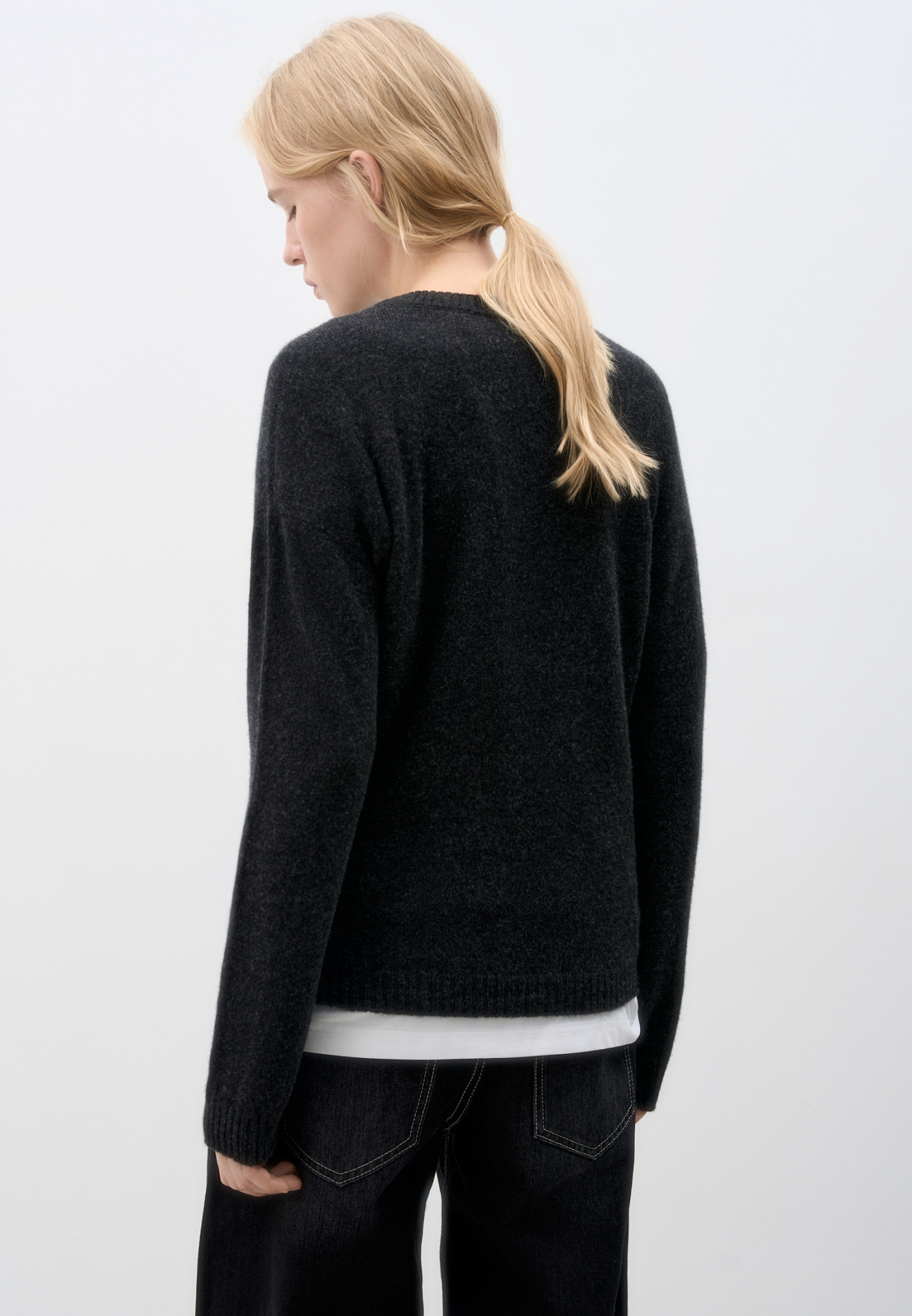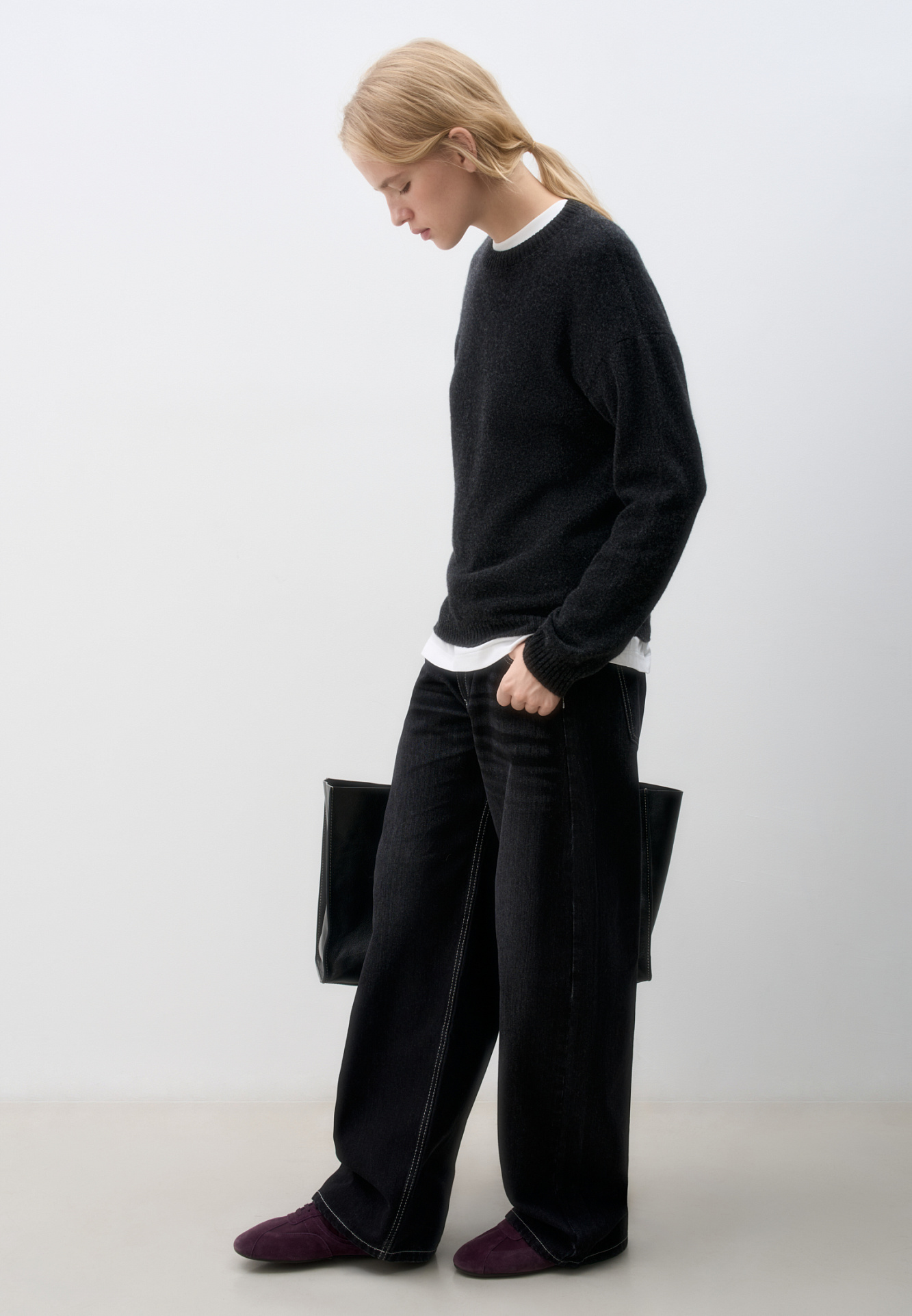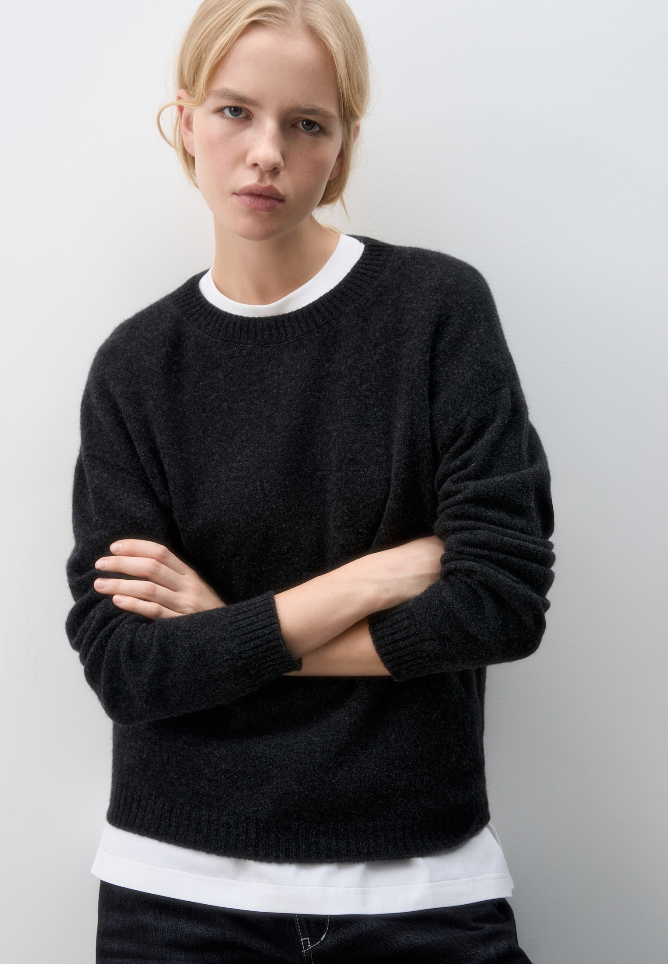 Трикотажный джемпер из 100% кашемира. Модель свободного силуэта со спущенной линией плеча и круглым вырезом горловины. Края изделия выполнены в рубчик.