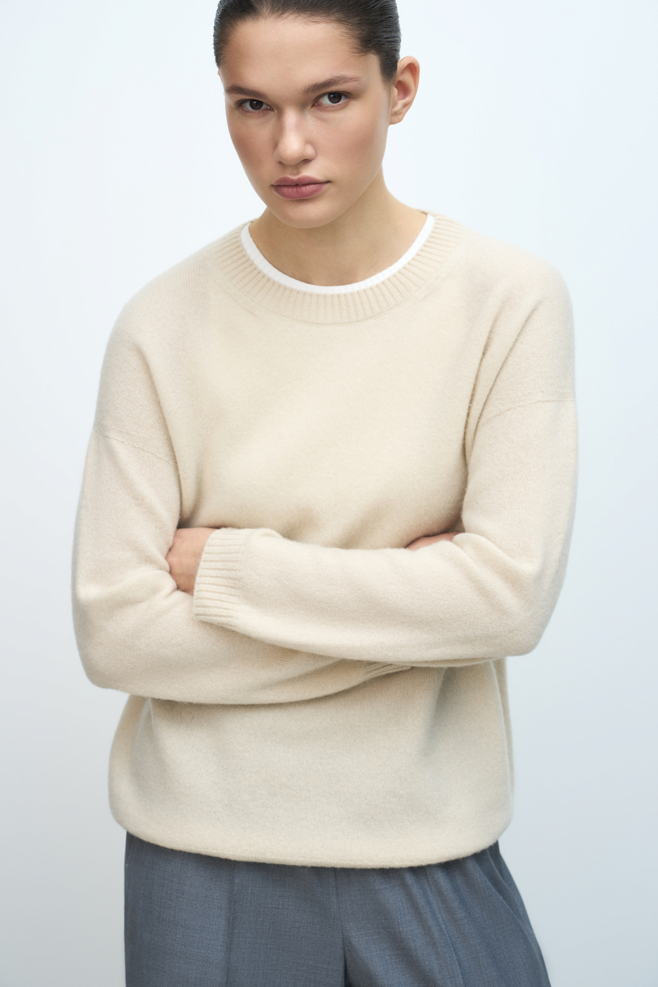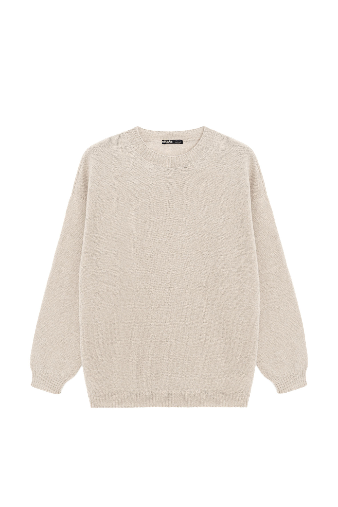 Трикотажный джемпер из 100% кашемира. Модель свободного силуэта со спущенной линией плеча и круглым вырезом горловины. Края изделия выполнены в рубчик.