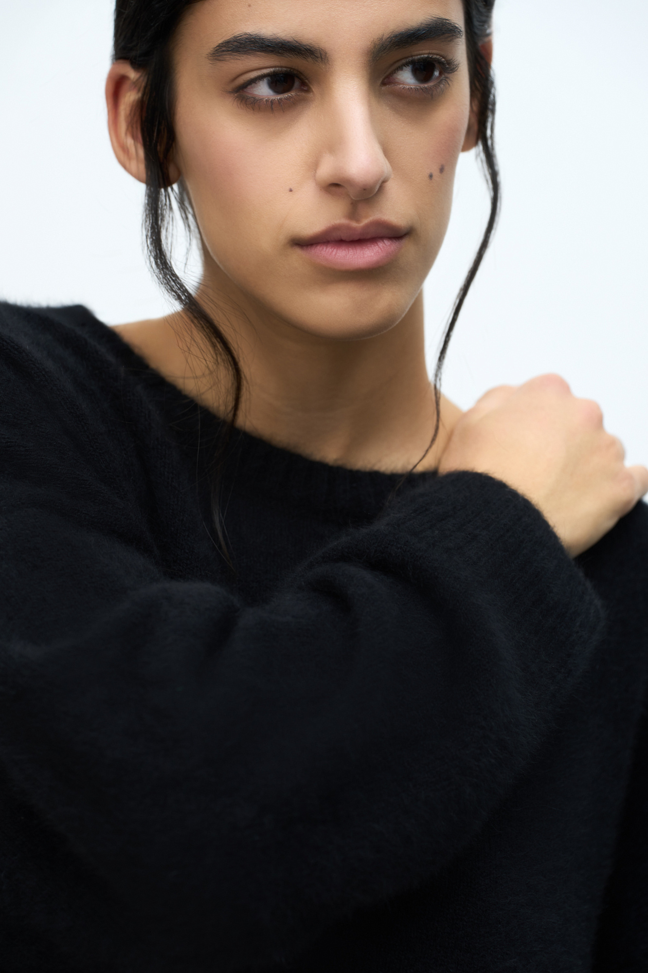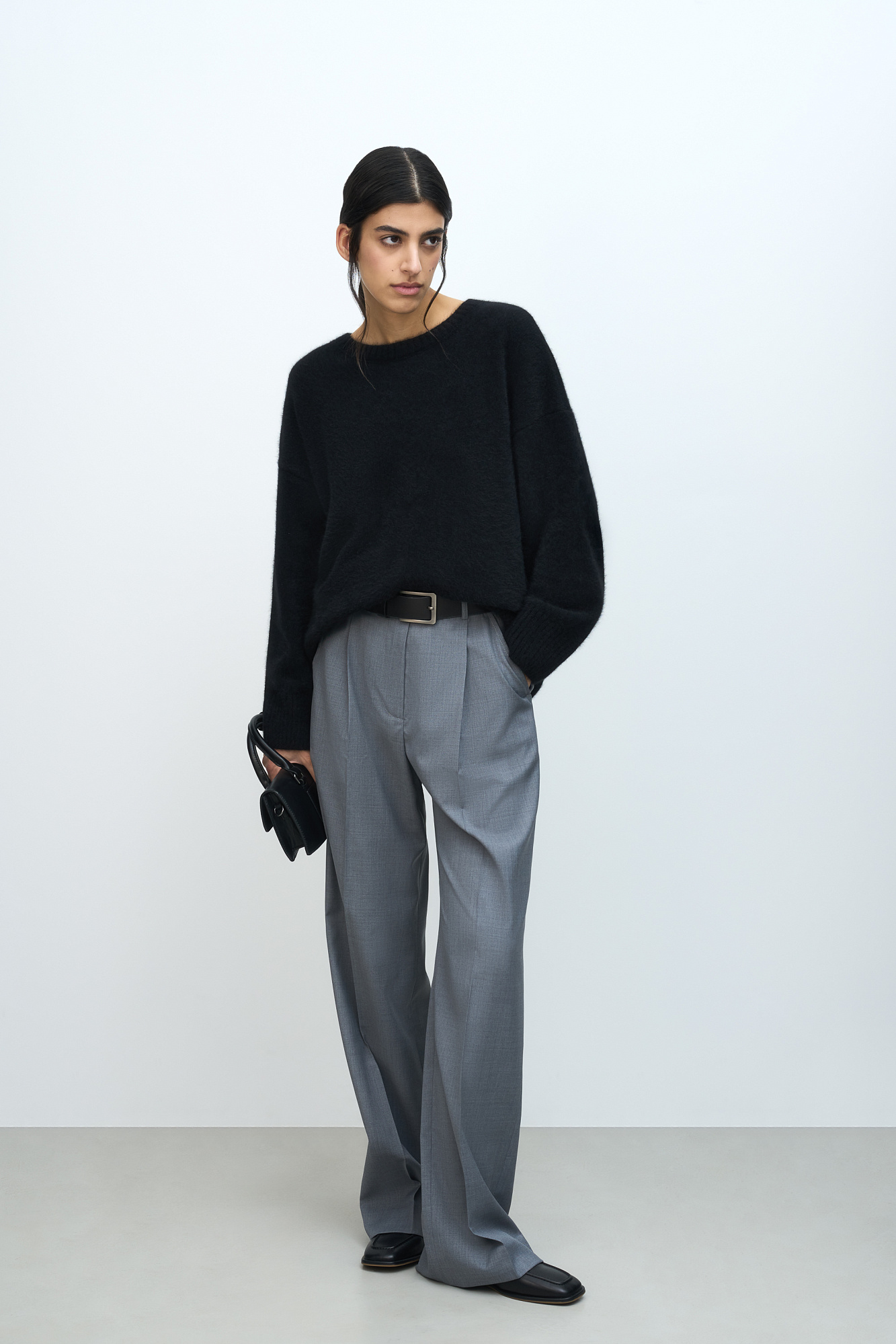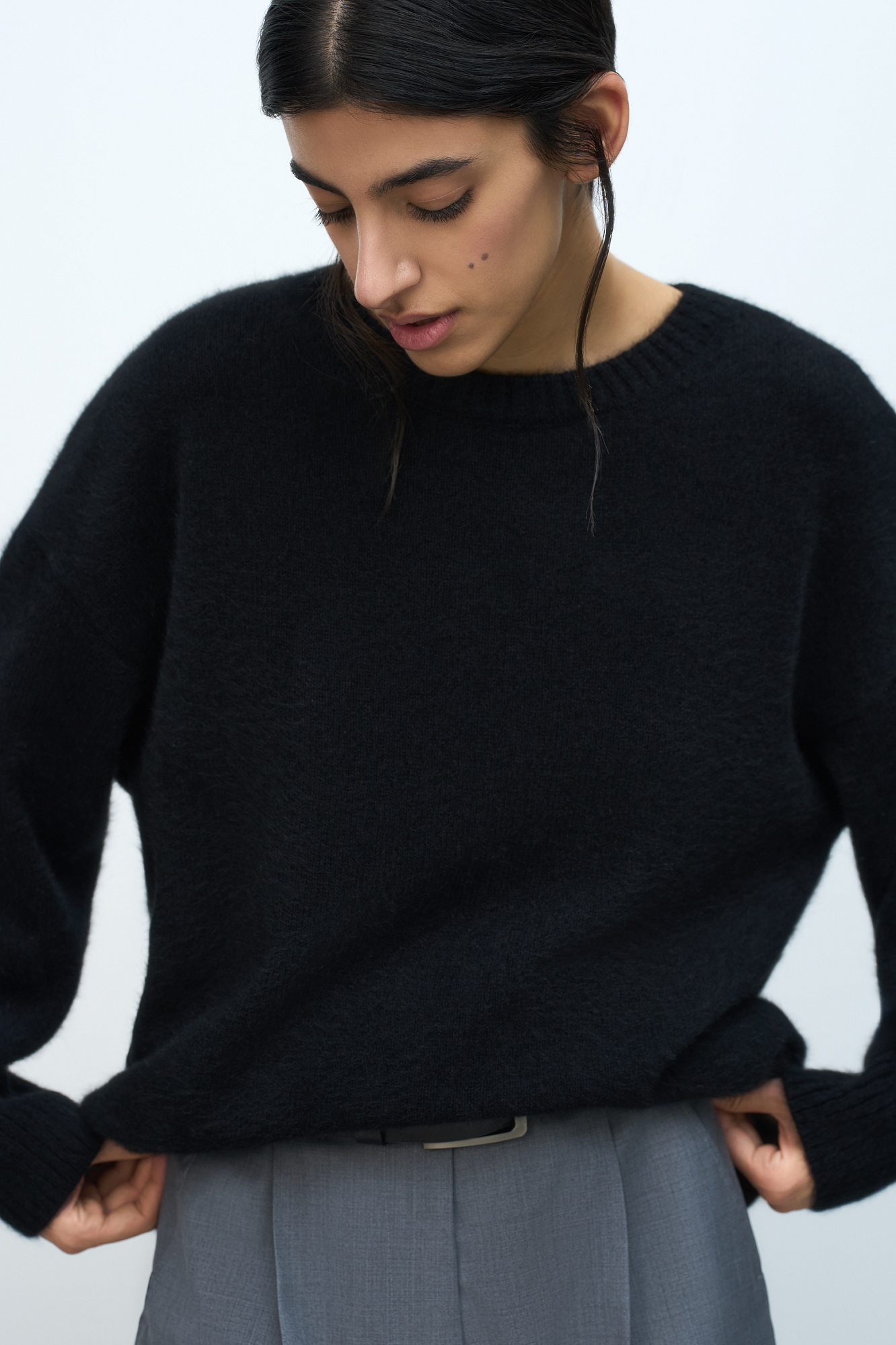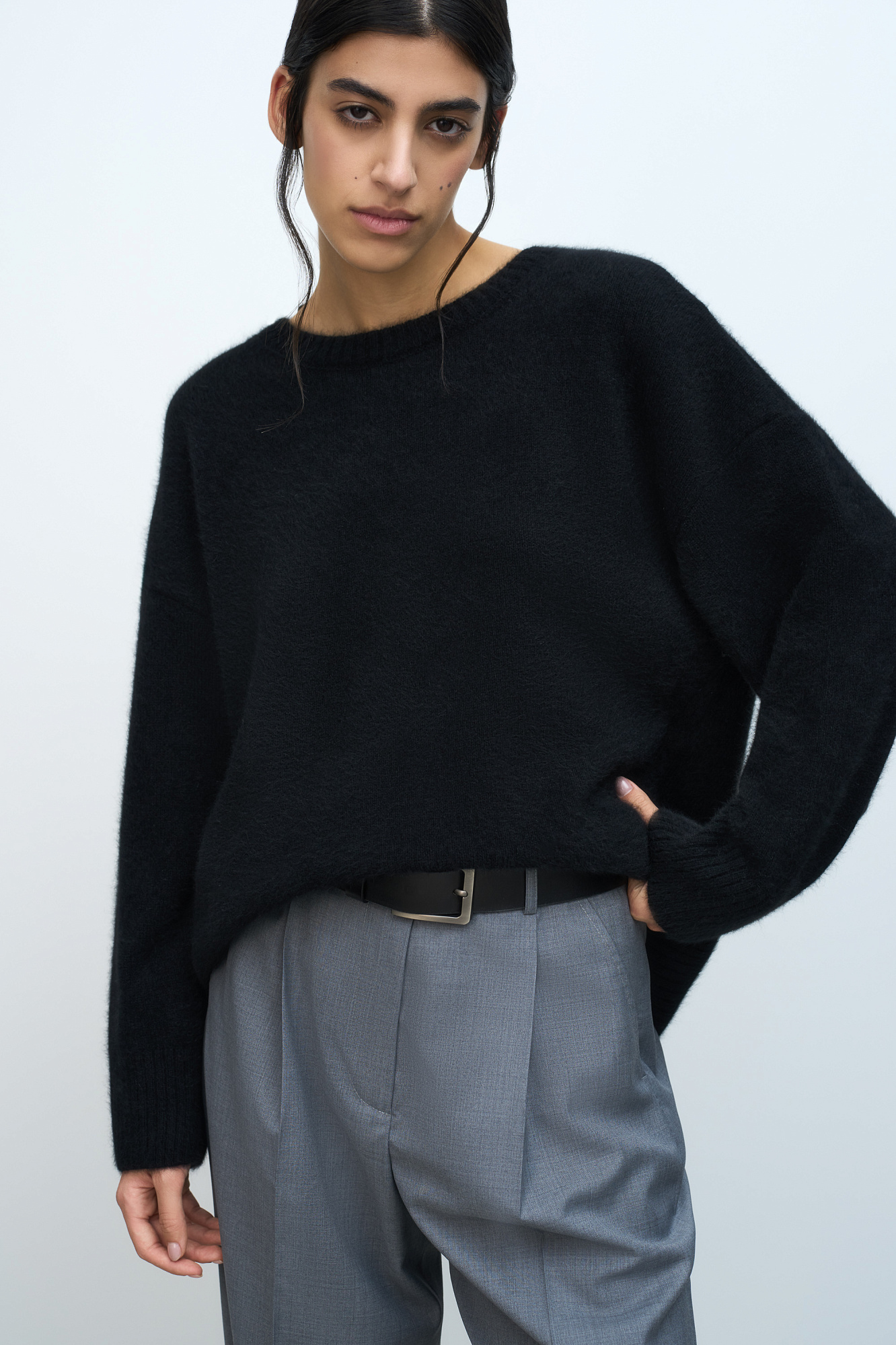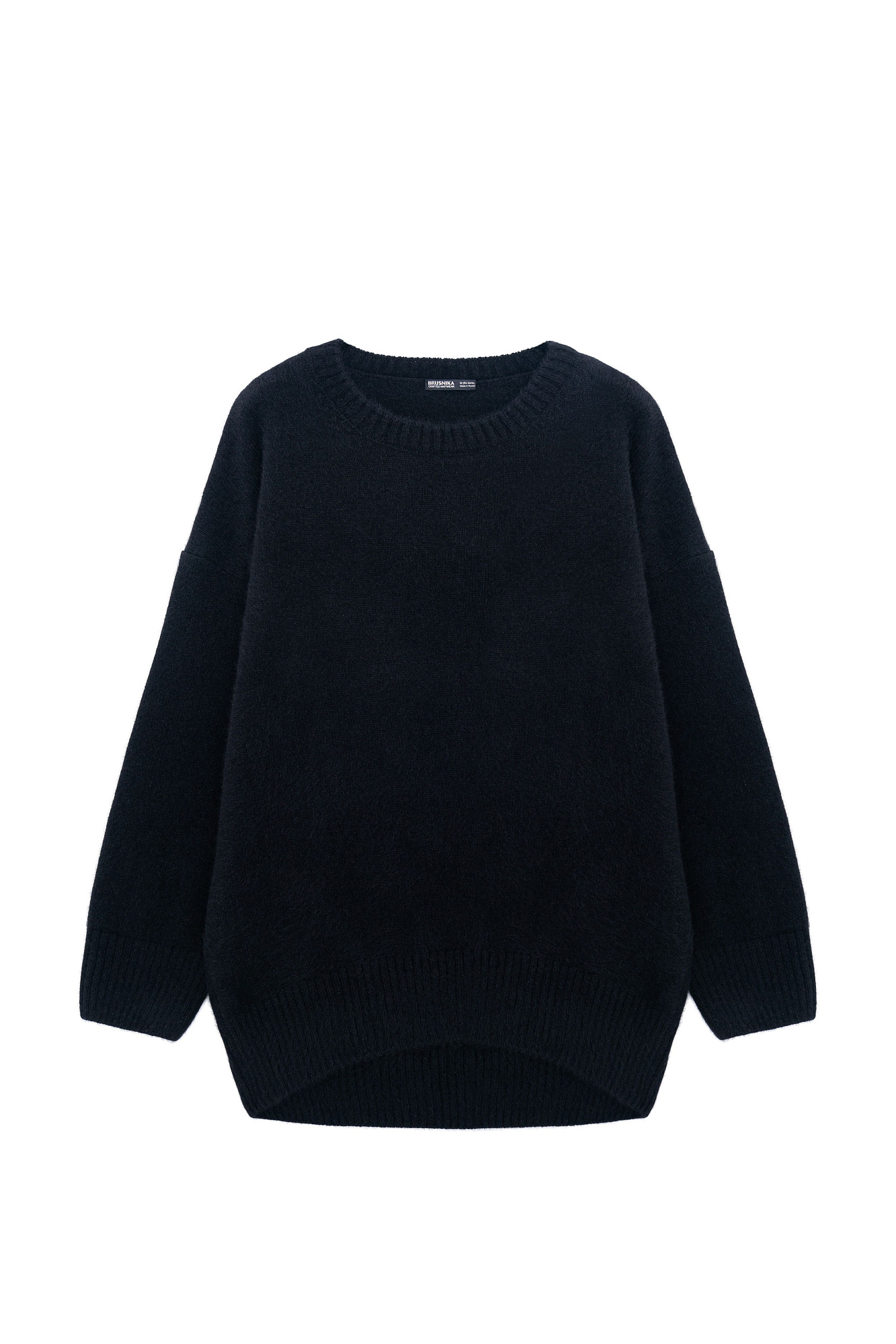 Трикотажный джемпер из пуха лисы и шелка. Модель свободного силуэта со спущенной линией плеч и круглым вырезом горловины. Края изделия выполнены в рубчик.