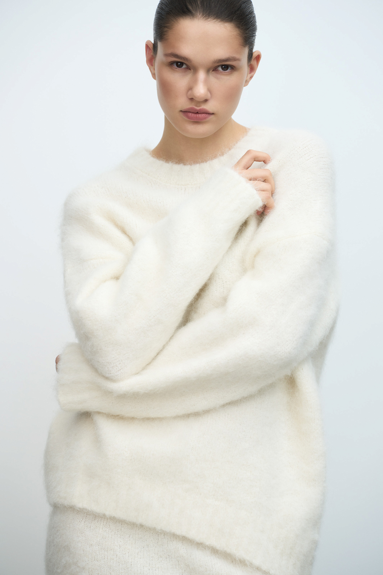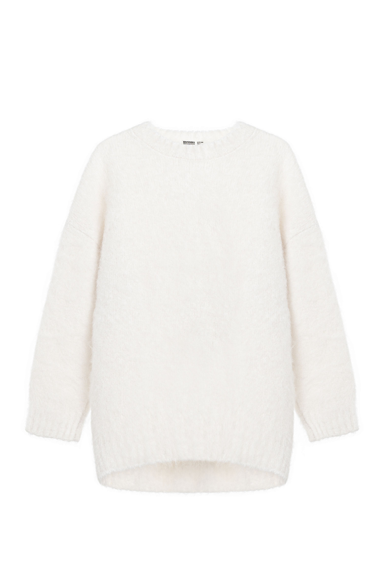 Трикотажный джемпер из пушистой пряжи на основе шерсти альпака. Модель свободного силуэта со спущенной линией плеча. Края изделия в рубчик.