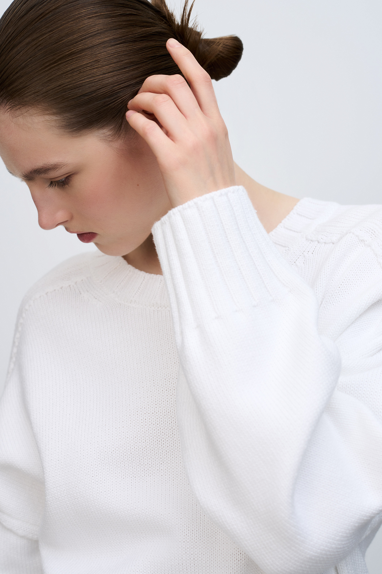 Трикотажный джемпер из 100% хлопка. Модель свободного силуэта со спущенной линией плеча и удлиненной спинкой.