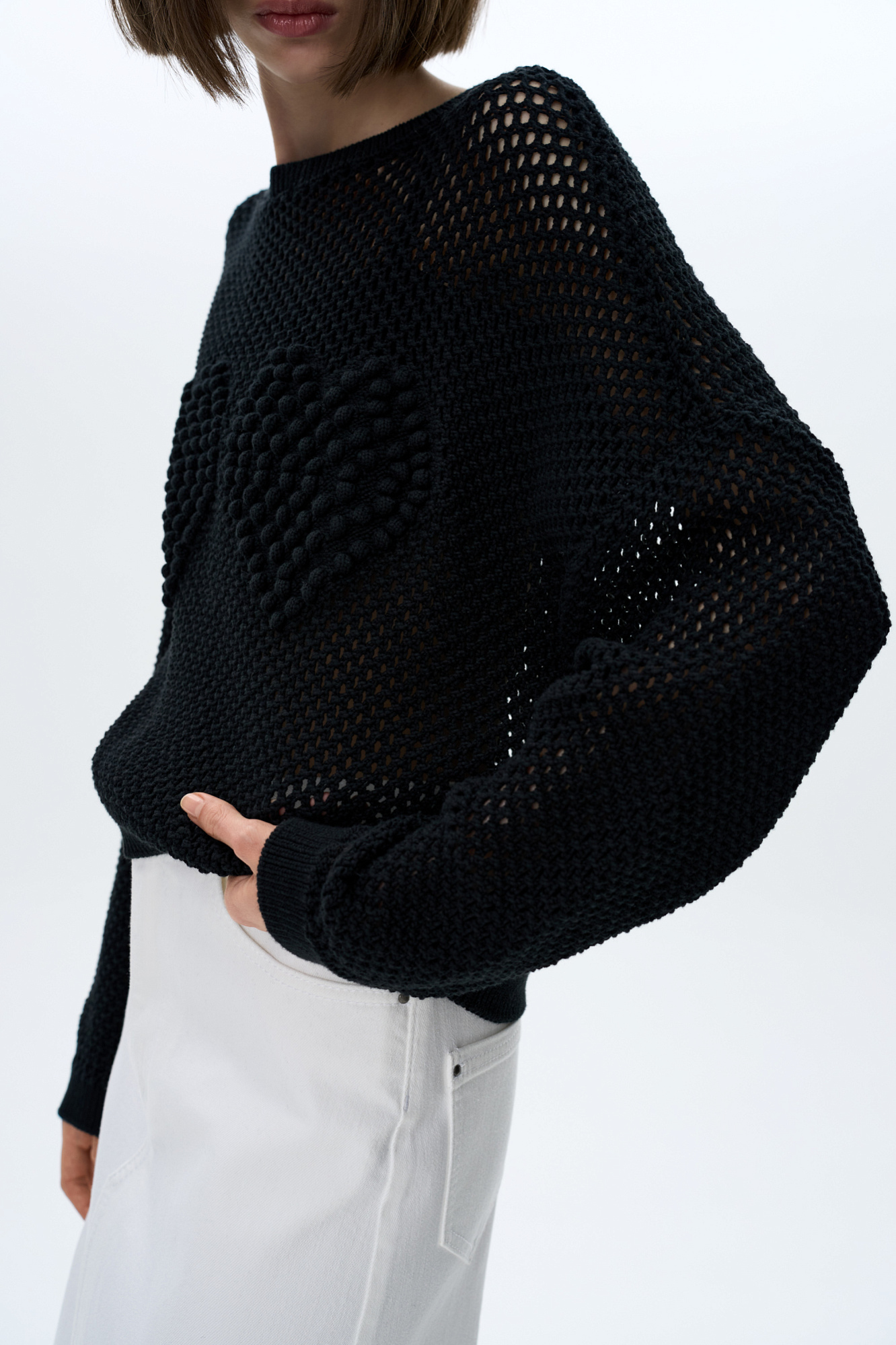 Трикотажный джемпер из хлопка. Модель свободного силуэта со спущенной линией плеча и круглым вырезом горловины. Изделие декорировано объемным орнаментом в виде двух сердец на груди.